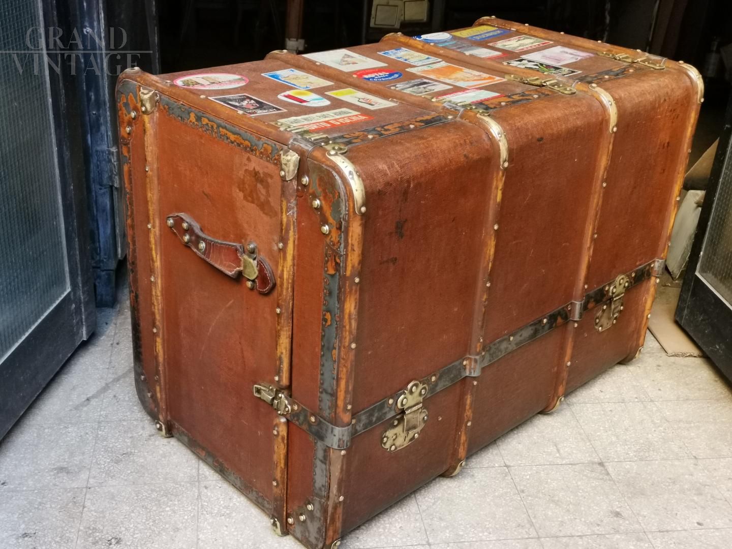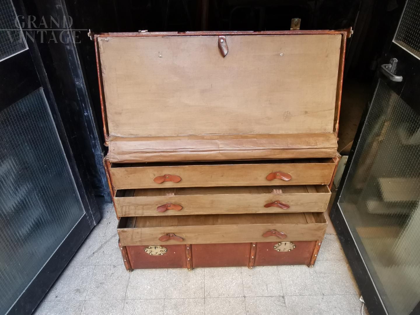 Questo affascinante, rarissimo baule da viaggio con etichette originali è dagli anni ’30 ed é italiano. Una volta aperto svela il suo tesoro: 4 cassetti in tessuto più uno grande finale e nella parte superiore un cassetto estraibile che, incastrato grazie alle apposite bacchette, si trasforma in un ripiano per disporre camicie e magliette. È in condizioni perfette, con tessuti, pelle, maniglie e chiusure perfettamente intatte.