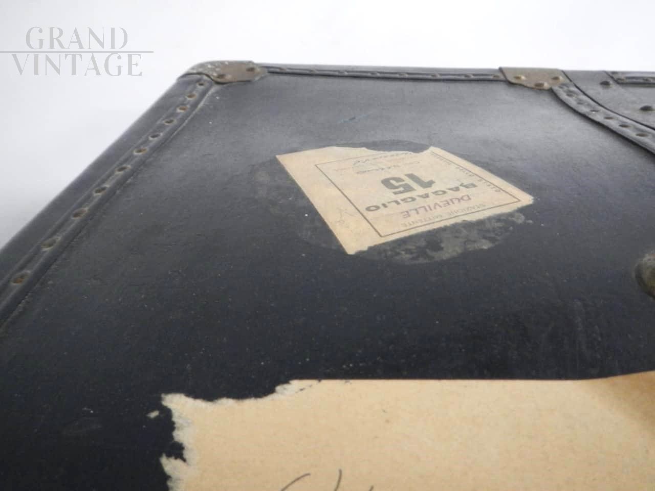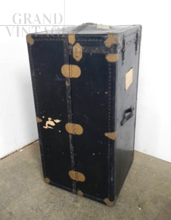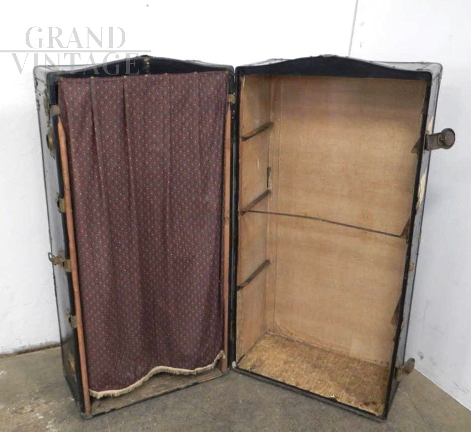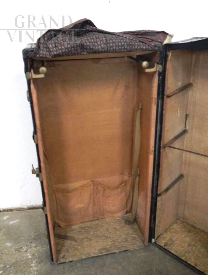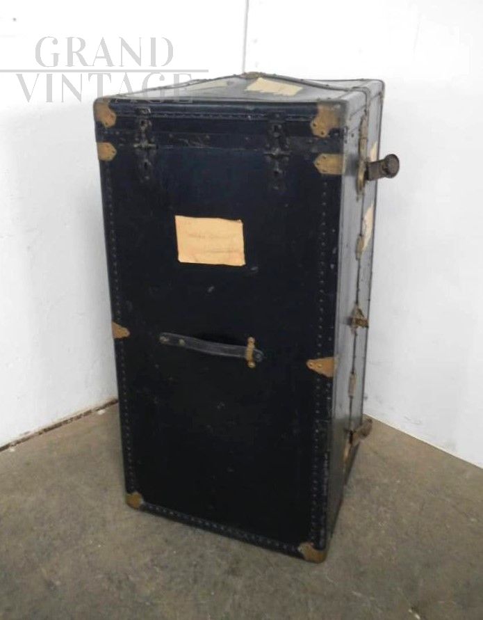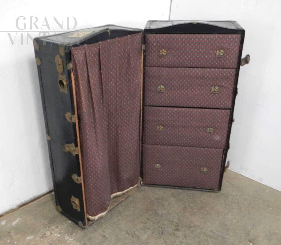 Baule da viaggio portavestiti vintage in legno compresso con rivestimento in cartone, completo di 4 cassetti interni e vano con 5 appendini in legno, apribile nella parte superiore. I cassetti sono rivestiti in tessuto e le chiusure sono in metallo. Le serrature sono difettose e non permetteno la chiusura totale del baule. Mancano le chiavi.