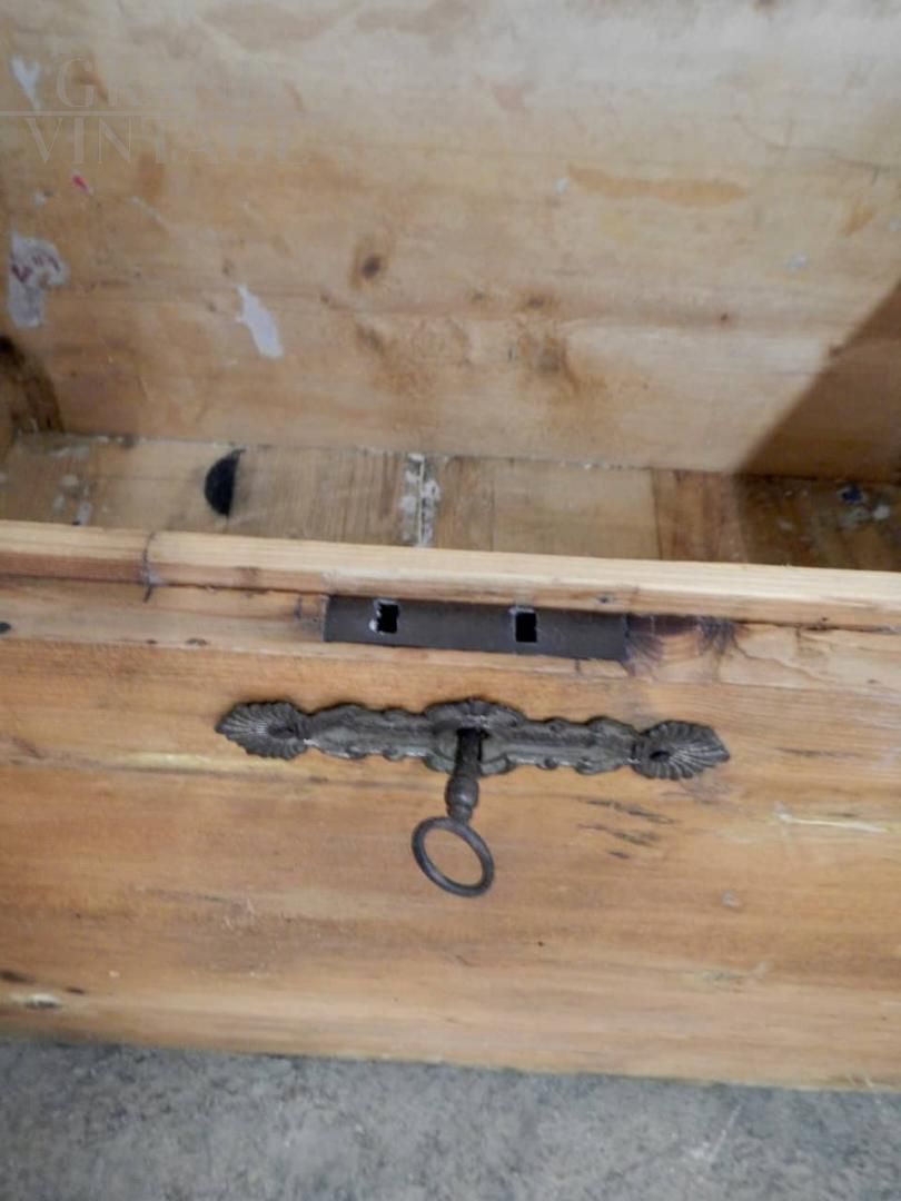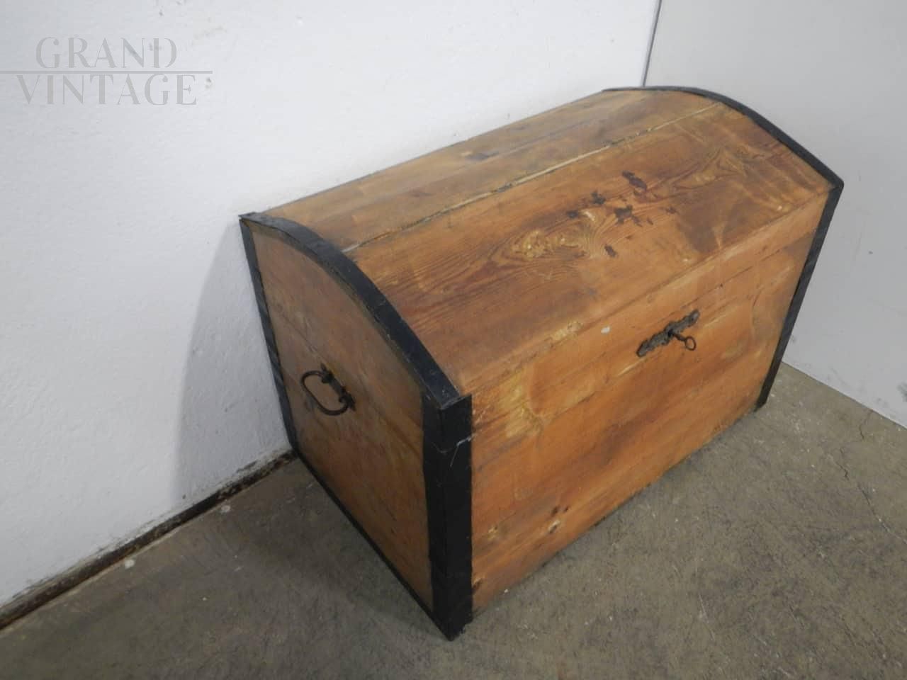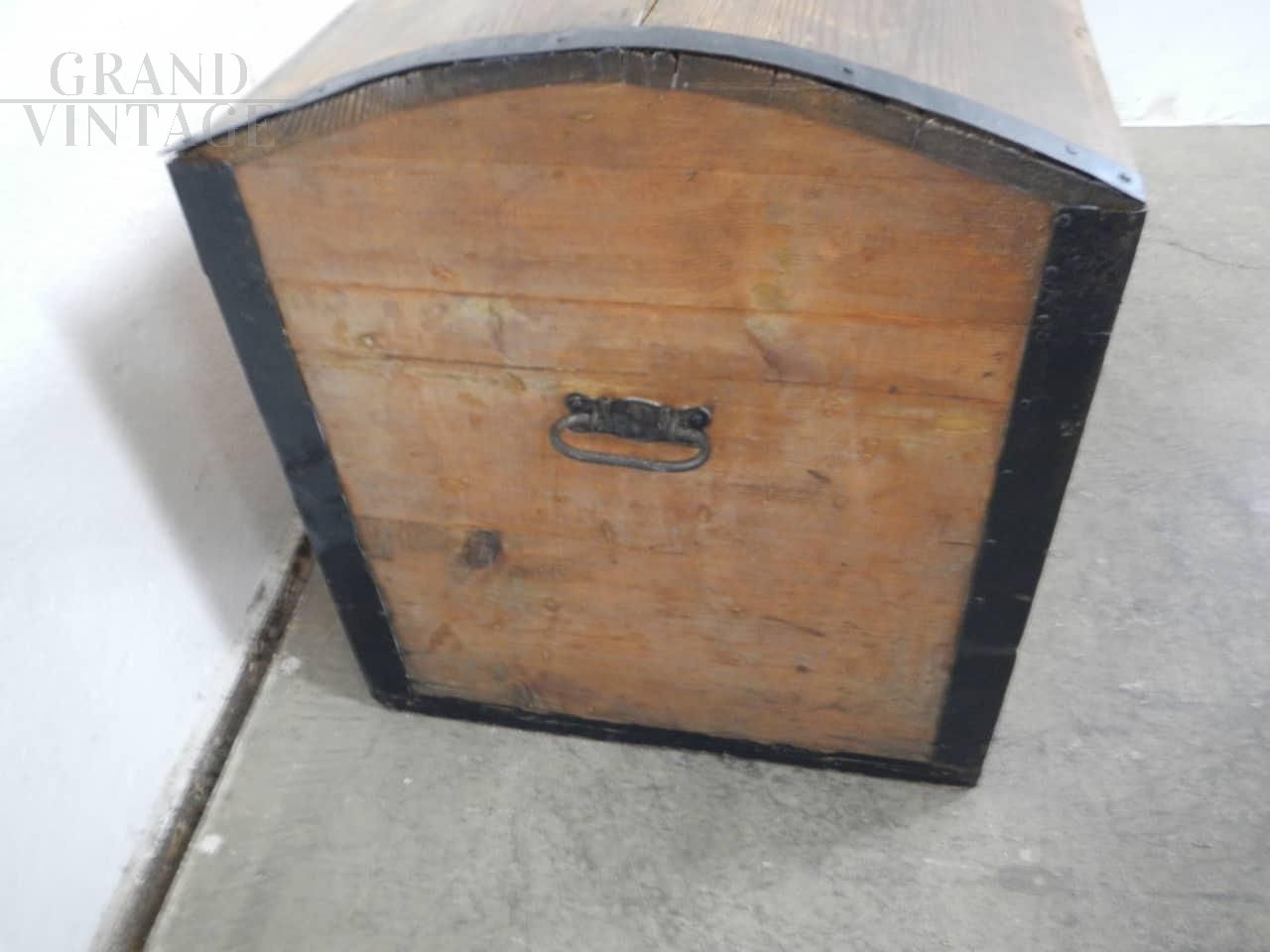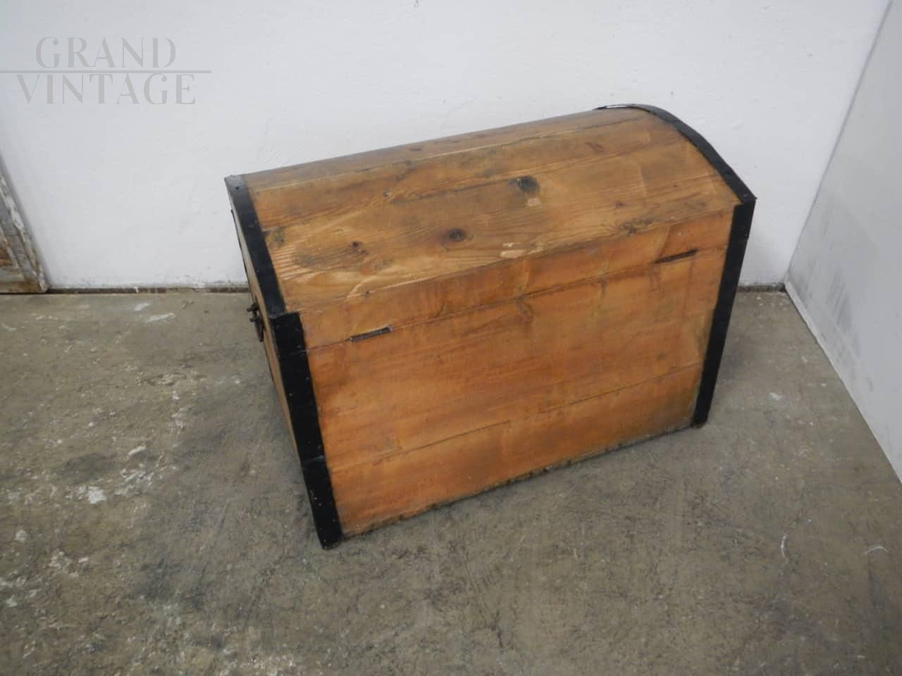 Baule vintage in legno di abete con coperchio bombato e bordi rinforzati in ferro laccato nero, completo di chiave funzionante. In ottime condizioni.