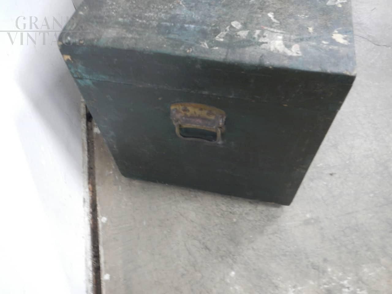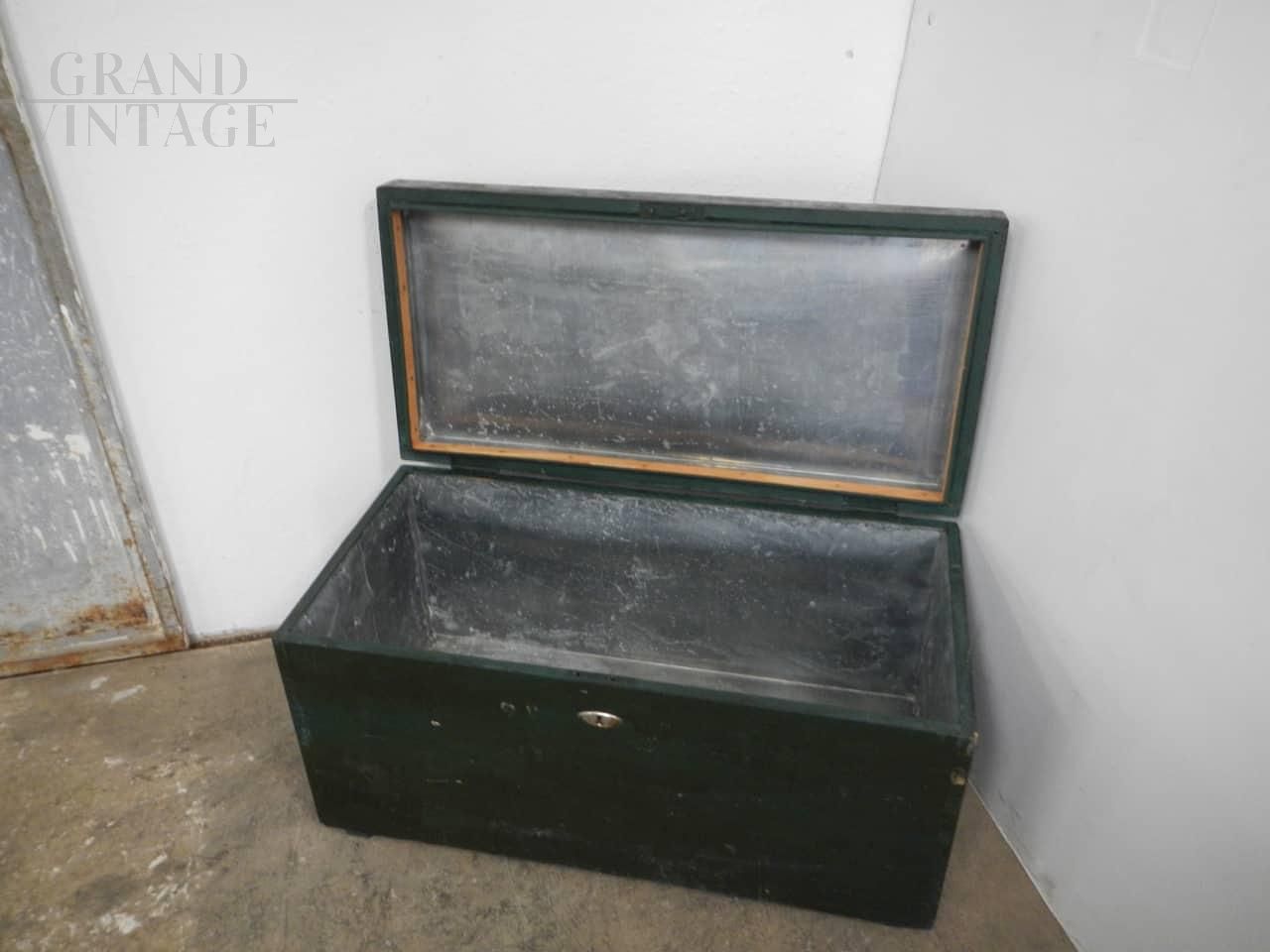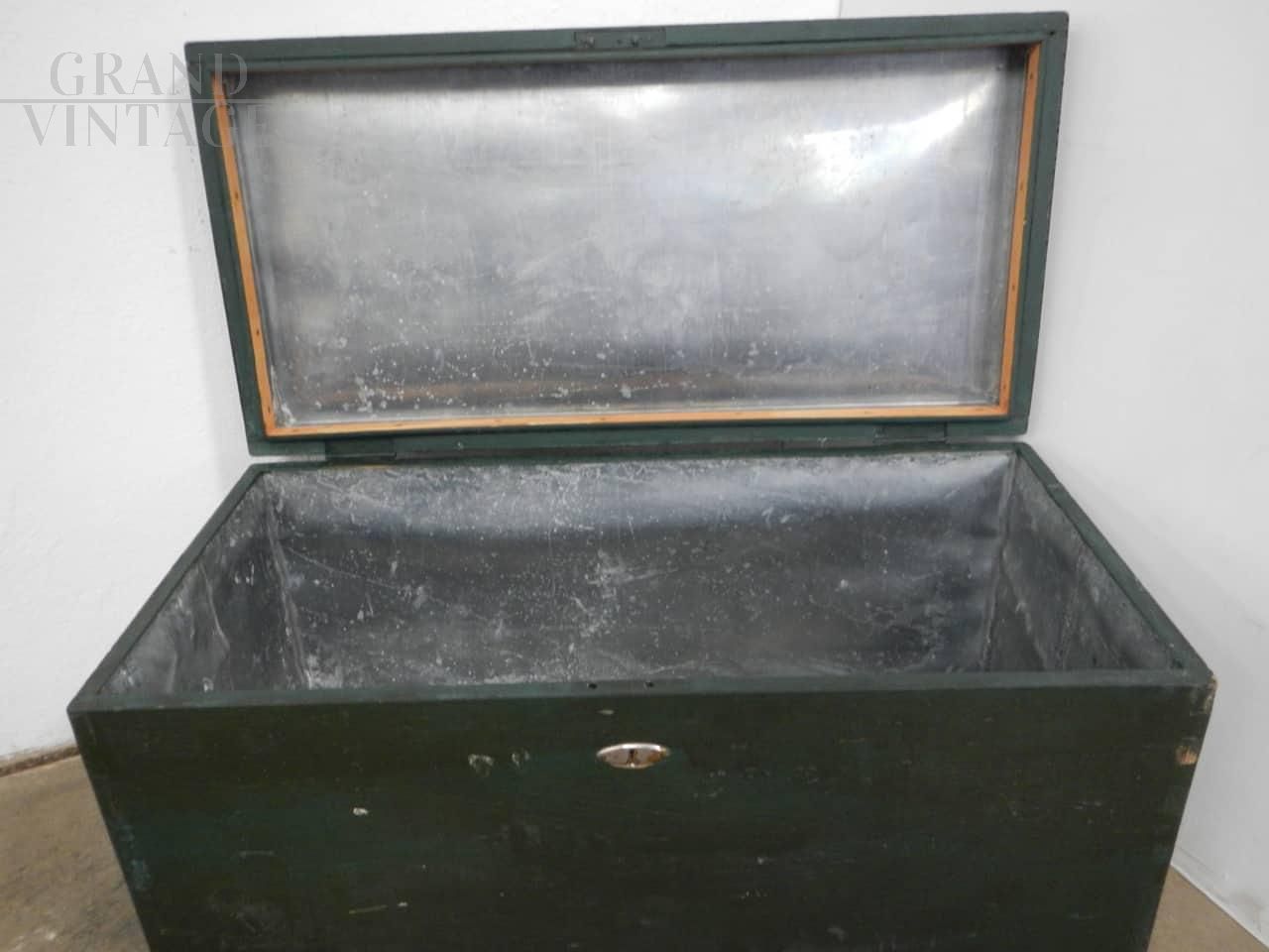 Baule vintage anni '40 in legno di abete con rivestimento interno in lamiera di acciaio, utilizzabile anche come ghiacciaia. I segni che si notano sul coperchio sono residui di carta incollata. In buone condizioni, sprovvisto di chiave.