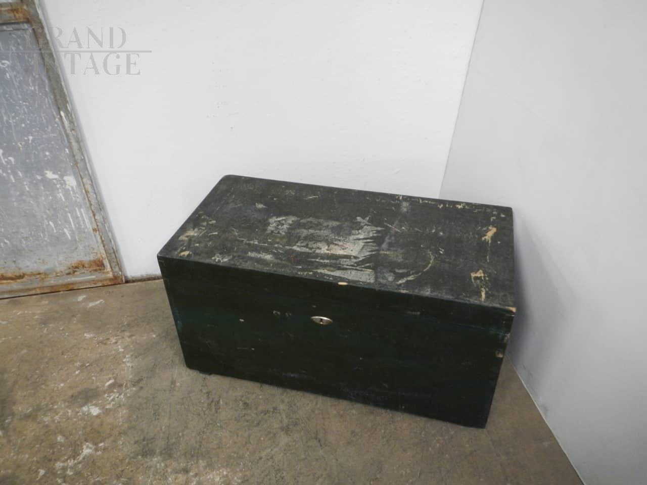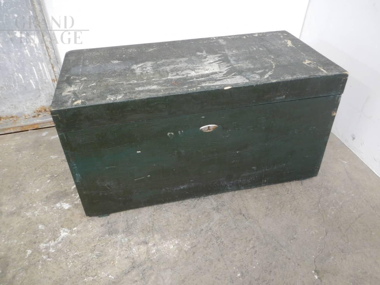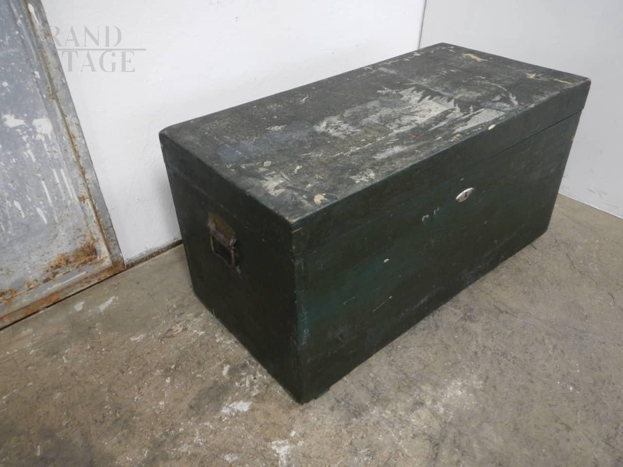 Baule vintage anni '40 in legno di abete con rivestimento interno in lamiera di acciaio, utilizzabile anche come ghiacciaia. I segni che si notano sul coperchio sono residui di carta incollata. In buone condizioni, sprovvisto di chiave.