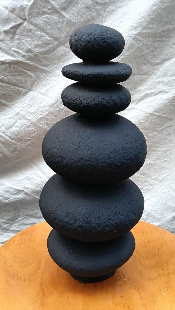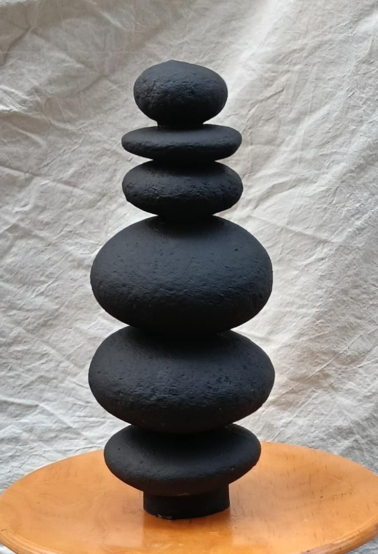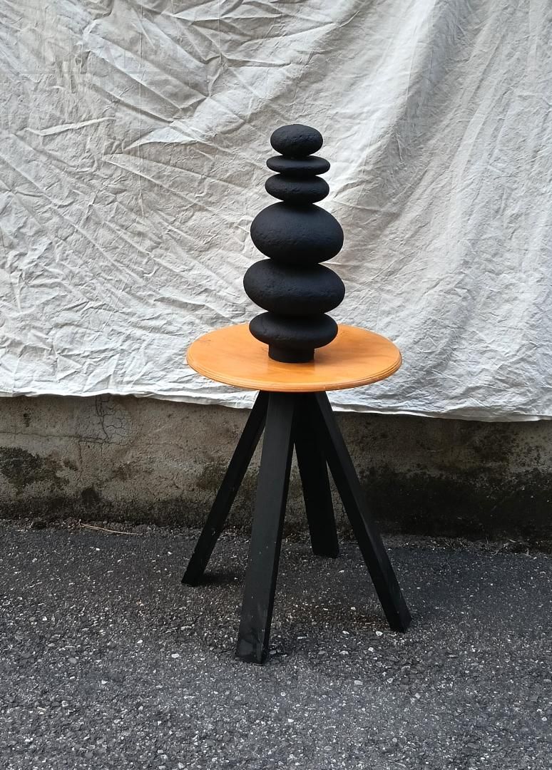Black stones, composizione dell'artista Valter Berni realizzata negli anni '90 con pietre tonde sovrapposte e dipinte su una base ad anello. Peso 5 kg, altezza 40 cm.