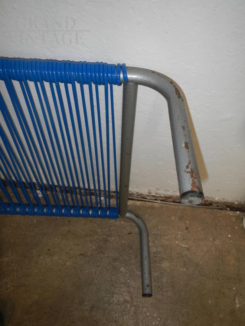 Piccola branda da bimbo vintage con struttura in metallo e seduta in corda di plastica blu, anni '70.