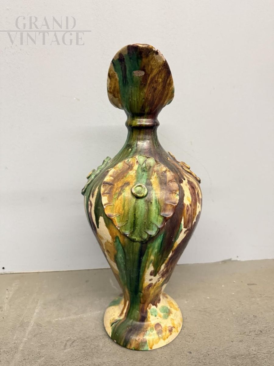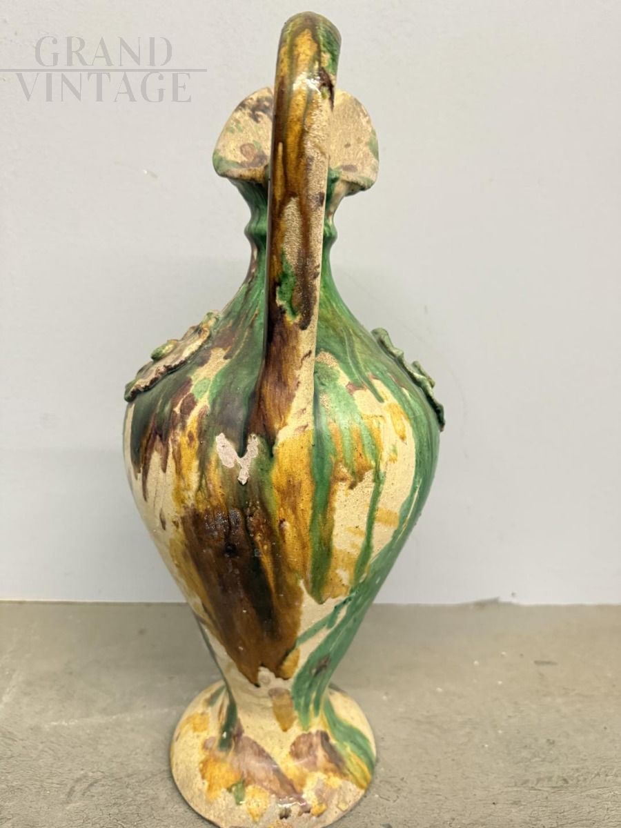 Brocca antica in maiolica dei primi del '900, di produzione popolare, dipinta nel sud Italia nei colori verde, giallo e marrone. Buono lo stato generale.
