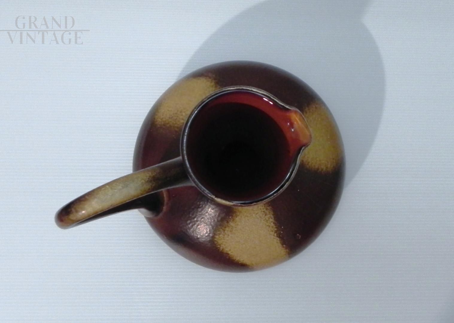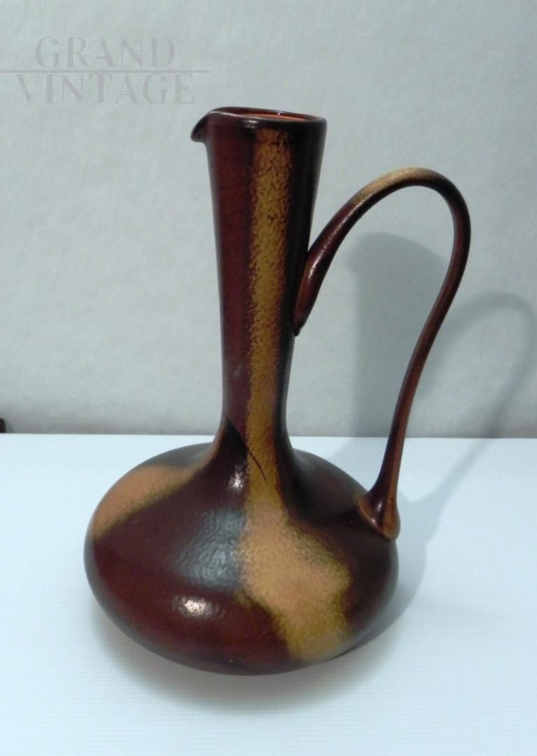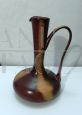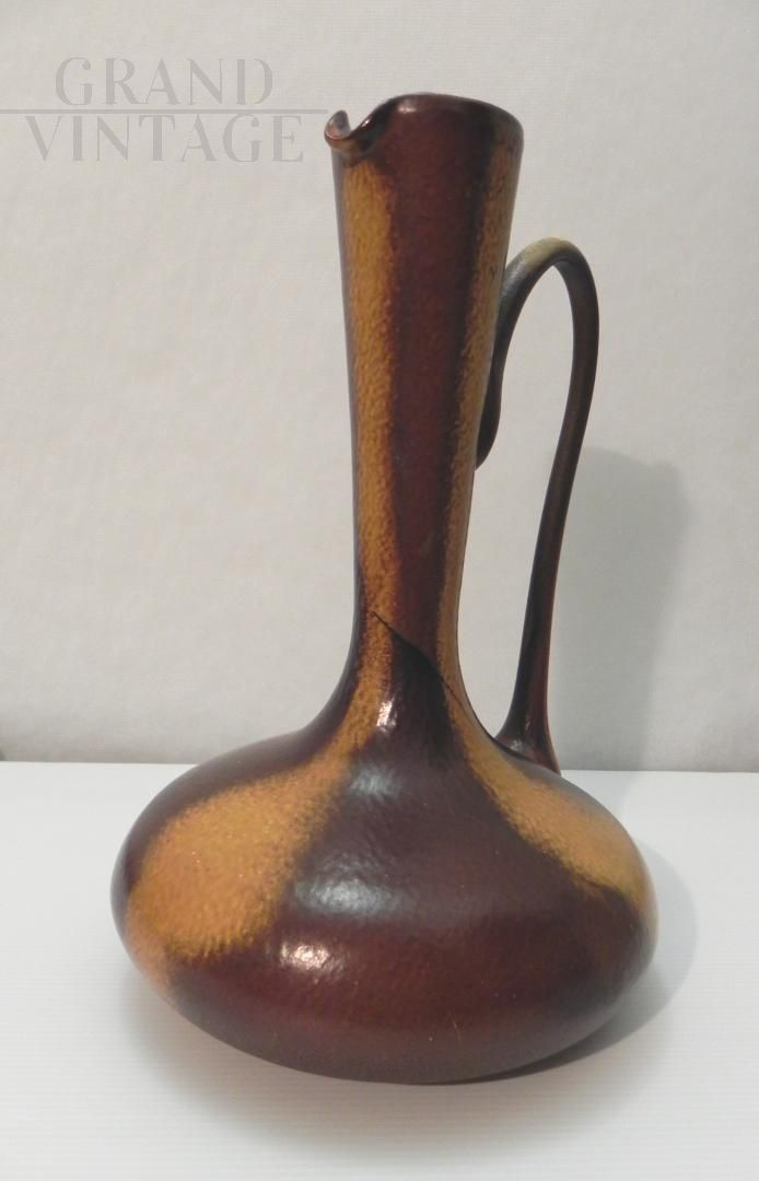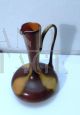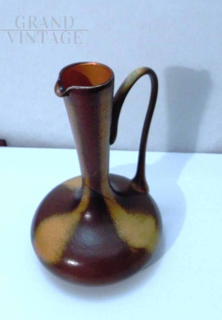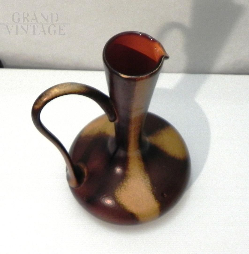 Brocca in vetro vintage anni '70 ispirata allo stile di Gunnar Nylund per Rorstrand, il vetro è smaltato a mano in colore marrone con sfumature. Il manico nella parte superiore presenta una crepa incollata, visibile nelle foto. Non ci sono loghi o marchi. Il pezzo risale agli anni '60 / '70.