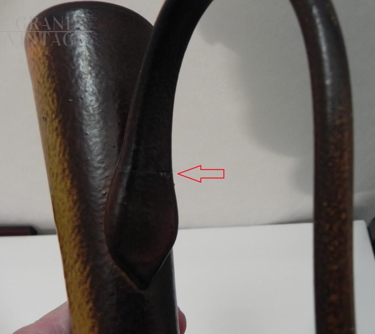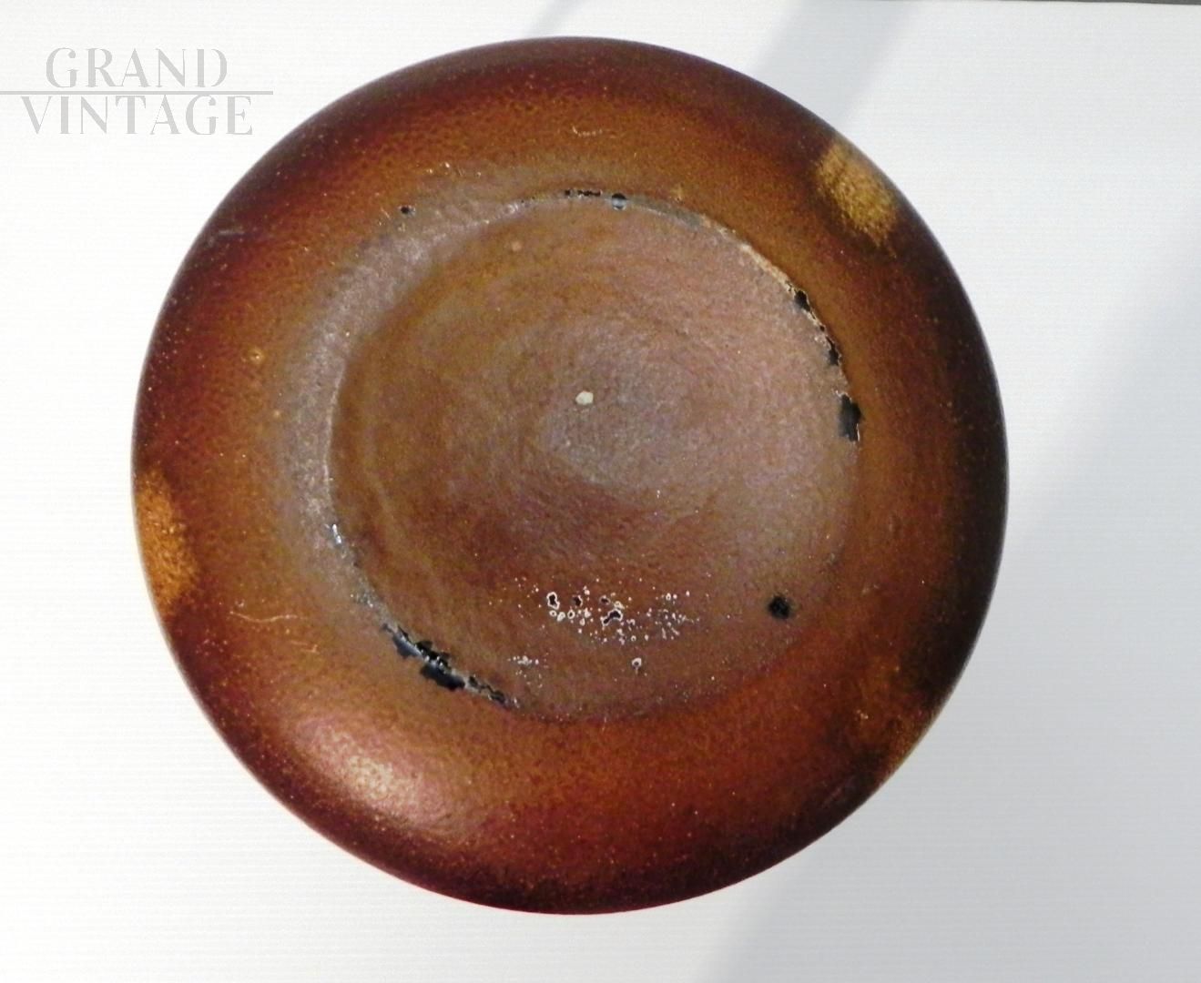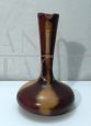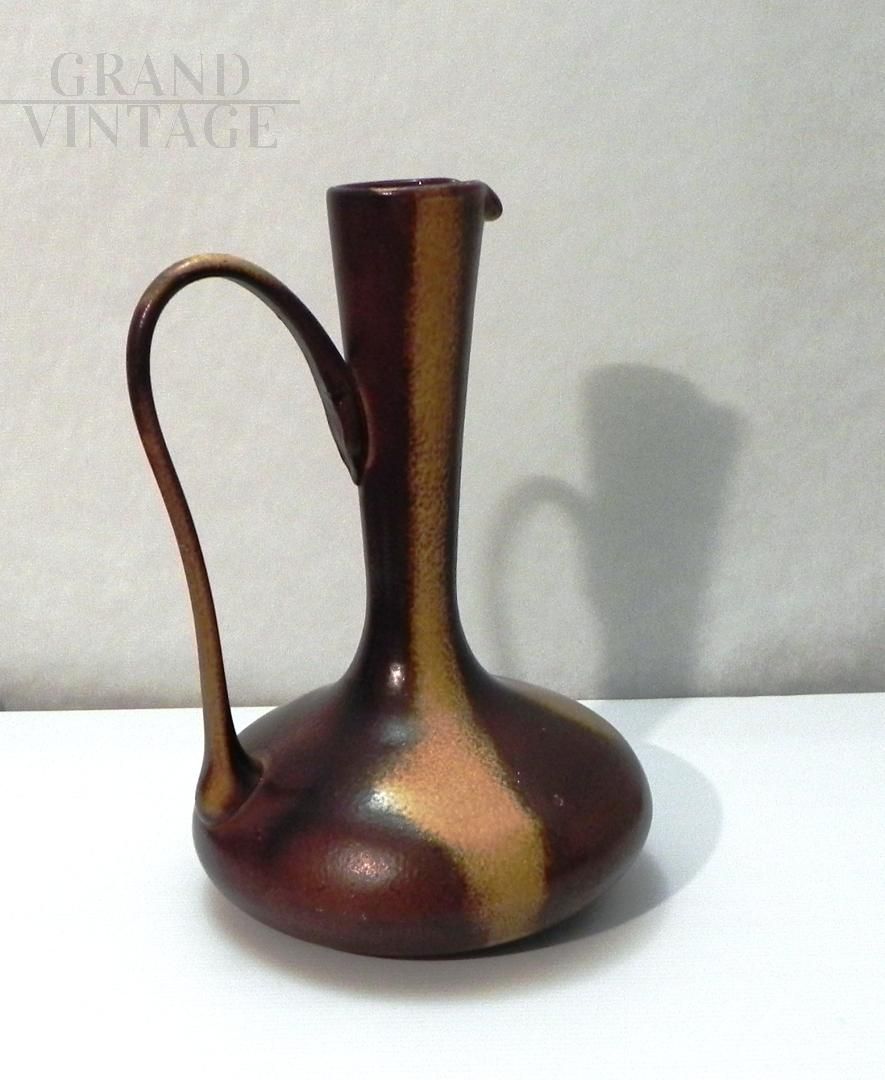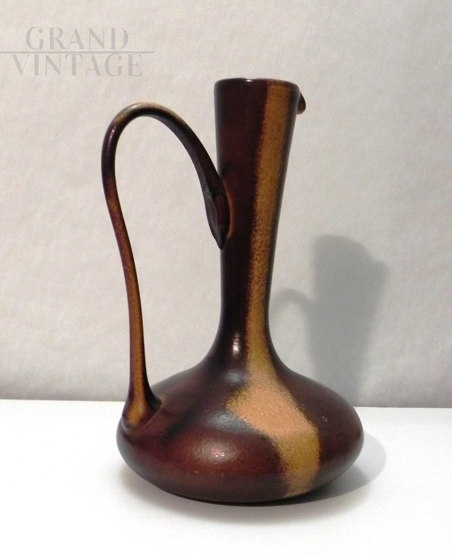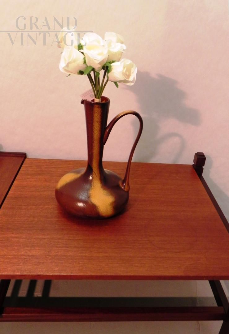 Brocca in vetro vintage anni '70 ispirata allo stile di Gunnar Nylund per Rorstrand, il vetro è smaltato a mano in colore marrone con sfumature. Il manico nella parte superiore presenta una crepa incollata, visibile nelle foto. Non ci sono loghi o marchi. Il pezzo risale agli anni '60 / '70.