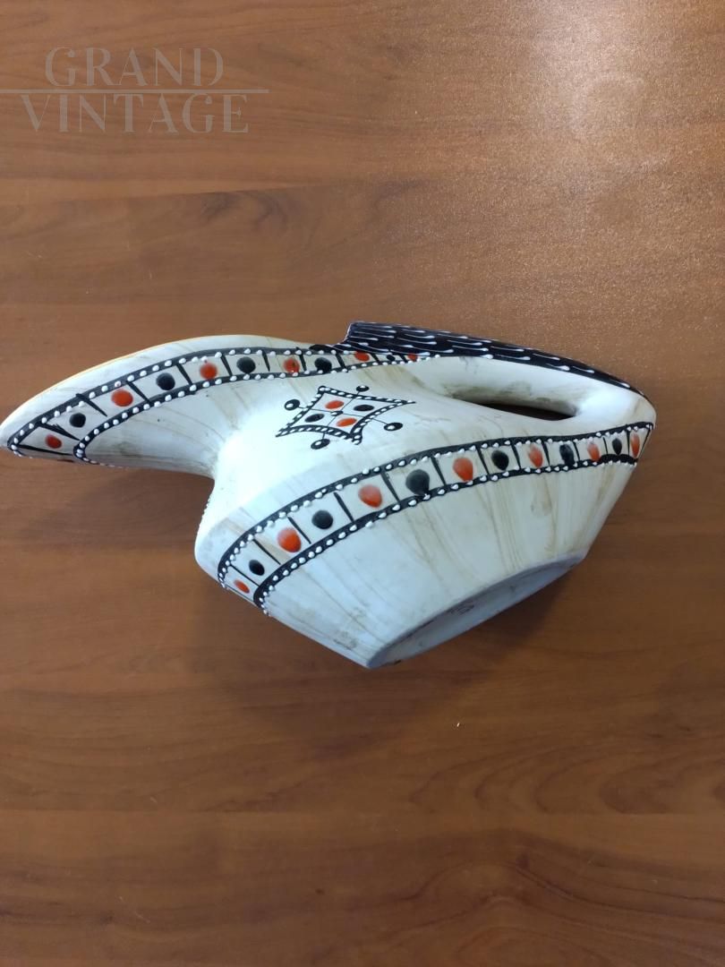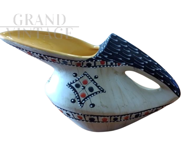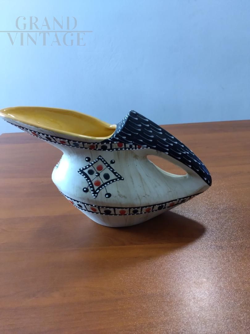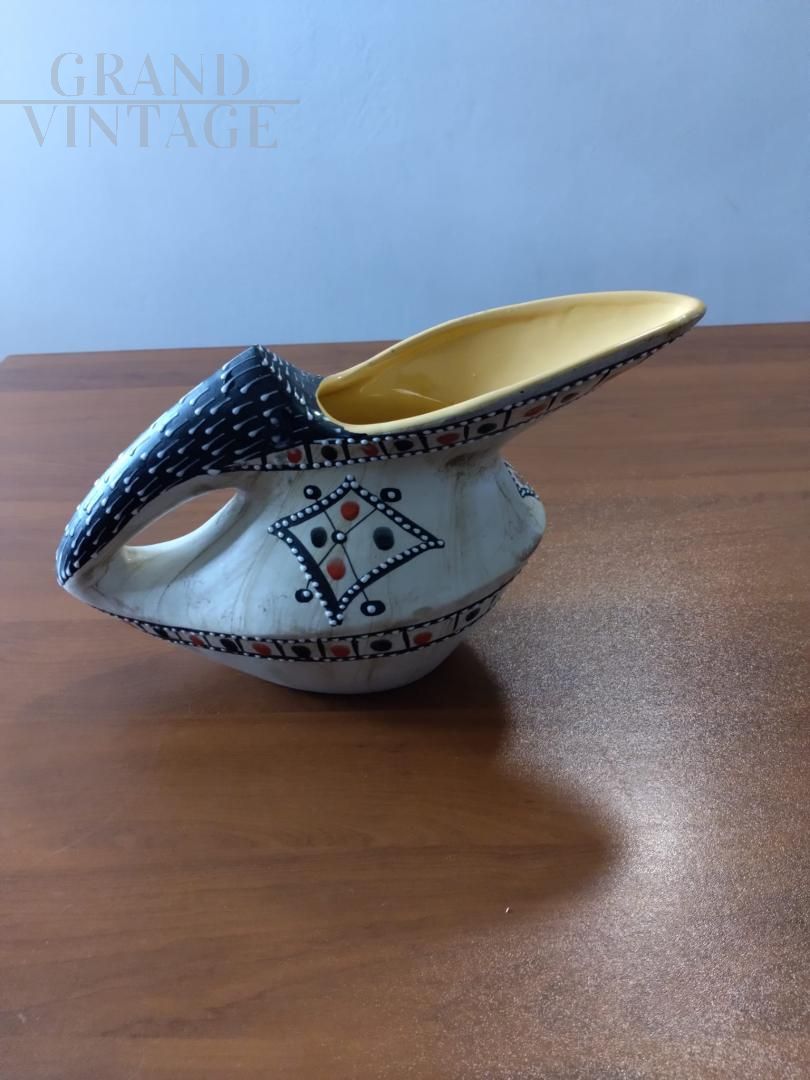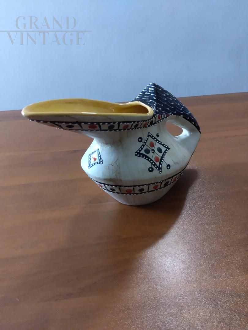 Vaso brocca versatoio in ceramica maiolica Fima Deruta, Italia 1956, decorato a mano con figure stilizzate e smalti lucidi in rilievo.