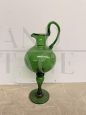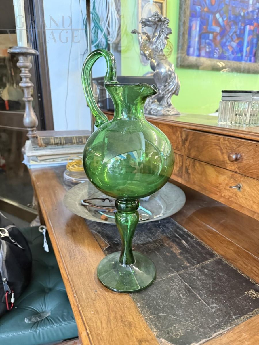 Antico versatoio brocca liberty in vetro verde soffiato artigianalmente, realizzato ad Empoli nei primi del '900, con altezza 40 cm