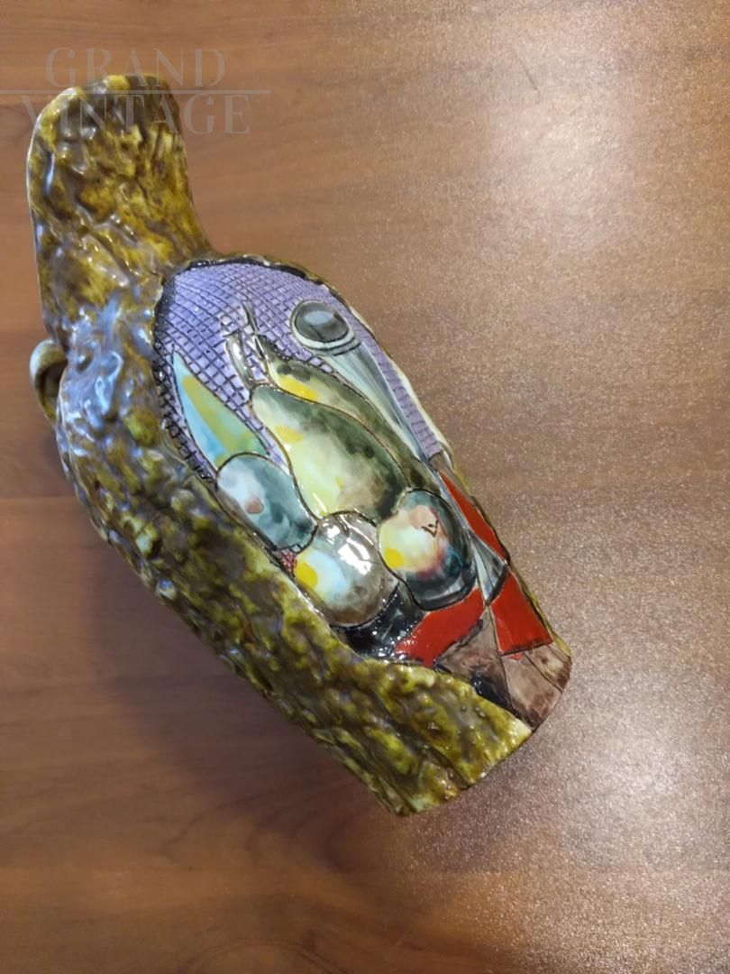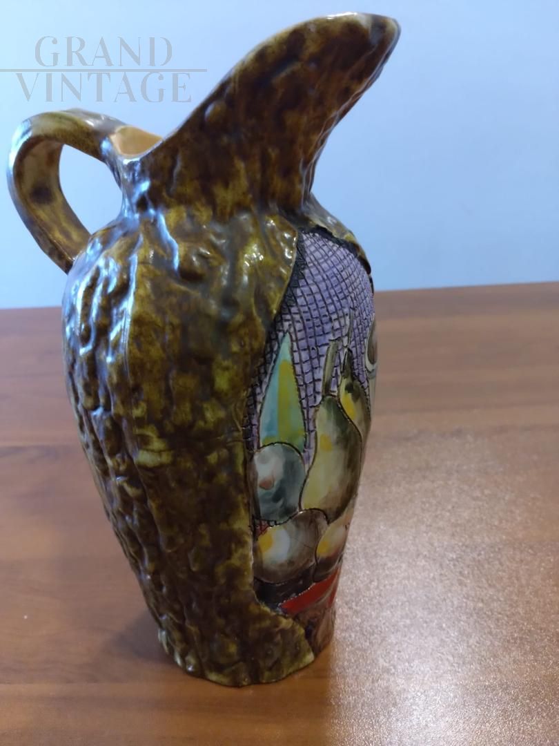Bellissima brocca vintage in ceramica lavica firmata Volpi Deruta, lavorata e dipinta a mano, riportante nella parte frontale una stupenda rappresentazione di natura morta con colori vivaci e brillantini.