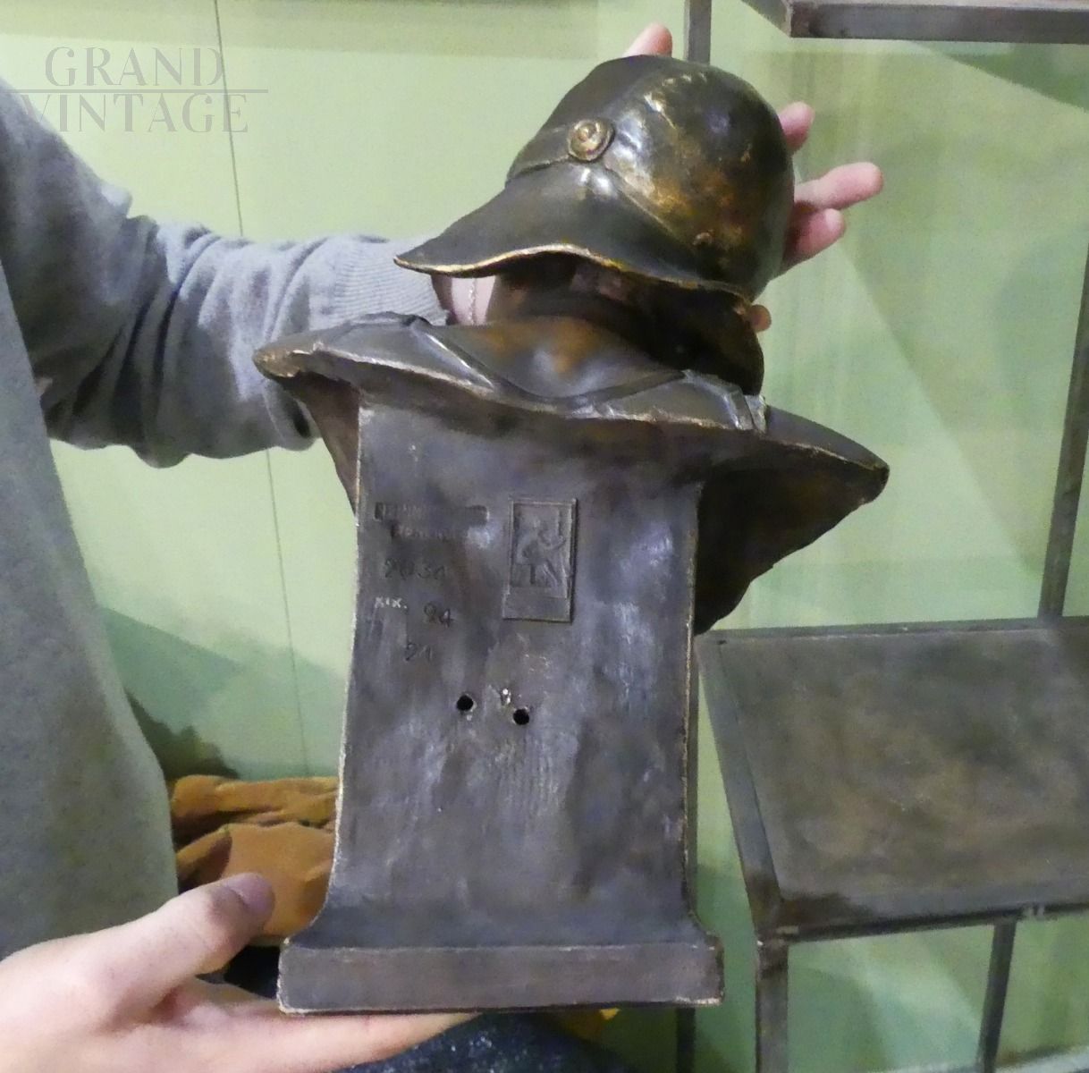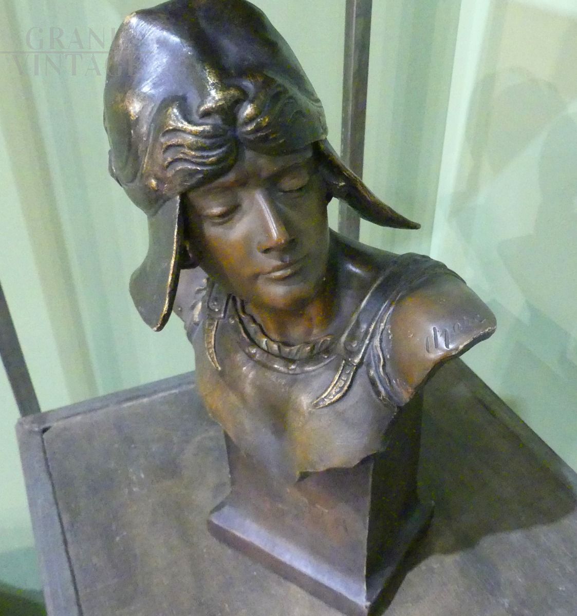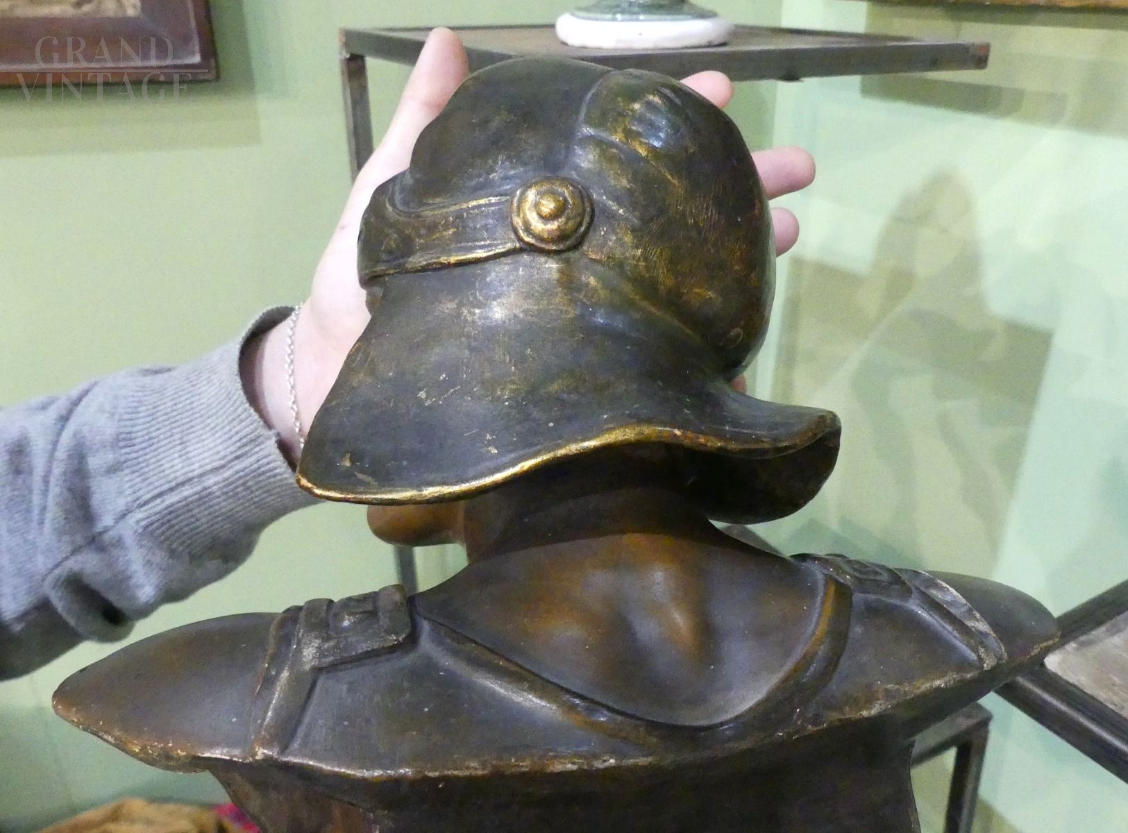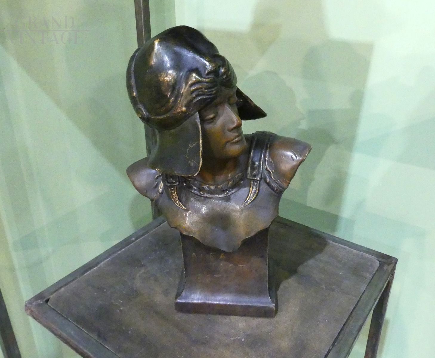 Bellissimo piccolo busto di guerriera con elmo e armatura, realizzato in terracotta Goldscheider, periodo Liberty austriaco. Il busto presenta la scritta Alea Iacta Est sulla base, ed è firmato su una spalla. La lavorazione è molto bella con effetto bronzo.