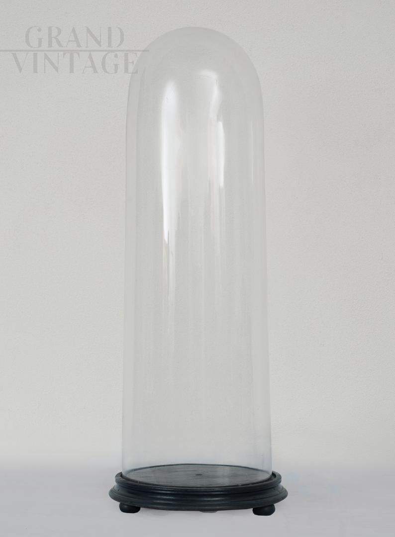 Campana antica in vetro di epoca Luigi Filippo su base in legno ebanizzato, in ottimo stato di conservazione.