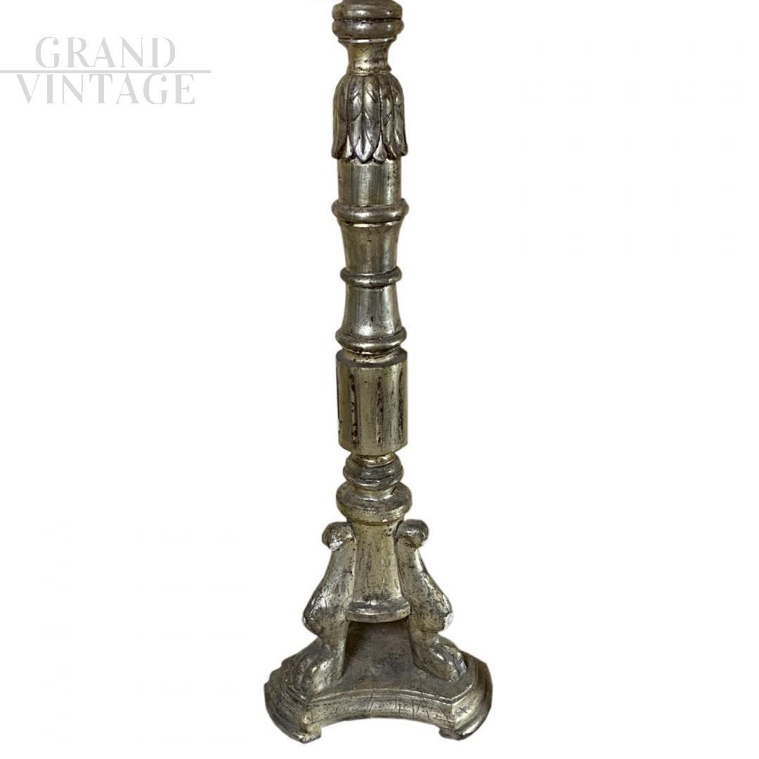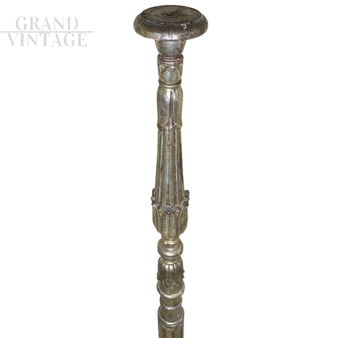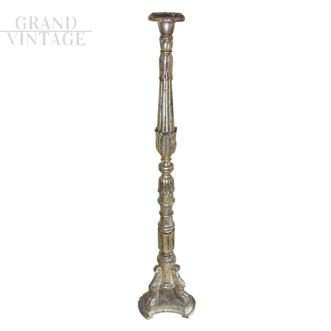 Antico Torciere in legno interamente intagliato a motivi floreali e naturalistici, in foglia argento originale, appartenente al XVIII secolo.