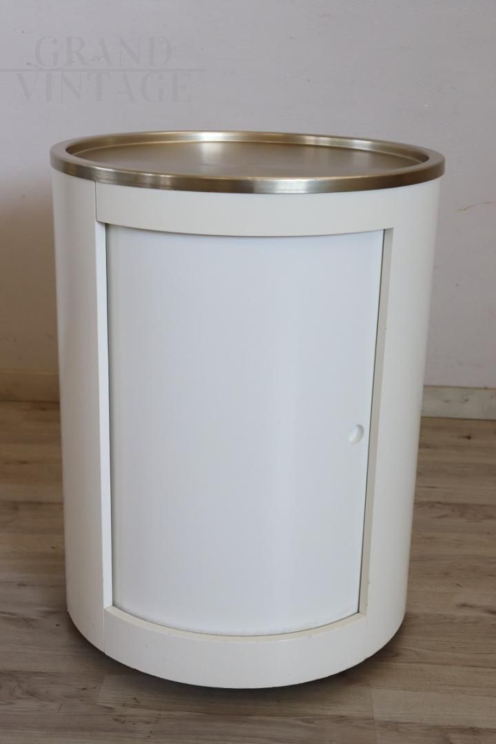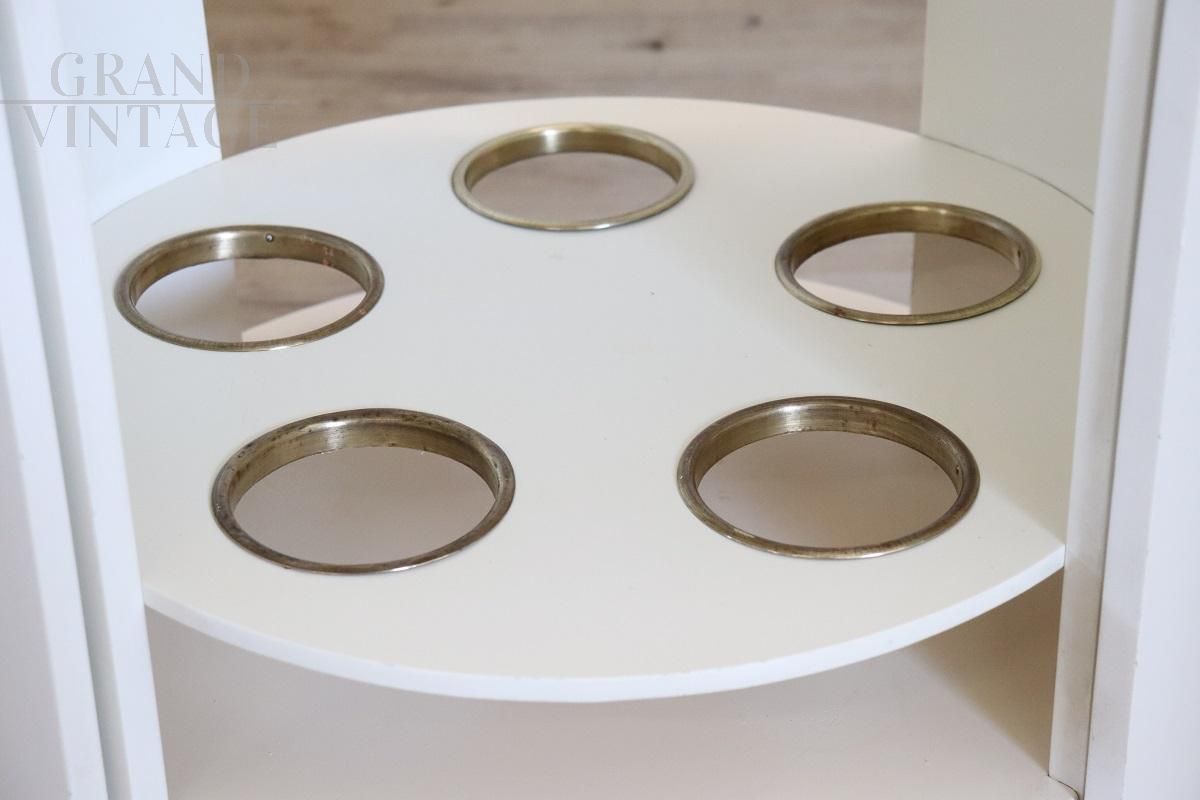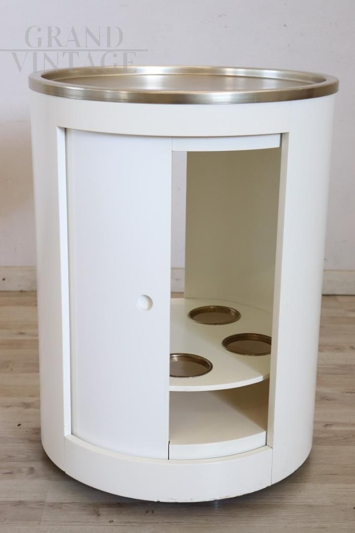 Bellissimo carrello bar vintage con portabottiglie, modernariato space-age italiano anni '60, caratterizzato da una forma cilindrica, con struttura in legno laccato bianco e piano in acciaio satinato. Dotato di un'anta scorrevole e di un portabottiglie interno che può contenere cinque bottiglie, completo di ruote per un pratico spostamento. In buone condizioni, piccoli e trascurabili segni di usura sul fondo. Perfetto per servire le bevande ai vostri ospiti. Ottimo prezzo trattabile.