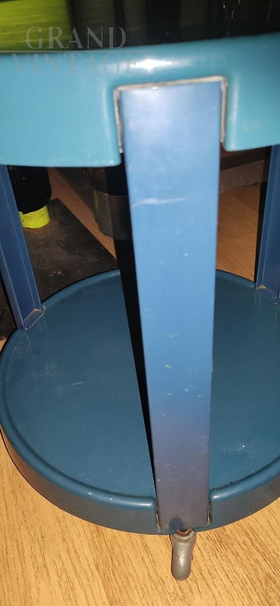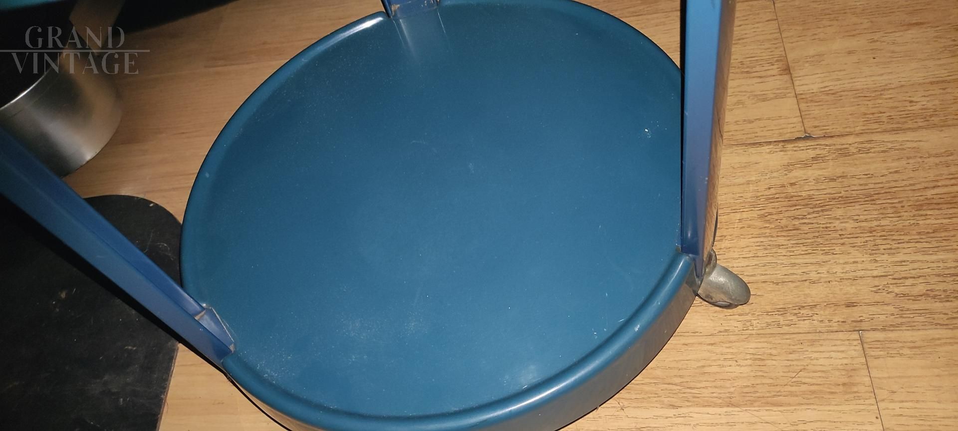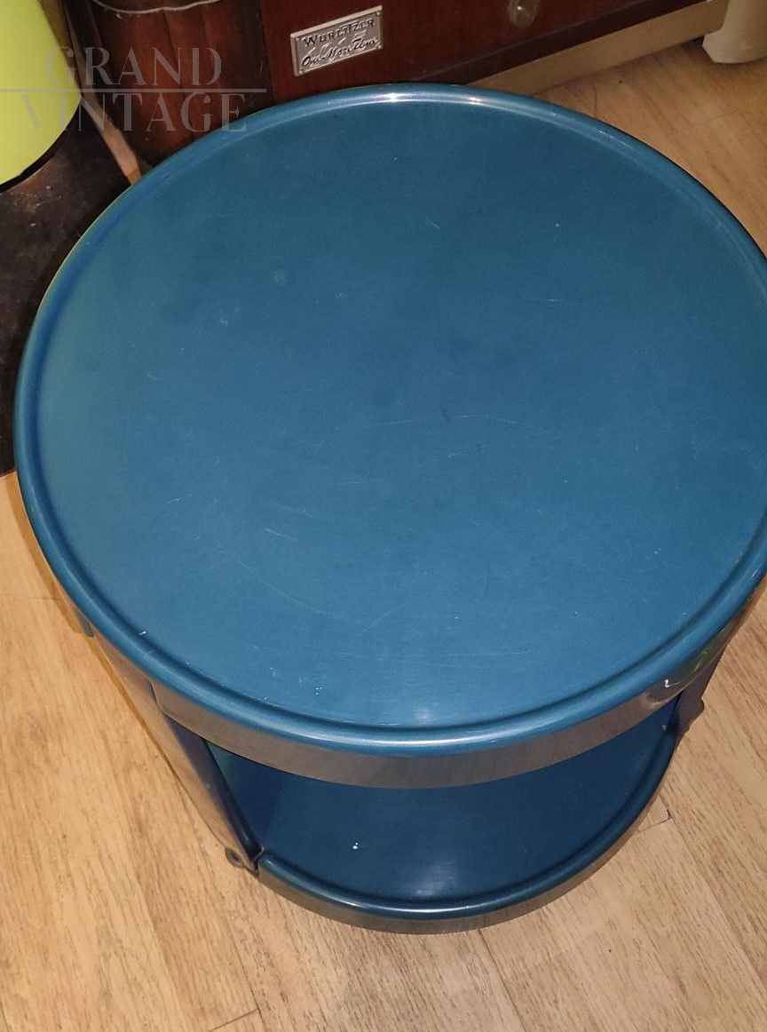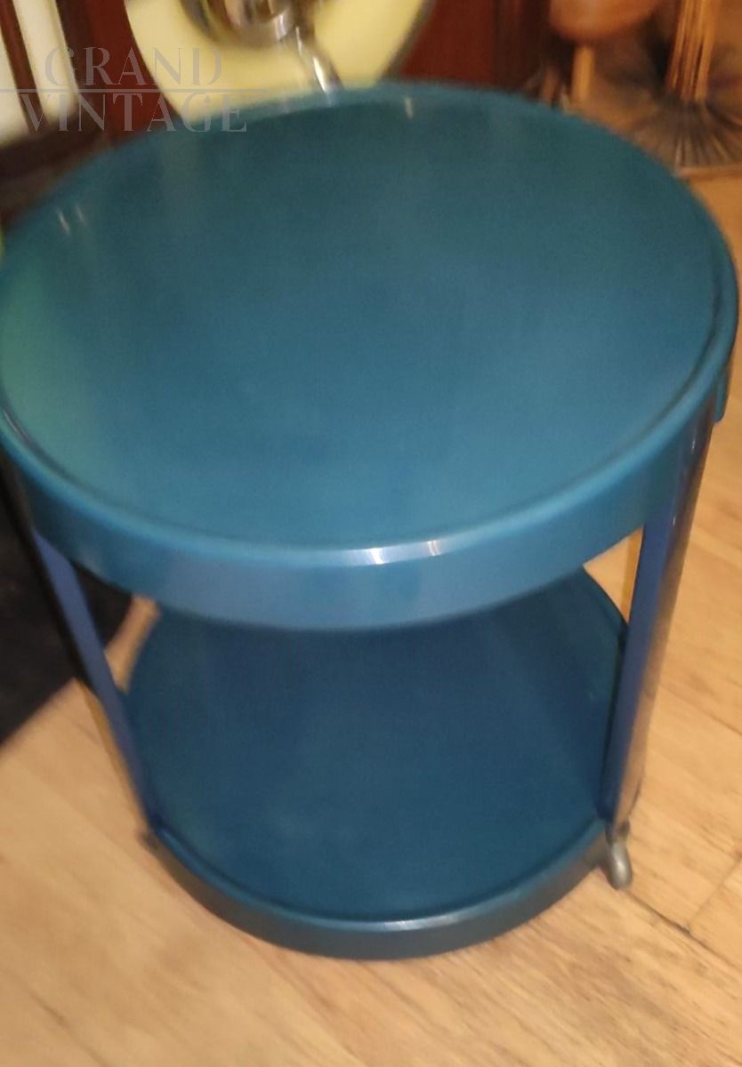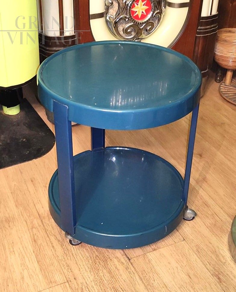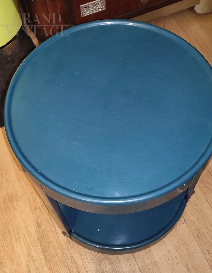 Carrello vintage rotondo in plastica blu petrolio, modernariato italiano space age anni '70, ben tenuto, con i naturali segni del tempo.