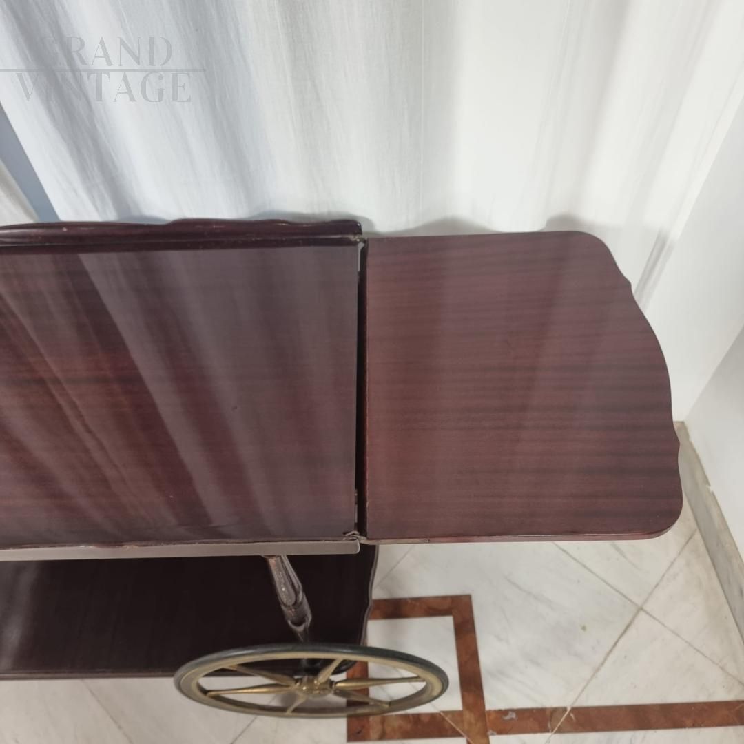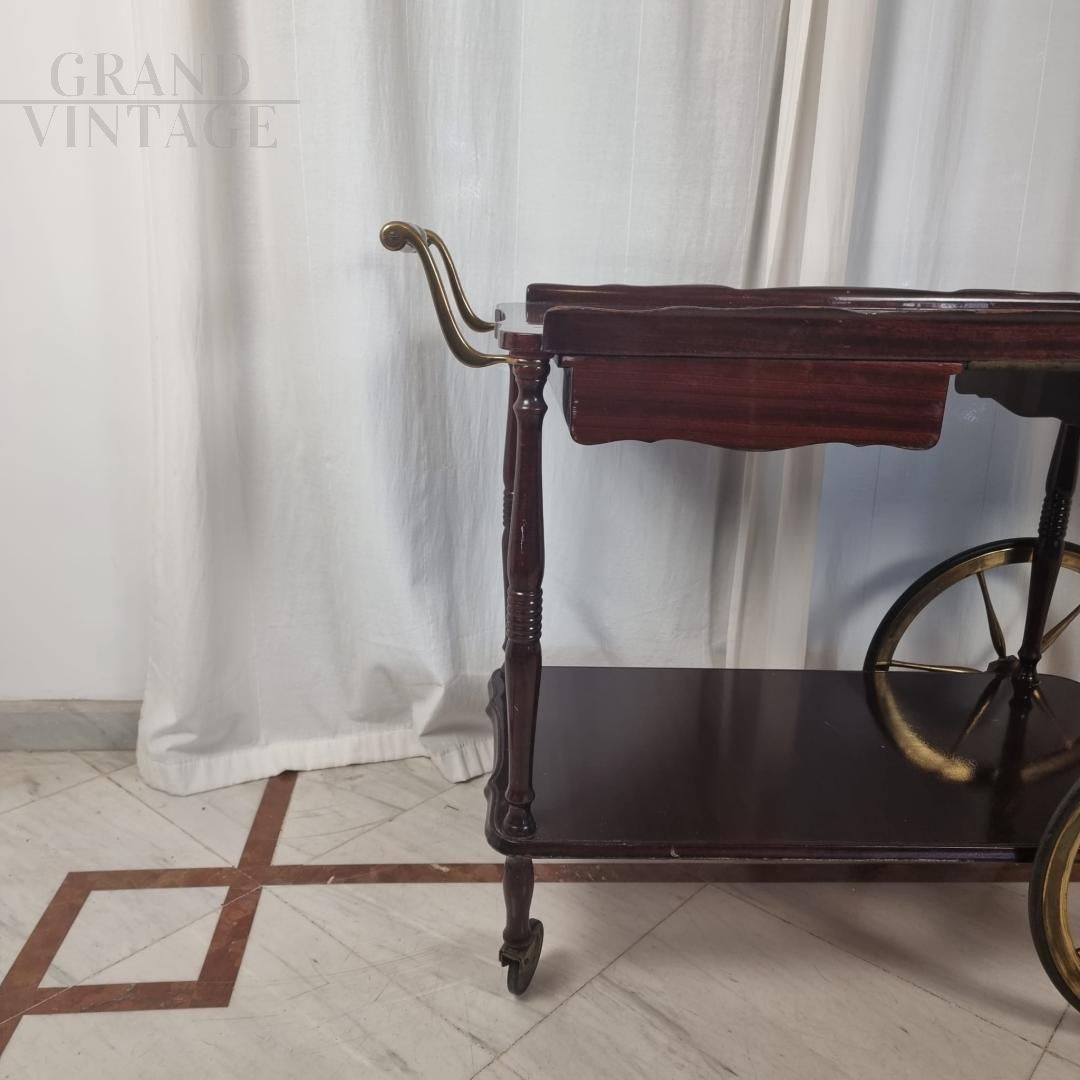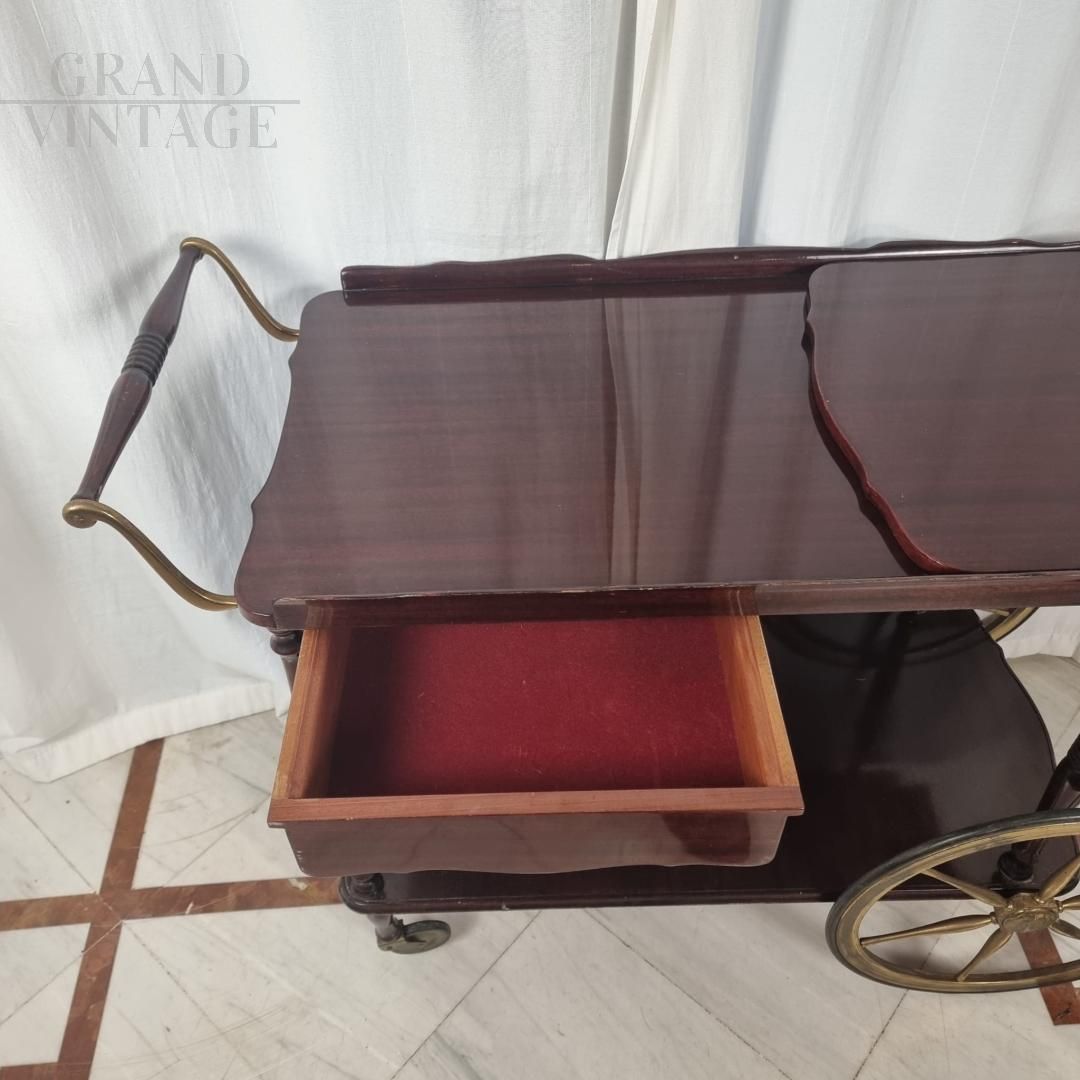 Bellissimo carrello bar anni '50 in legno di mogano e ottone con ripiano allungabile e cassetti.