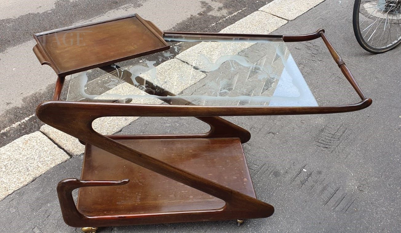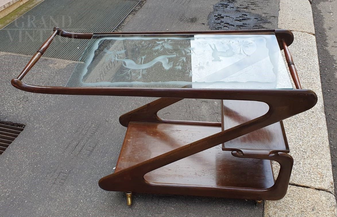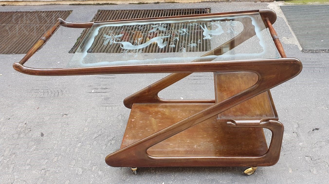 Carrello Cesare Lacca con piano in vetro serigrafato originale