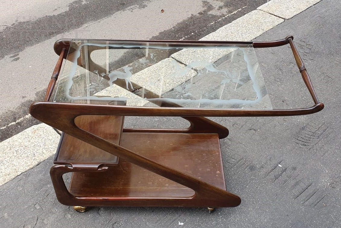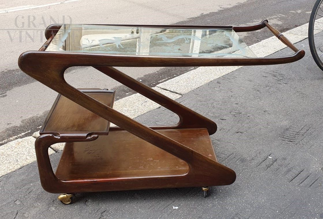 Carrello mid-century italiano di Cesare Lacca con struttura in legno e piano in vetro serigrafato originale con flora e fauna, dettagli in ottone e vassoio estraibile. Un articolo raro e di grande effetto ed eleganza.