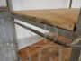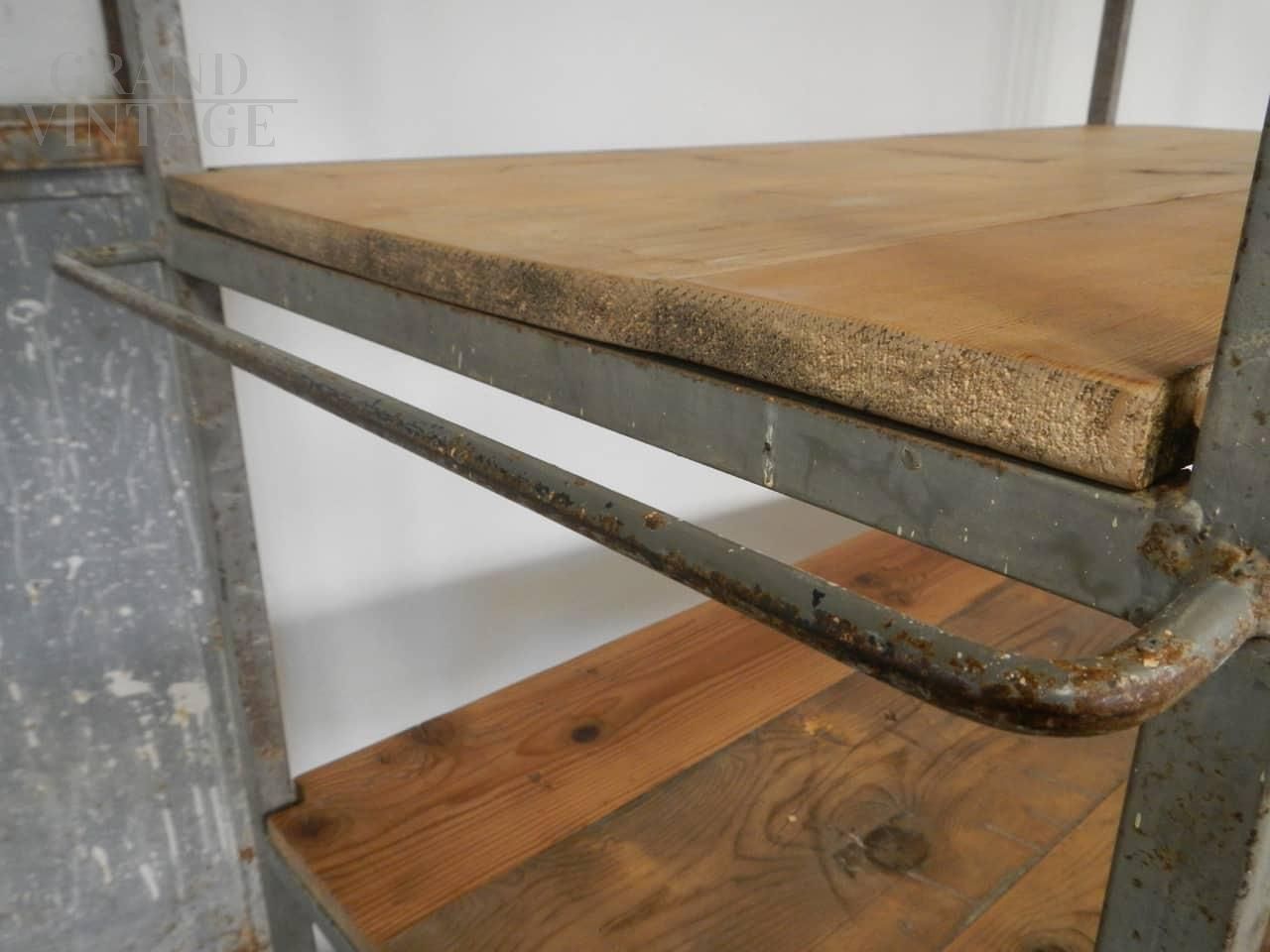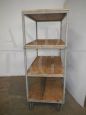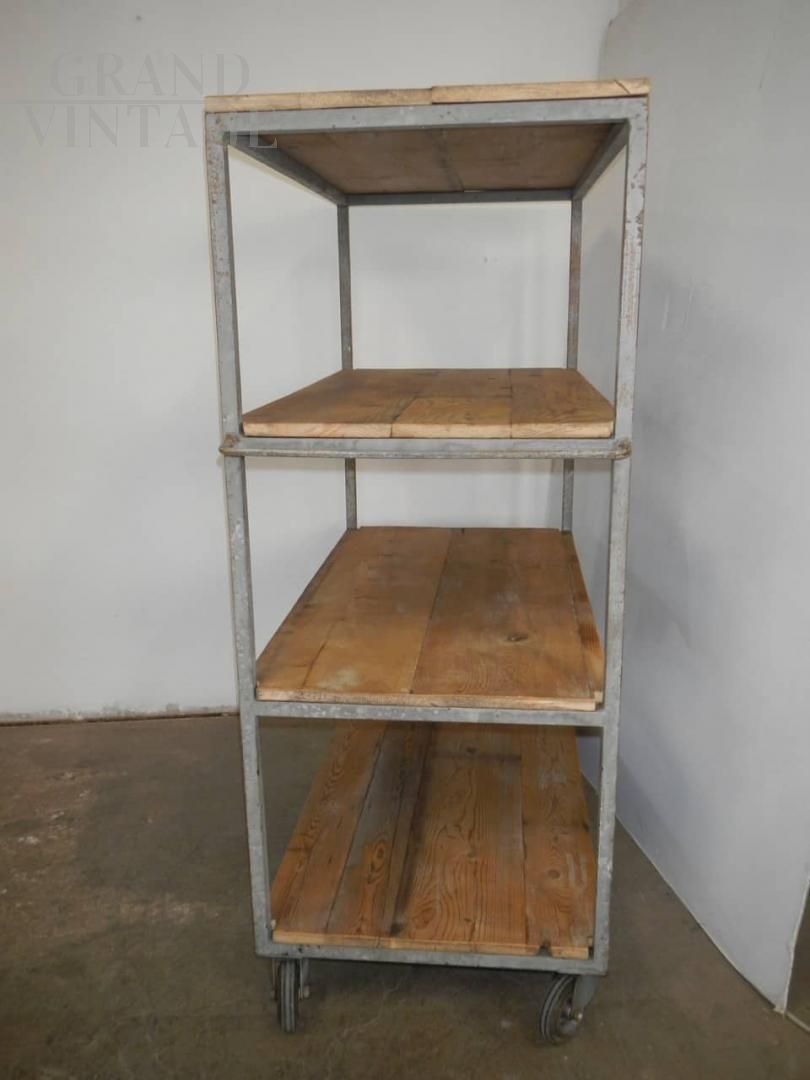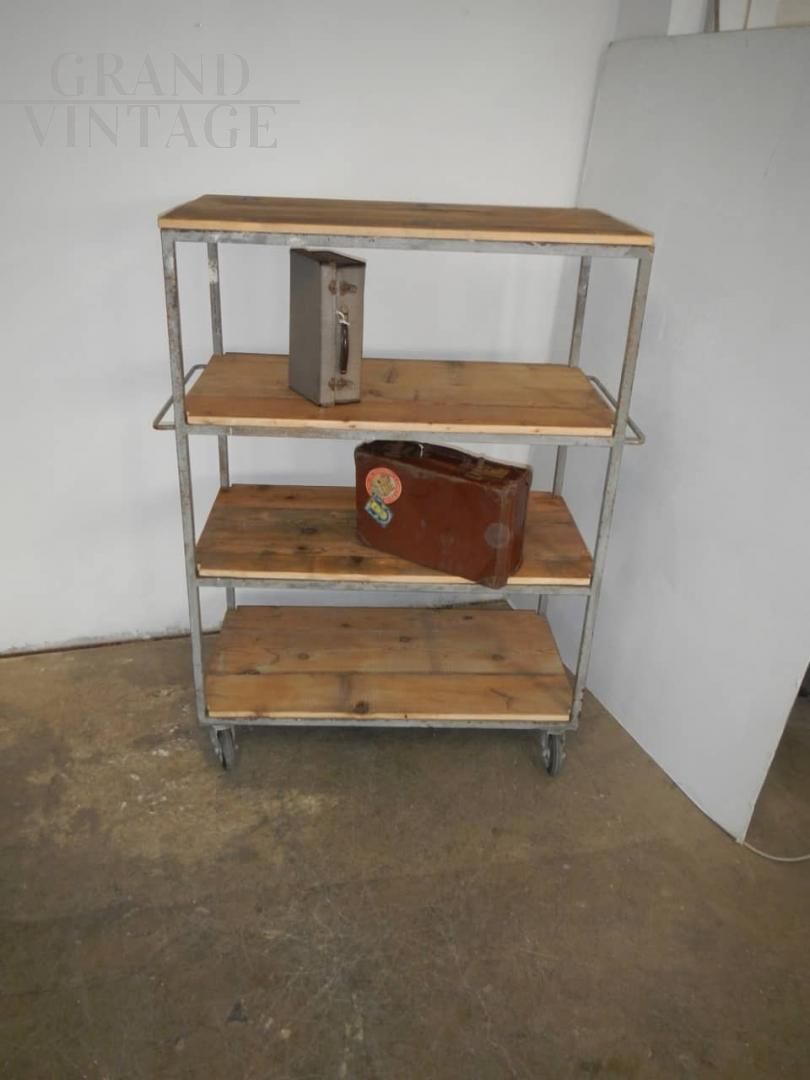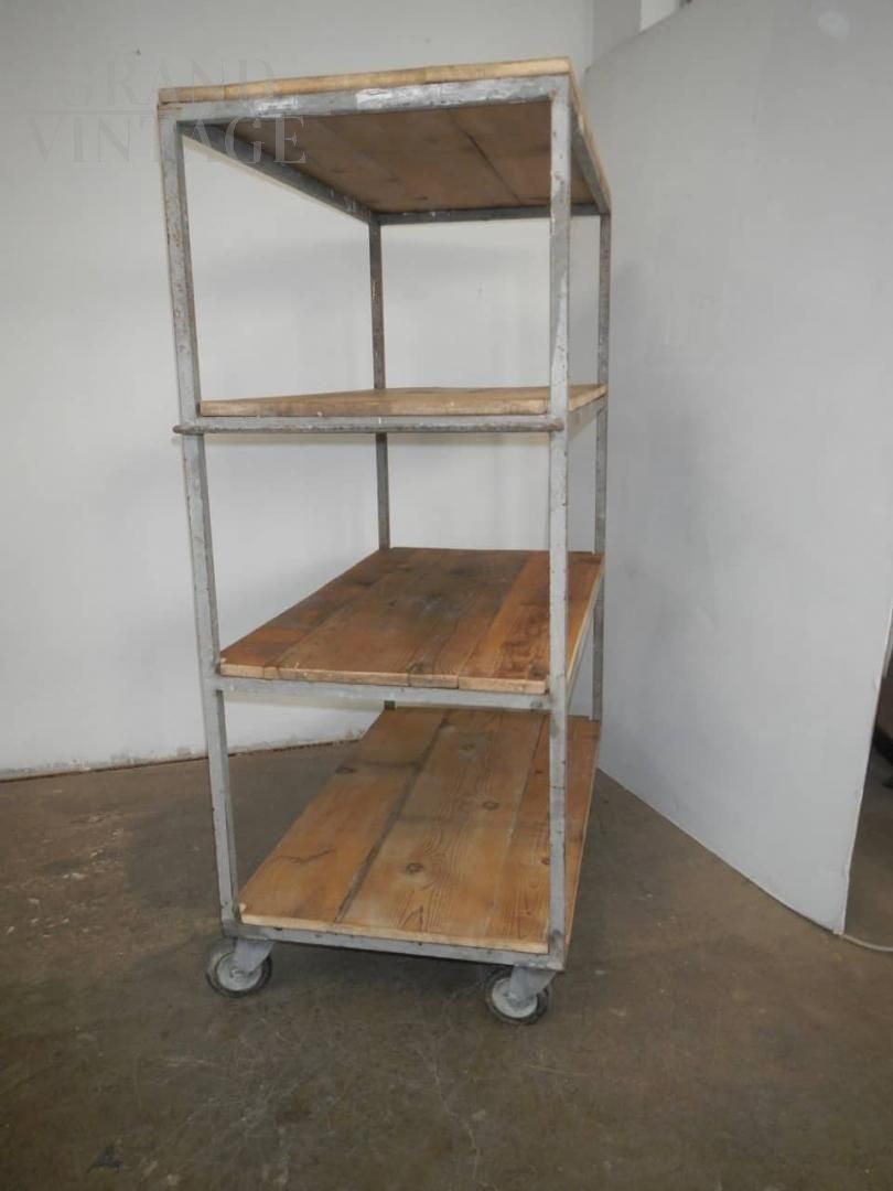 Carrello da ceramista vintage anni '70 dotato di ruote, con struttura in ferro e ripiani in abete in patina. Restaurato.