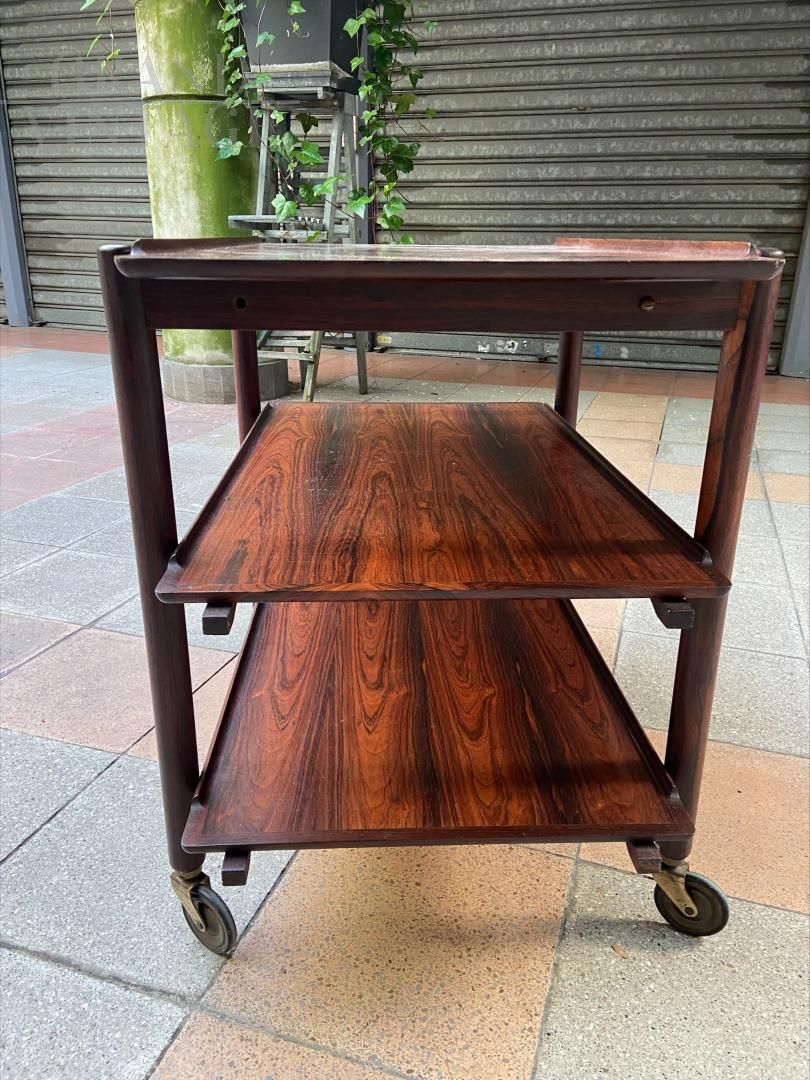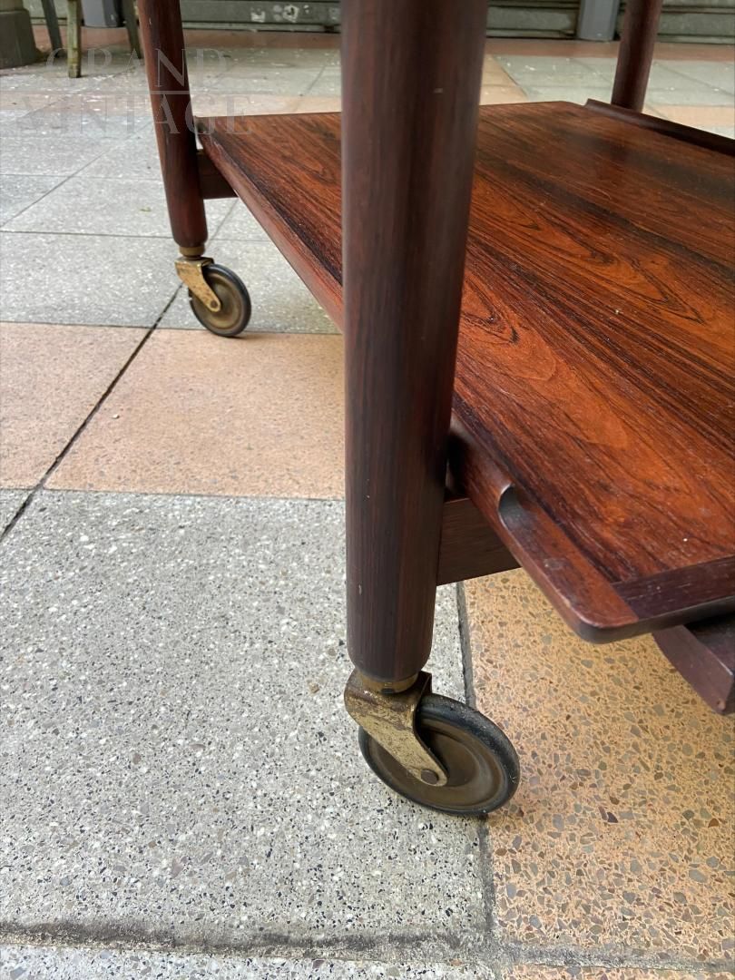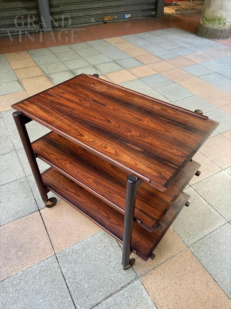 Carrello portavivande design di Fratelli Reguitti, anni '60, con struttura in mogano e piani removibili a vassoio.