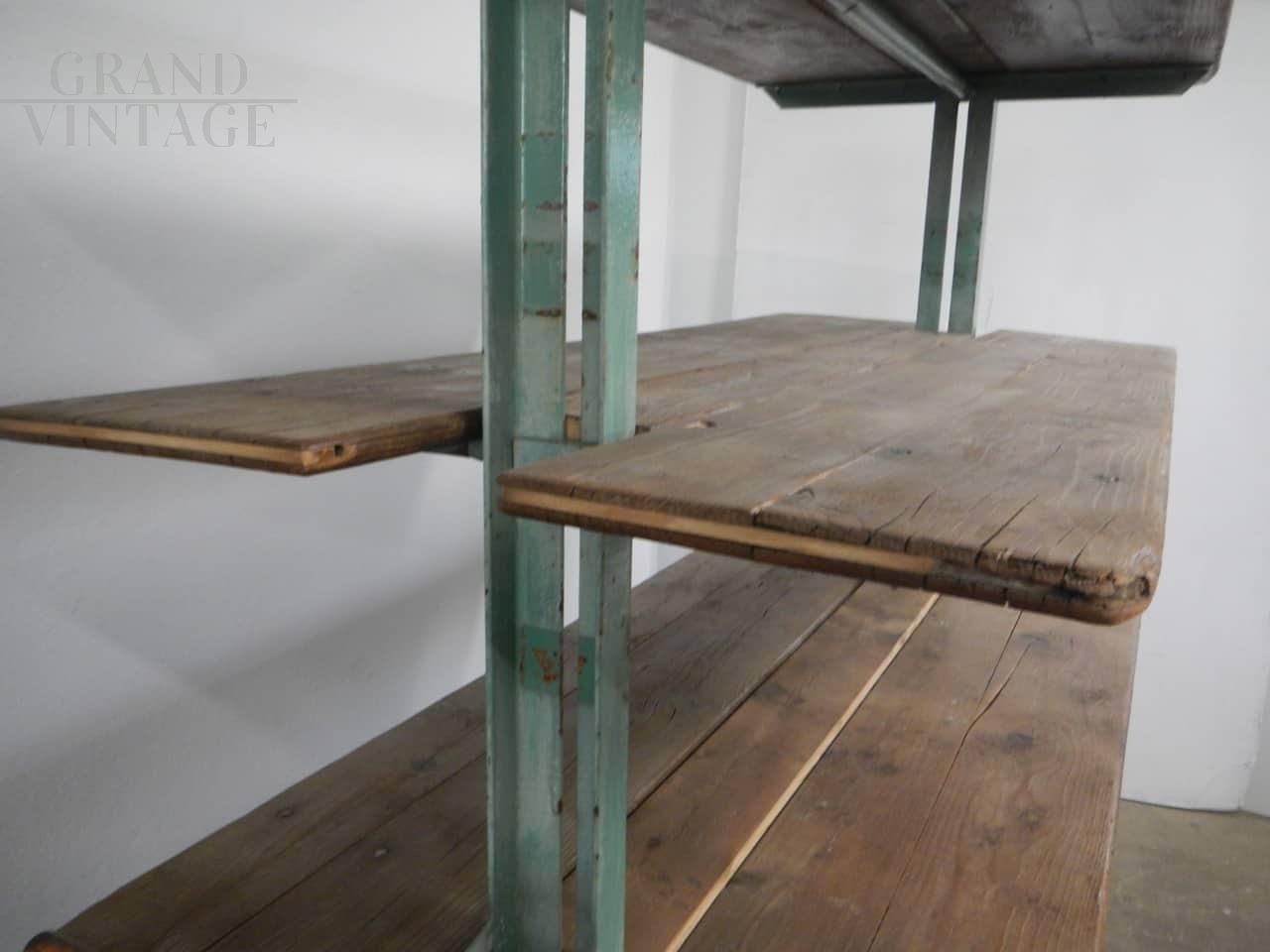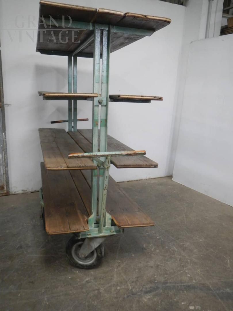Carrello espositore industriale in ferro colorato verde con mensole in legno di abete in patina, dotato di 4 ruote con pneumatici Pirelli, proveniente da un'azienda di ceramiche. In buone condizioni, legno trattato con vernice.