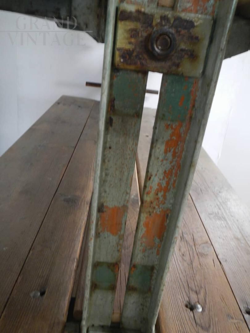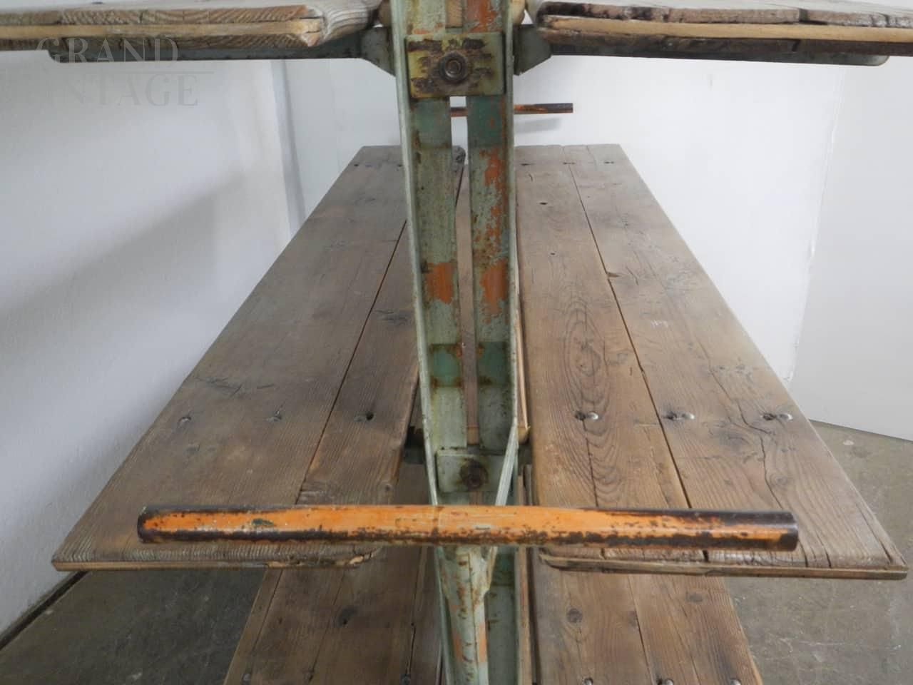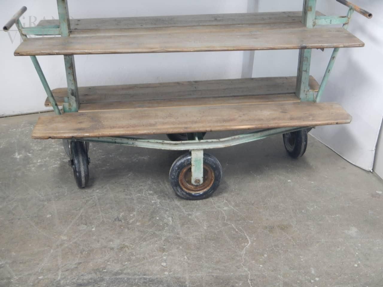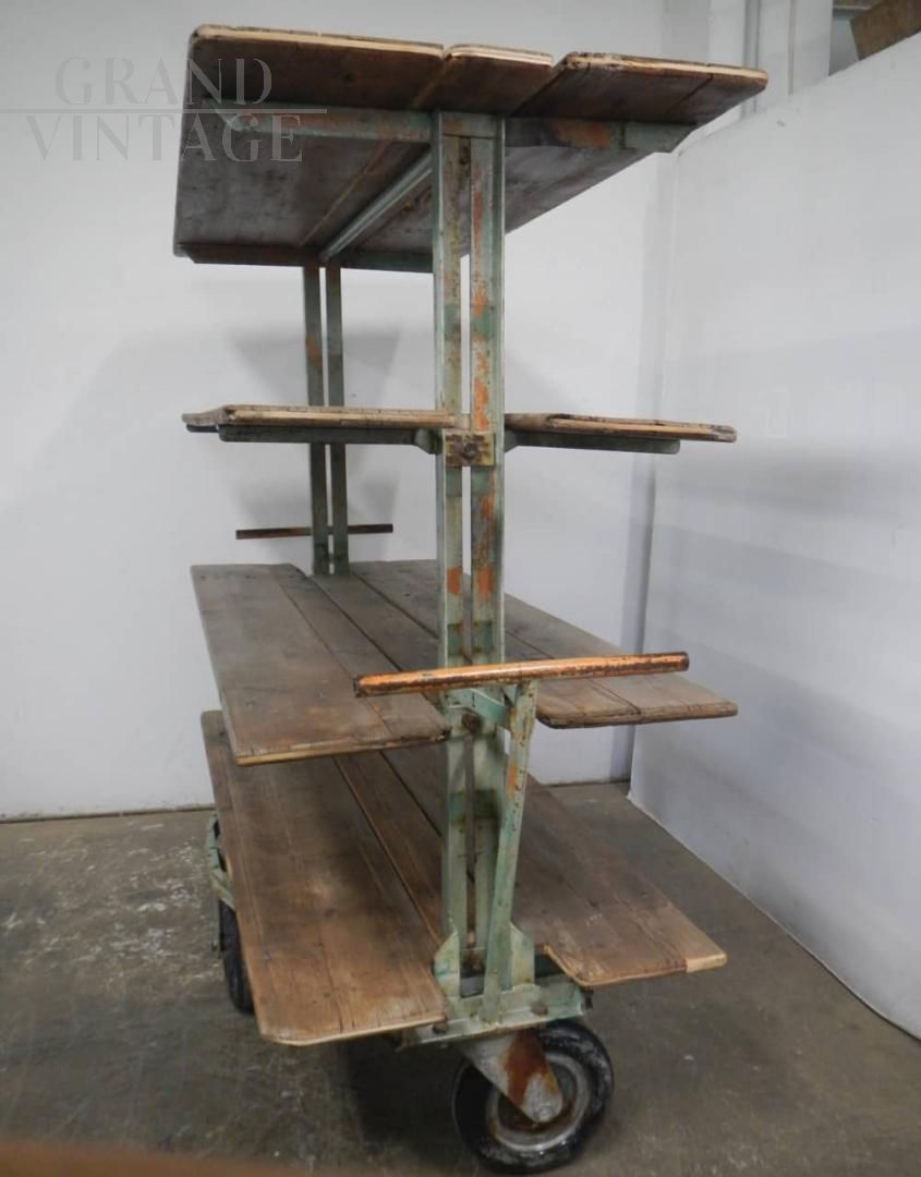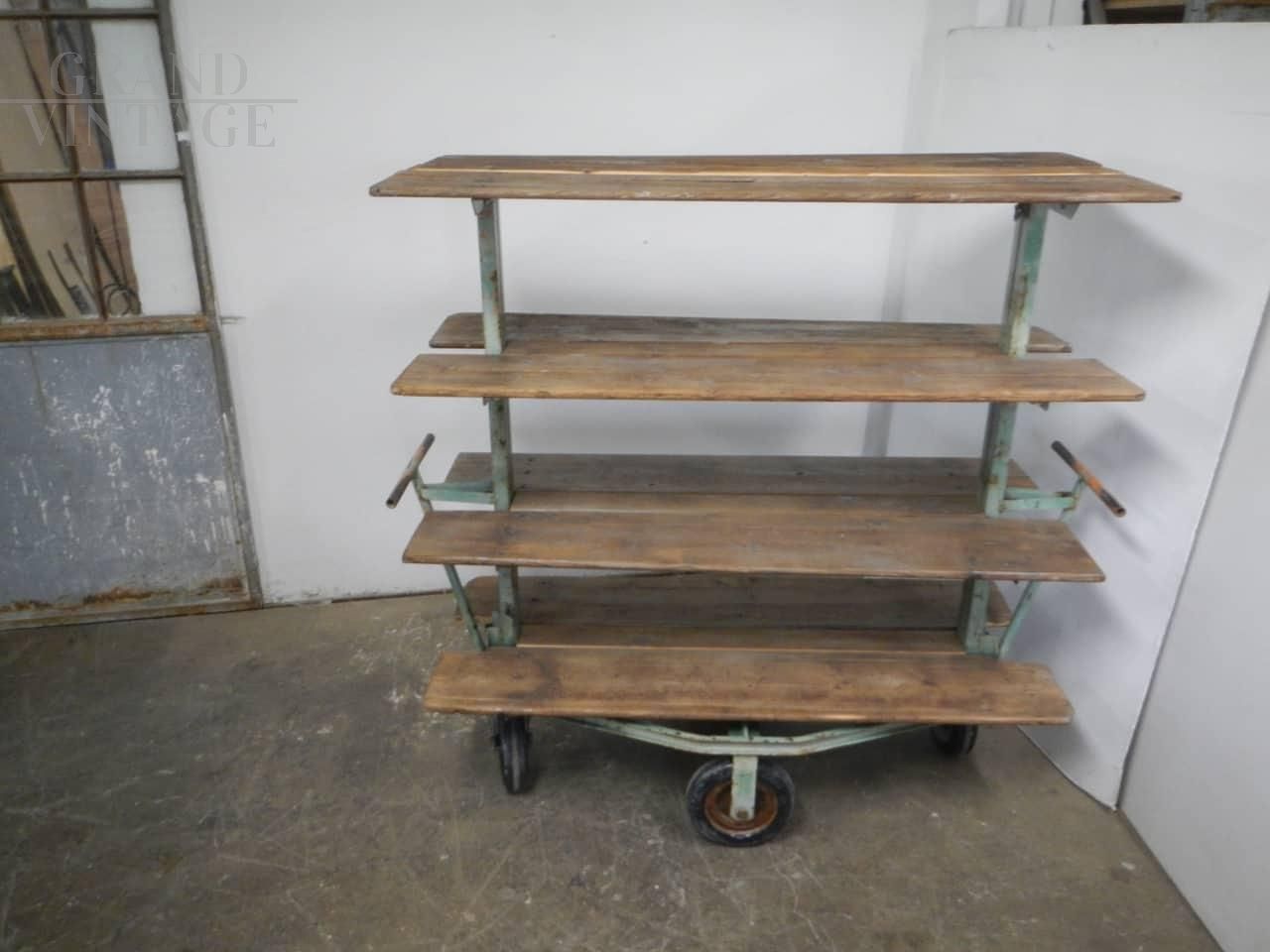 Carrello espositore industriale in ferro colorato verde con mensole in legno di abete in patina, dotato di 4 ruote con pneumatici Pirelli, proveniente da un'azienda di ceramiche. In buone condizioni, legno trattato con vernice.