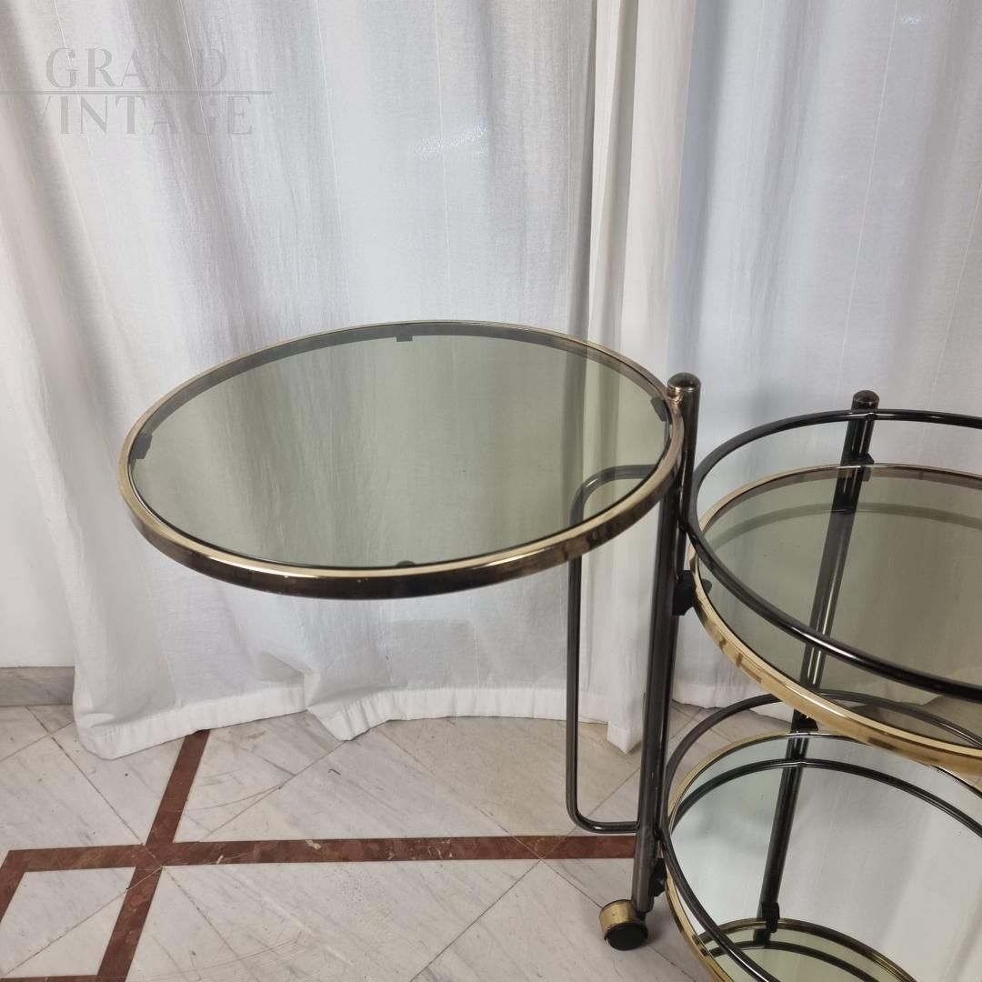 Carrello bar vintage Hollywood Regency, anni '60, con struttura in ottone e tre piani in specchio e vetro. Il piano inferiore è a specchio ed è completo di ringhiera portabottiglie, il piano centrale è in vetro e presenta anch'esso la ringhiera portabottiglie. Infine il piano superiore è in vetro ed è direziionabile, utilizzabile quindi come tavolino. Lo stato è molto buono, l'oggetto vintage non ha difetti ma può mostrare lievi tracce di usura.