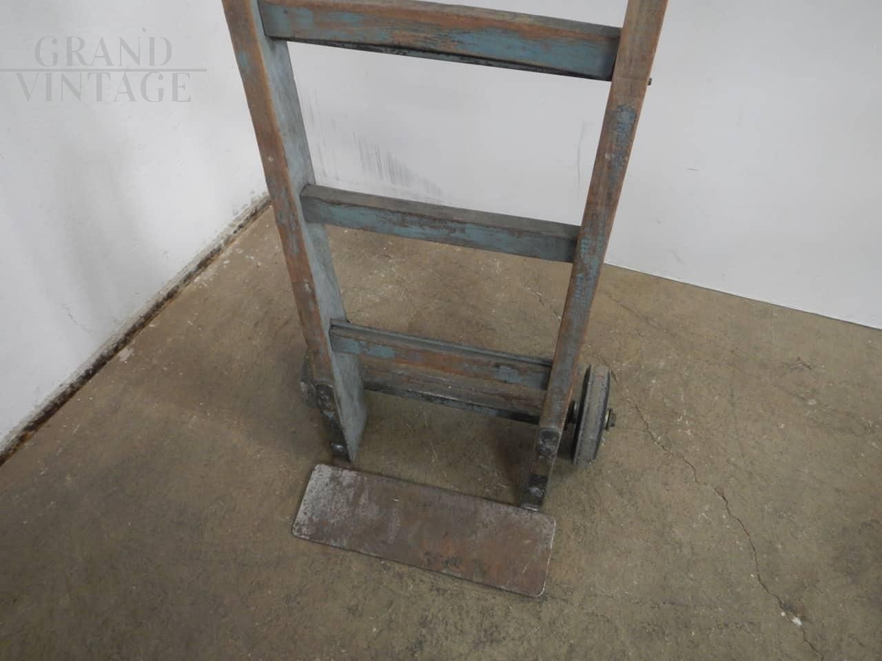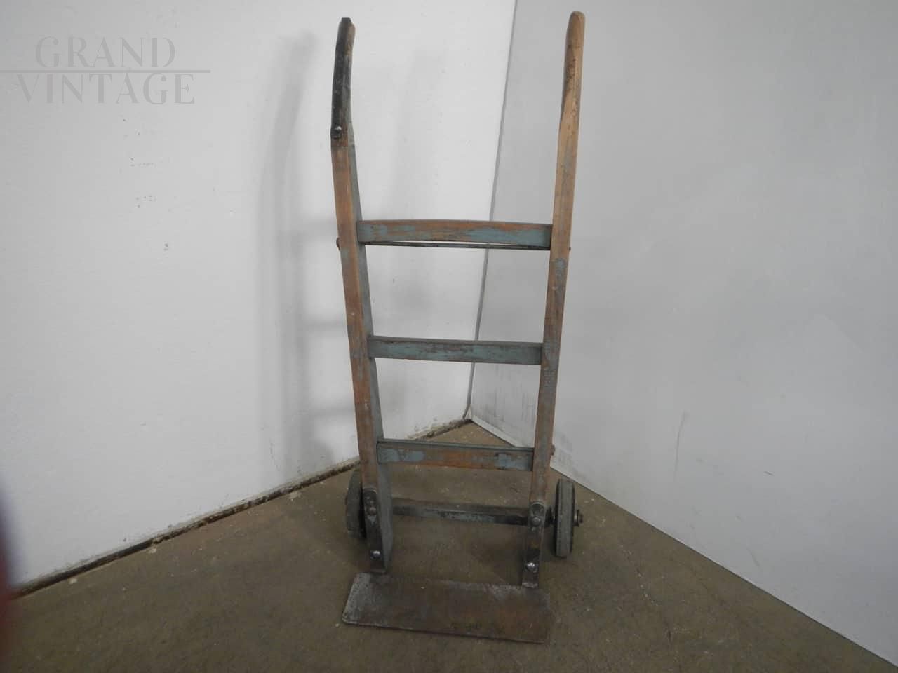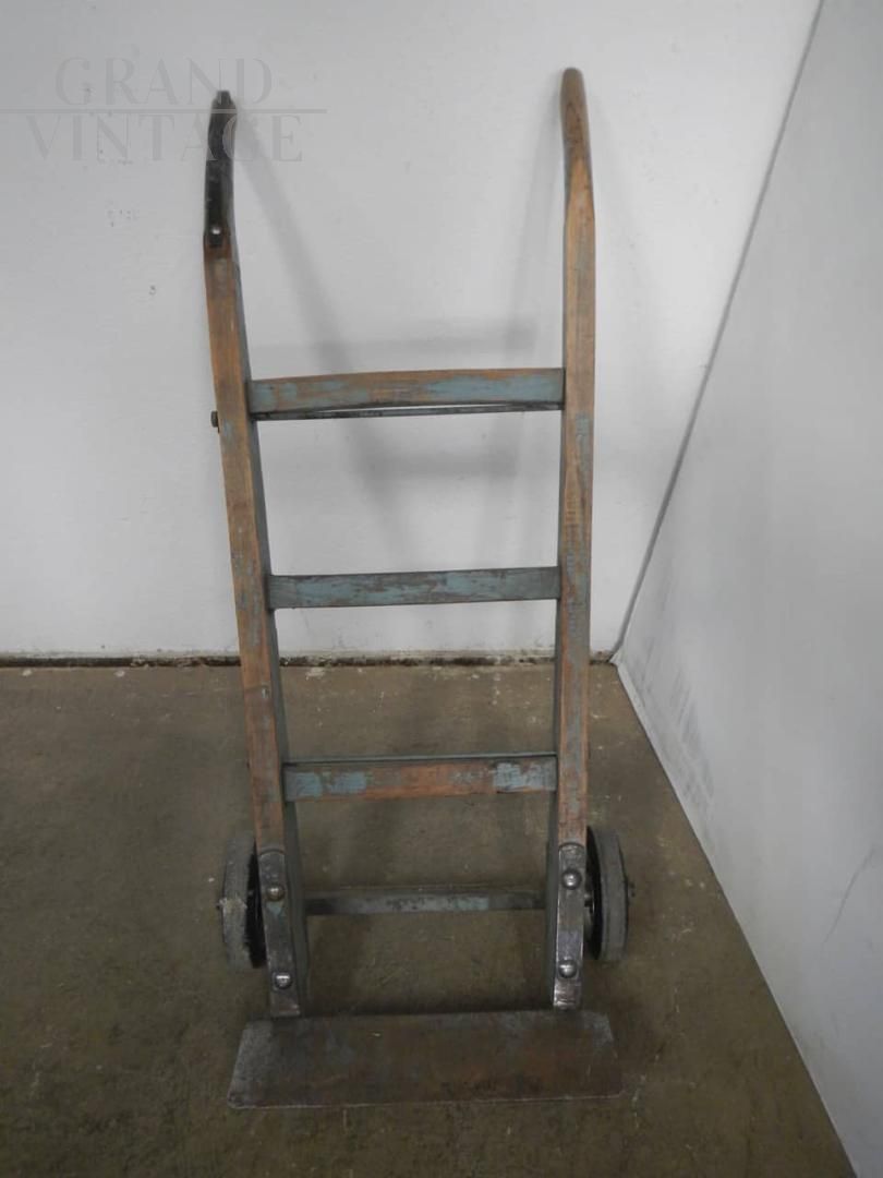 Carrello portapacchi vintage anni '50 su due ruote, con struttura in legno di rovere e rifiniture in ferro. In buone condizioni.