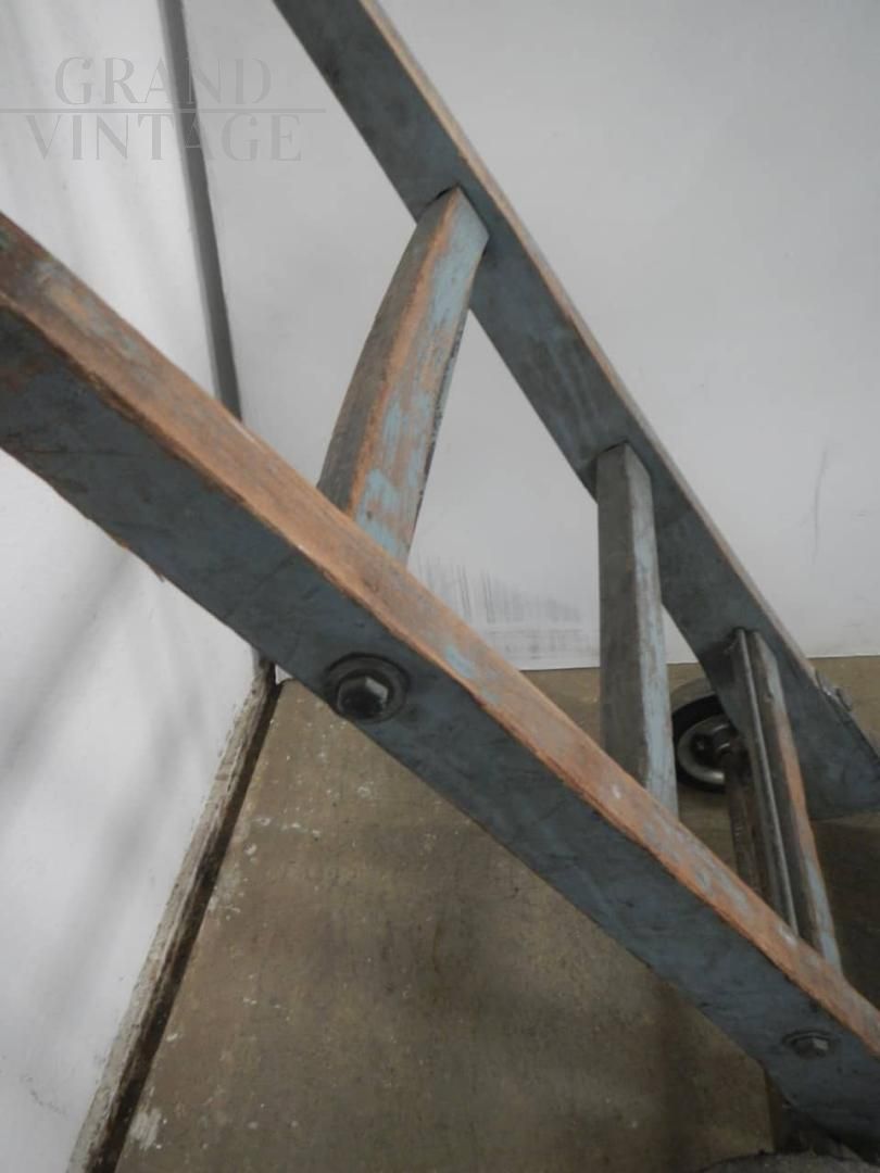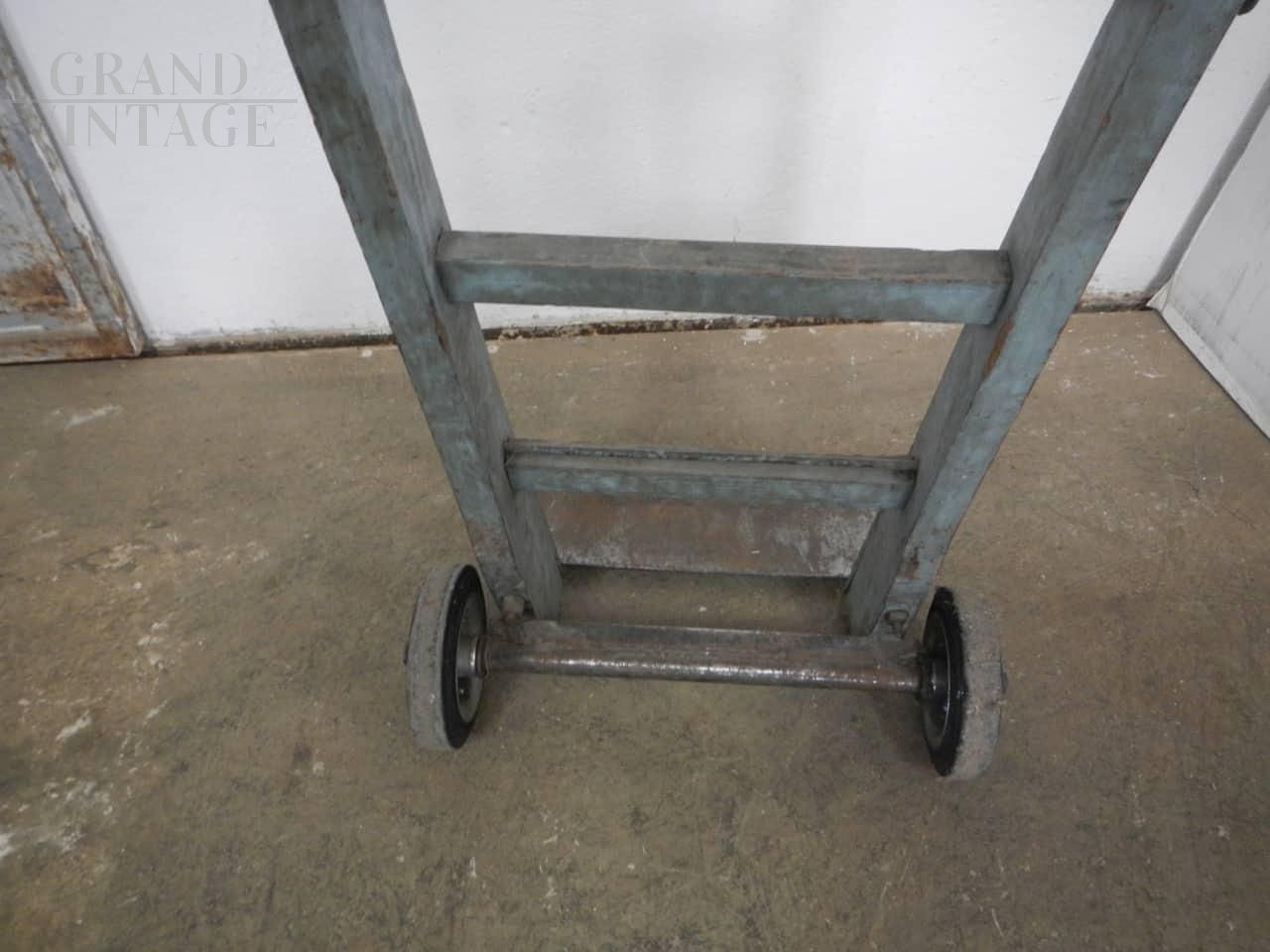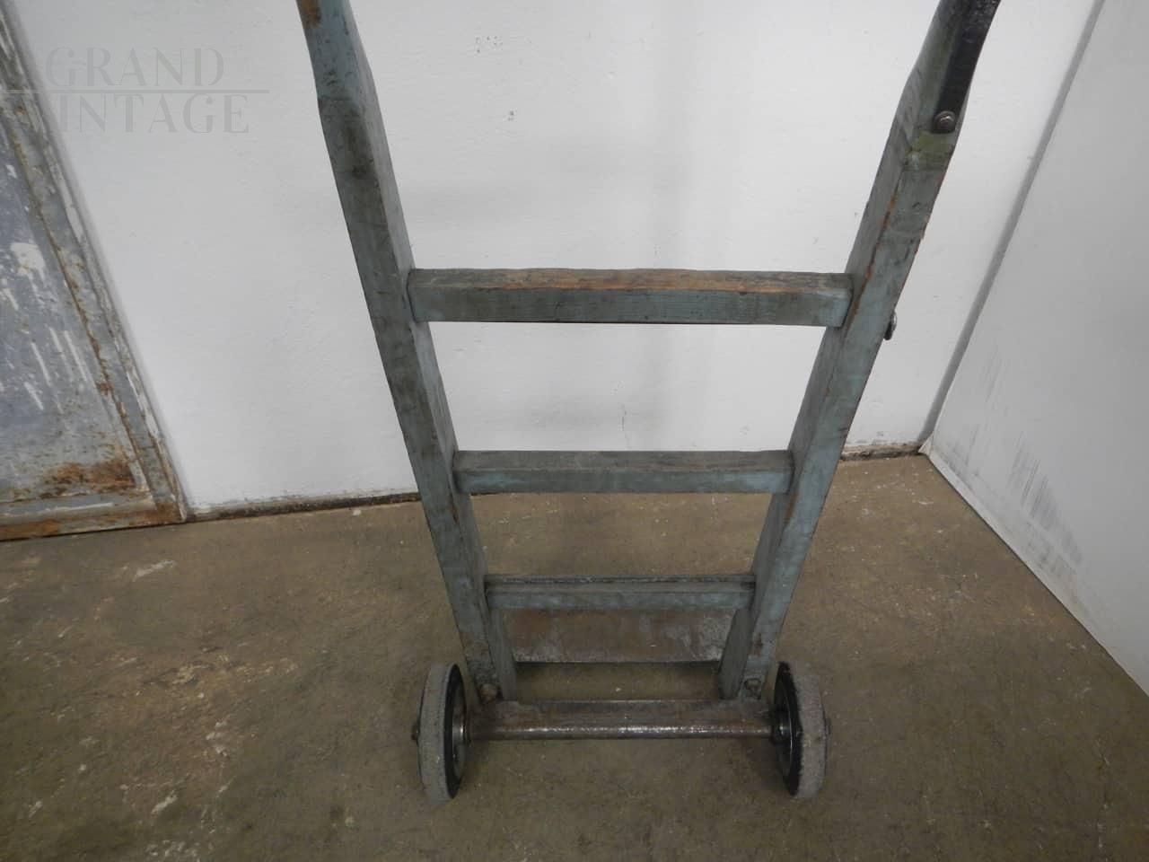 Carrello portapacchi vintage anni '50 su due ruote, con struttura in legno di rovere e rifiniture in ferro. In buone condizioni.