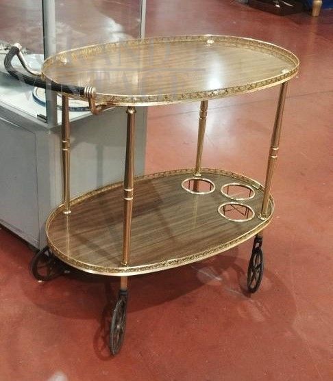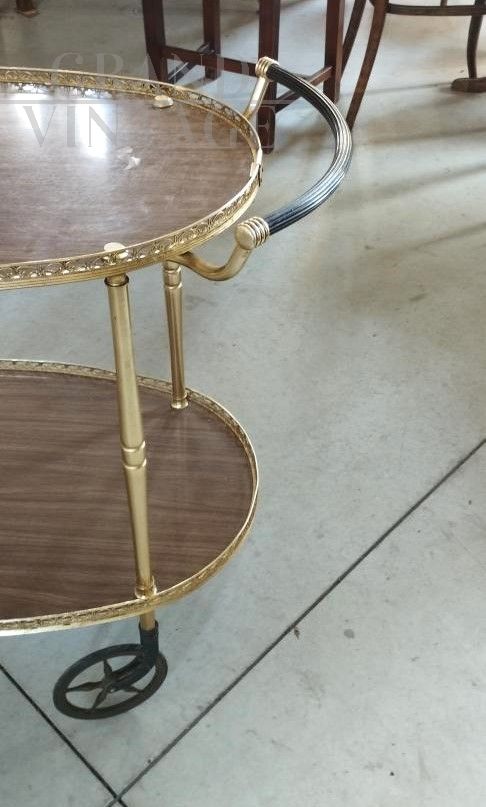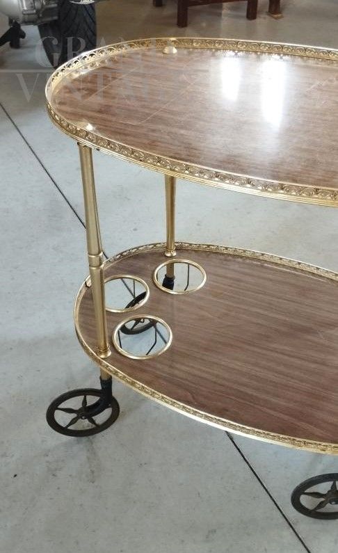 Carrello bar portavivande vintage in ottone dorato e palissandro con portabottiglie, anni '60.
