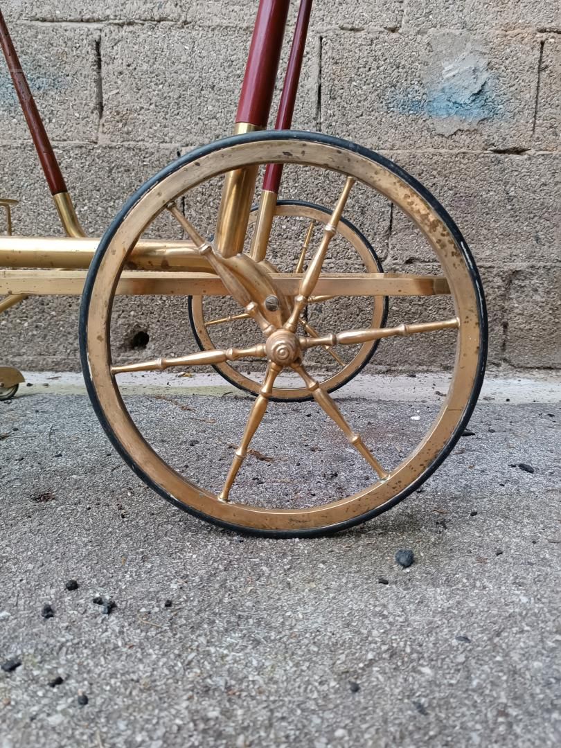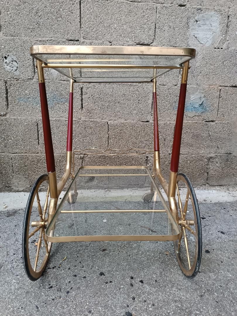 Carrello portavivande design di Cesare Lacca in ottone, con 2 ripiani in vetro e grandi ruote anch'esse in ottone. Articolo dalla linea elegante capace di sposare qualsiasi ambiente, dal più classico al più moderno. Anni '50, con segni del tempo ma bellissimo e resistente, buone condizioni.
