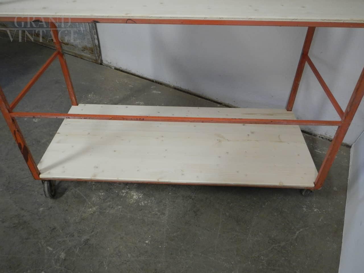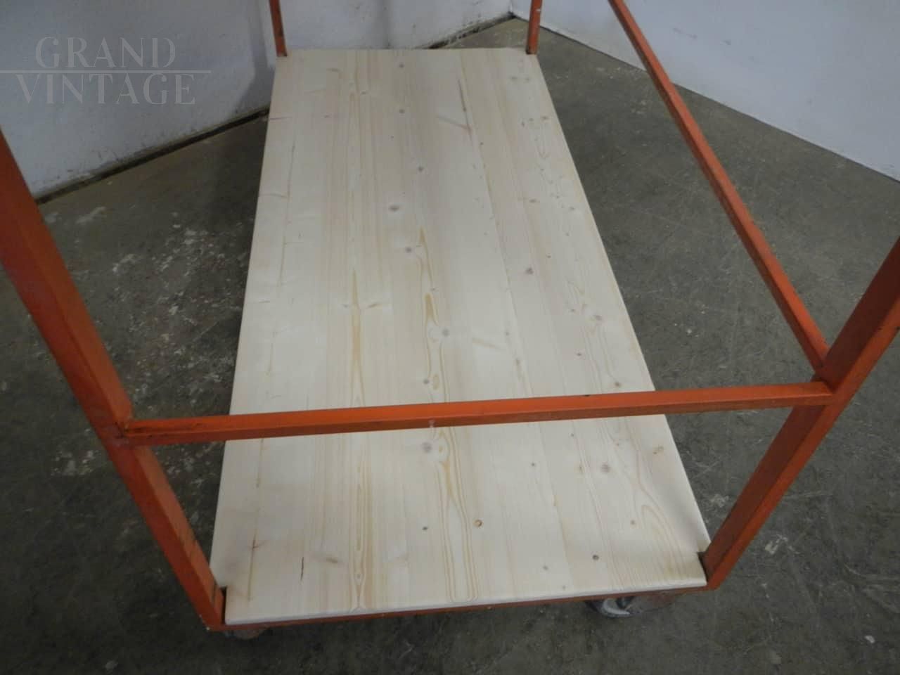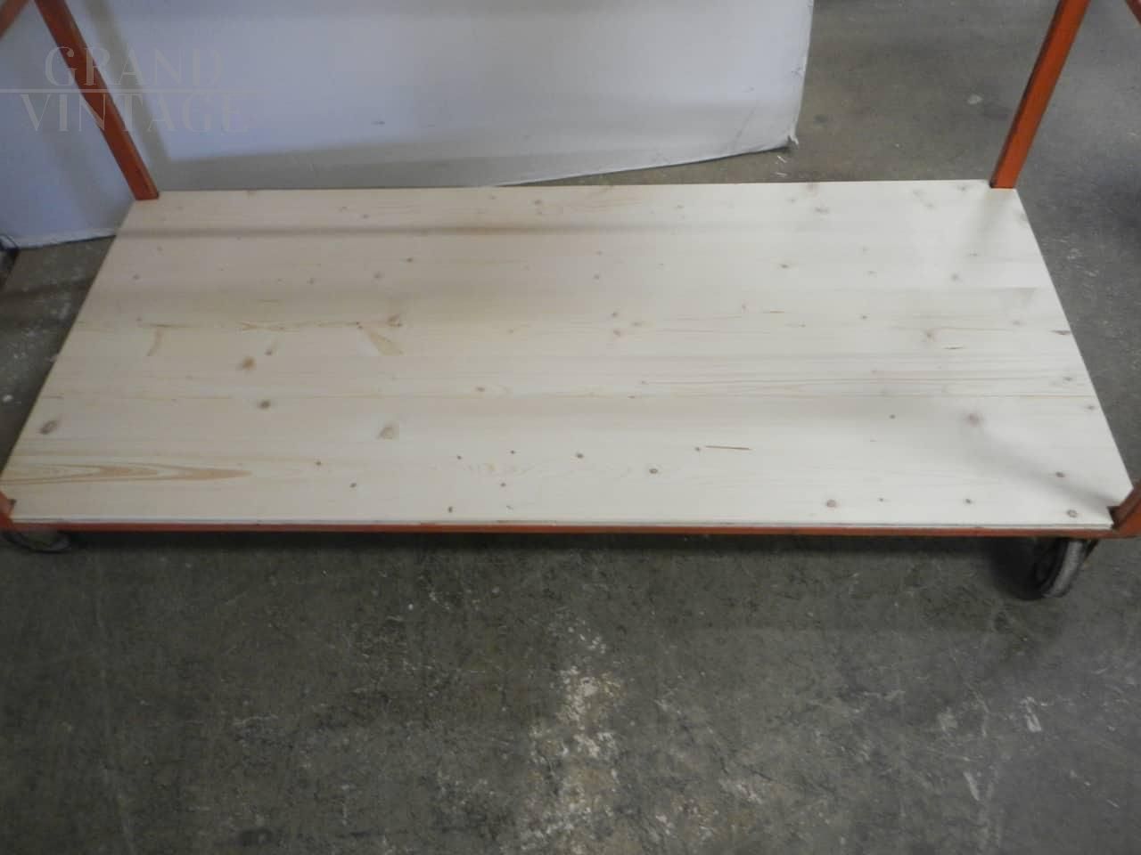 Carrello scaffale industriale in legno e metallo arancione, anni '70