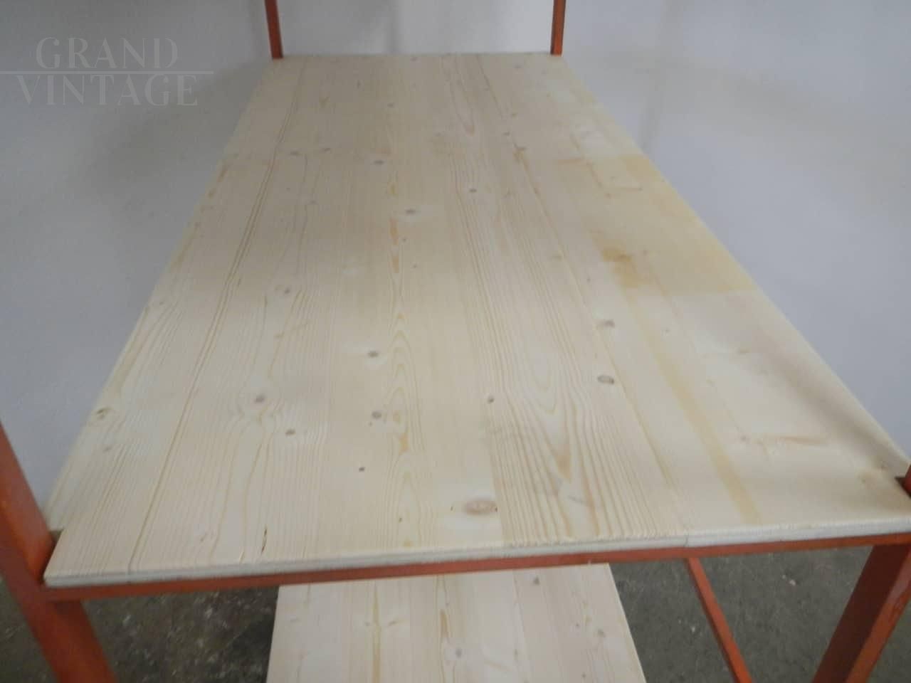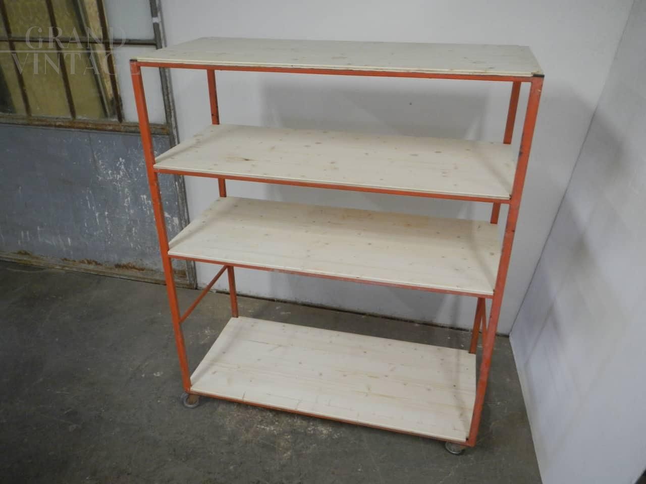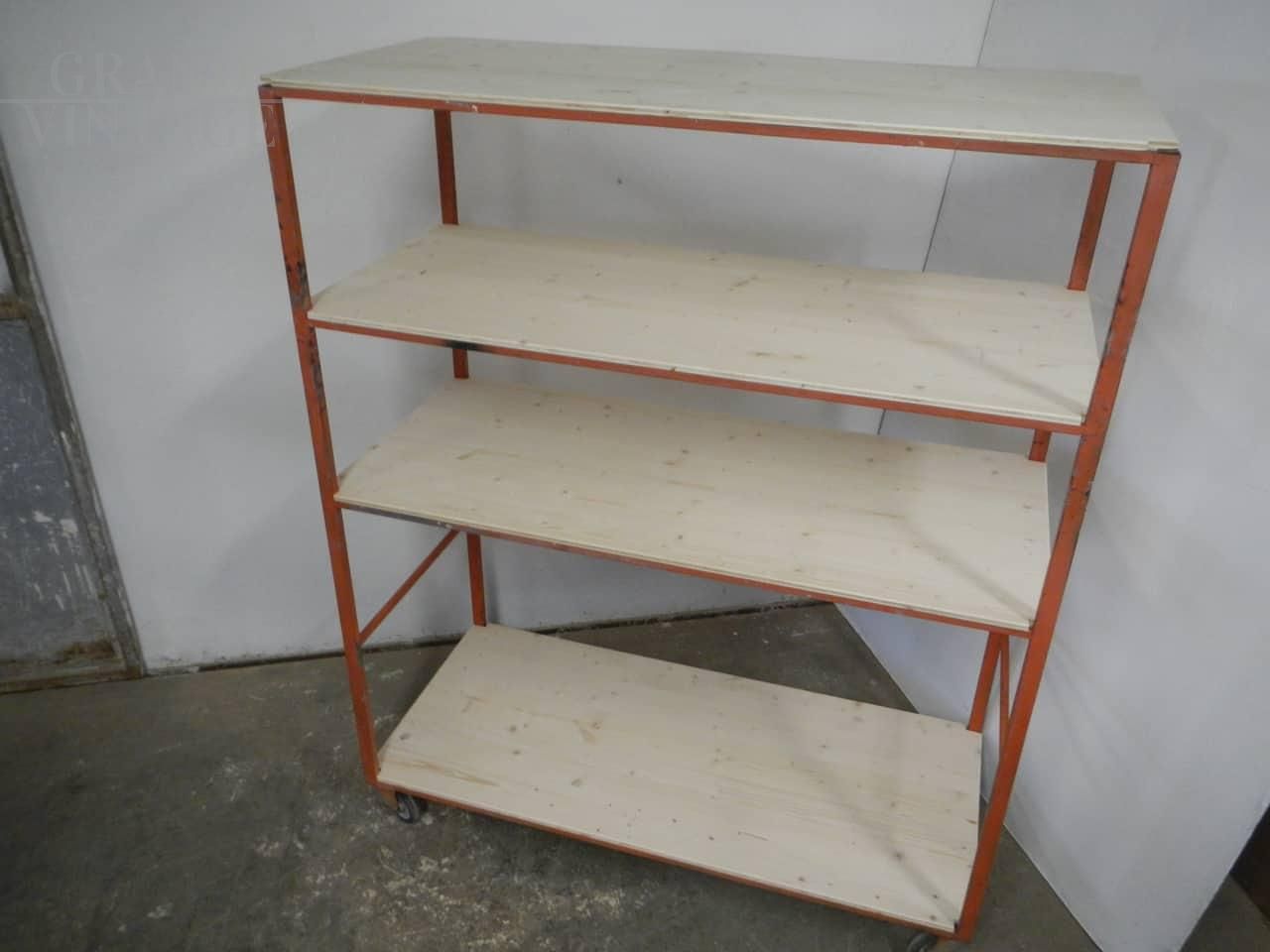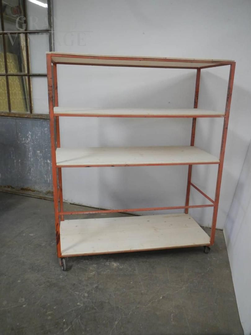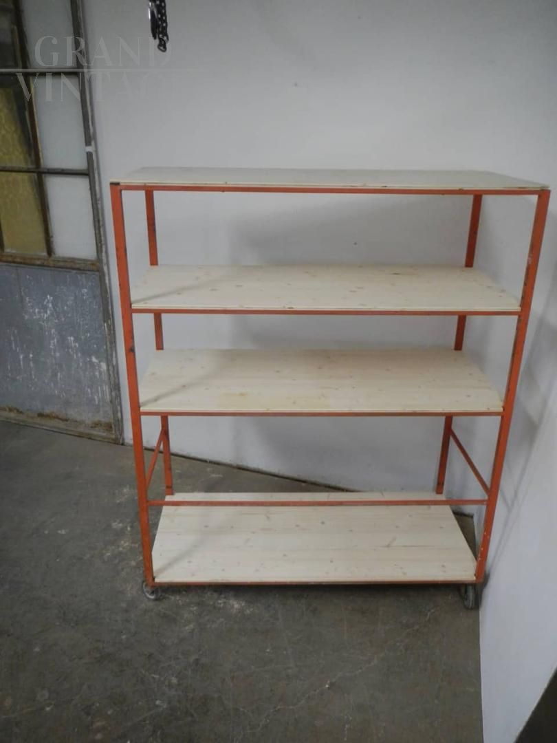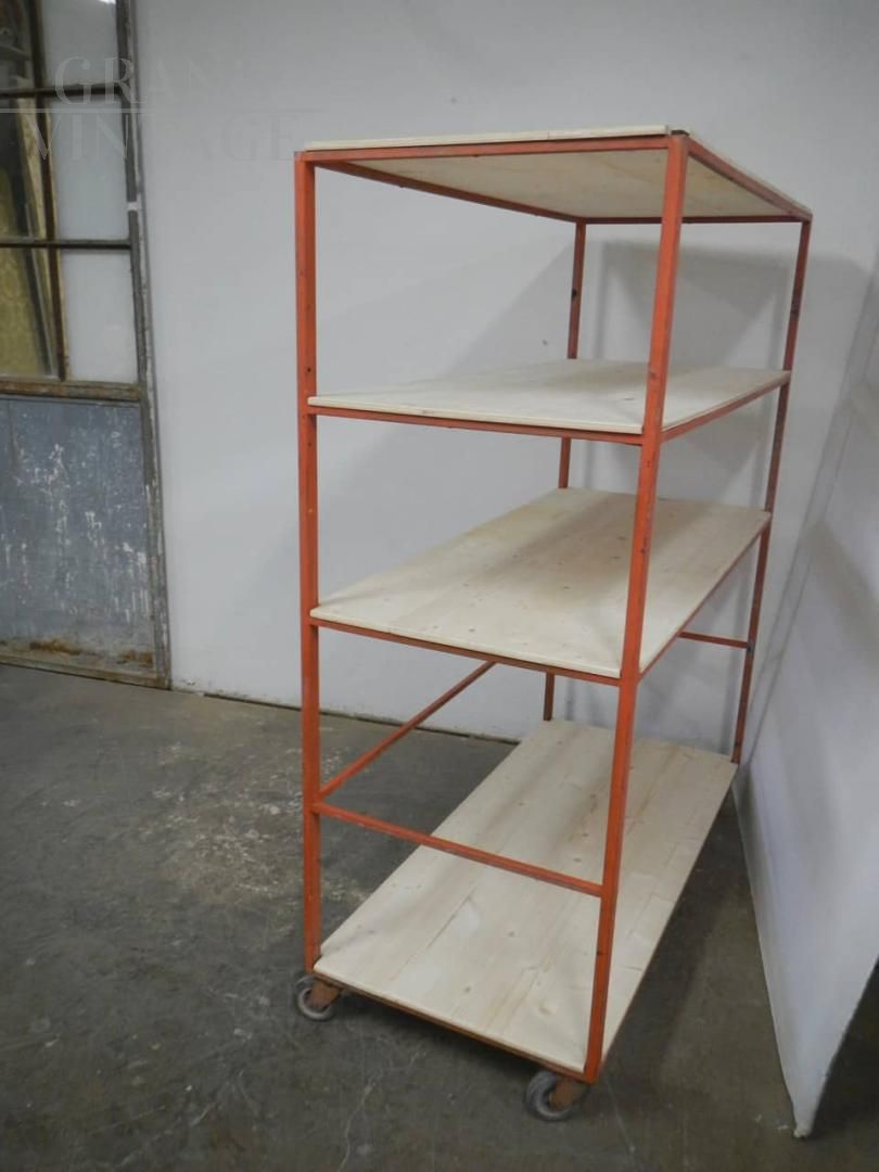 Scaffale carrello industriale da ceramista con struttura in ferro laccato arancione e con 4 ripiani in legno di abete naturale. Lo spazio fra i ripiani superiori è di cm 34 - 35, e nella parte inferiore è di 71 cm. Ruote originali, la struttura in ferro presenta i naturali segni d’uso. Disponibili 2 pezzi, il prezzo si riferisce al singolo pezzo.