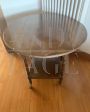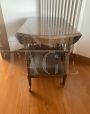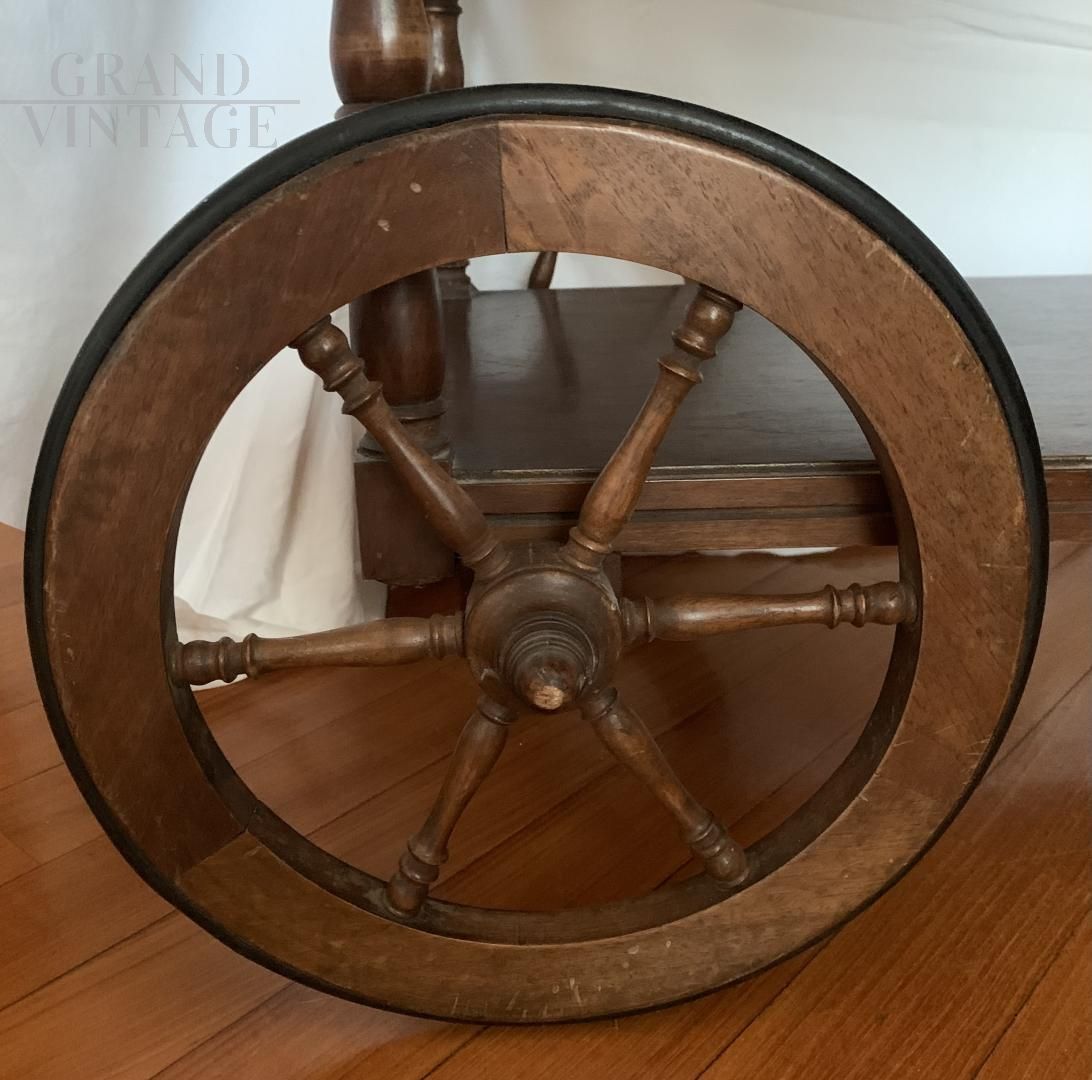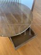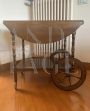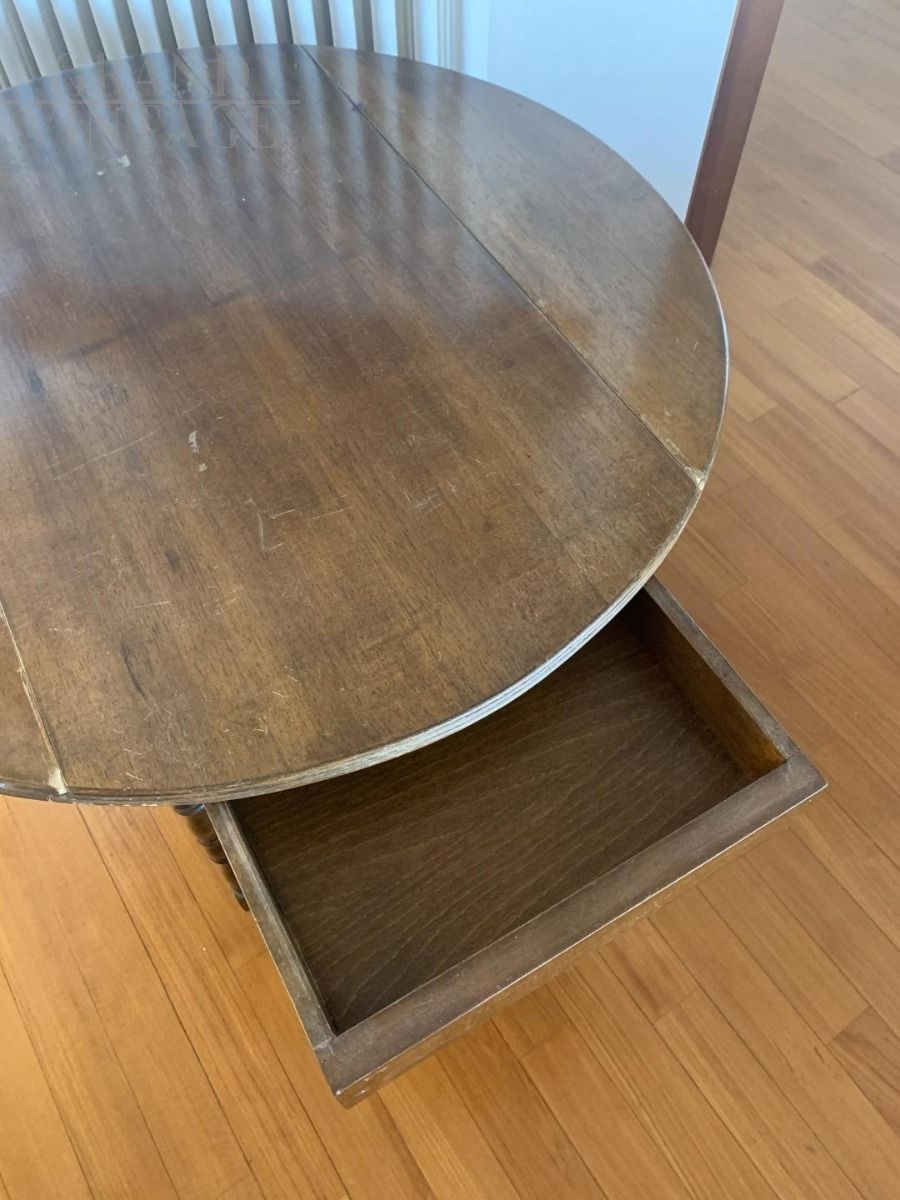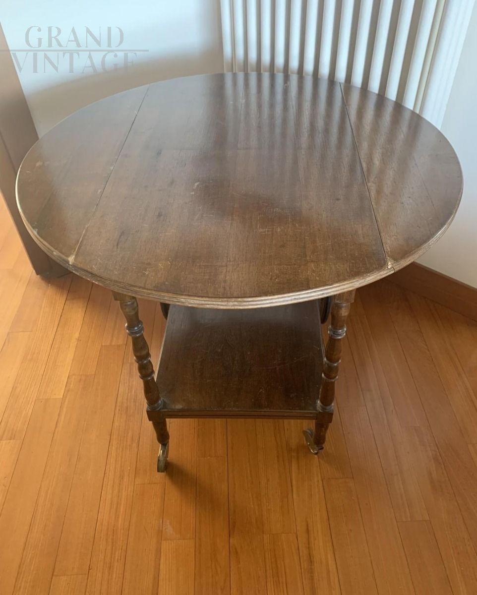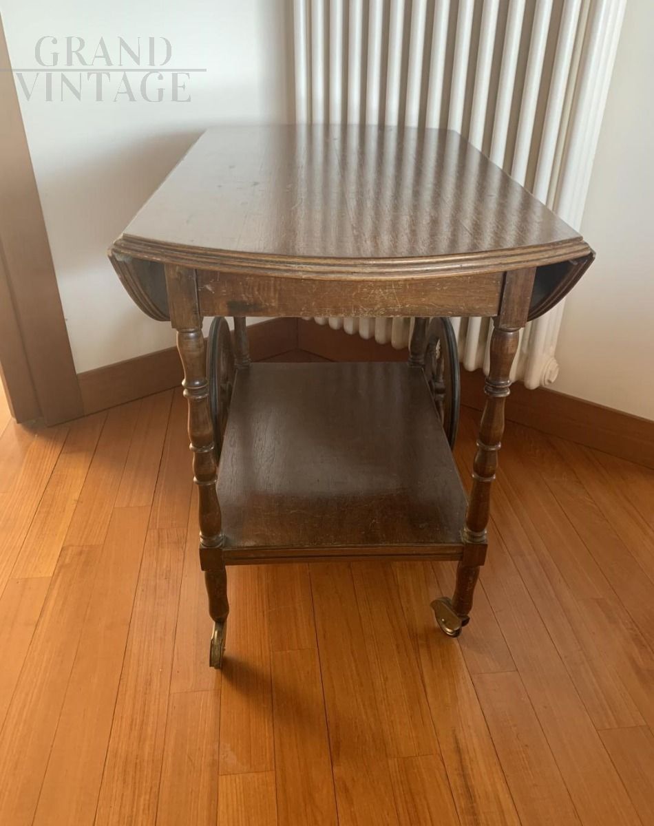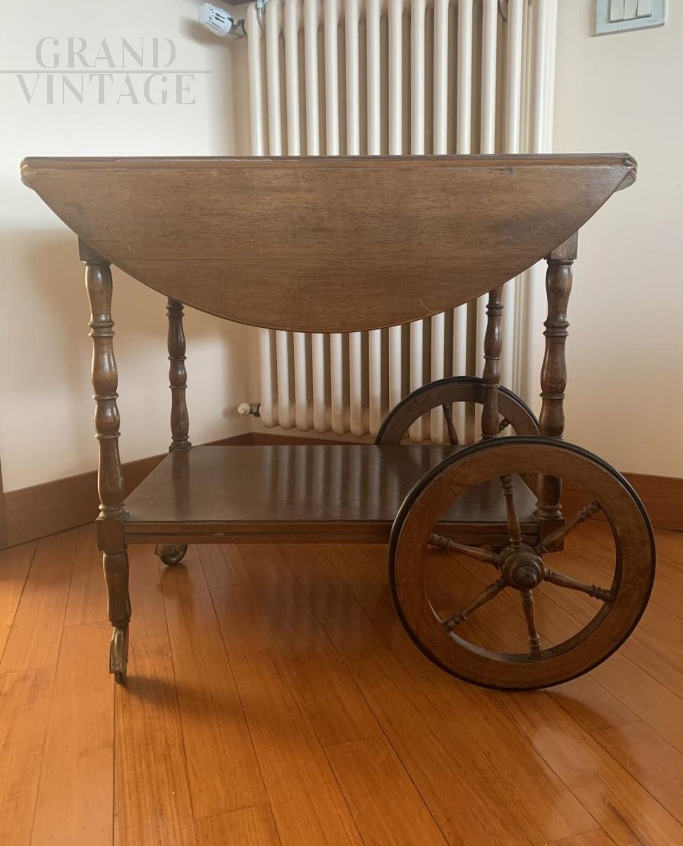 Carrello tavolino anni '60 con cassetto e bandelle per allargare la superficie del piano, che aperto ha un diametro di 78 cm.