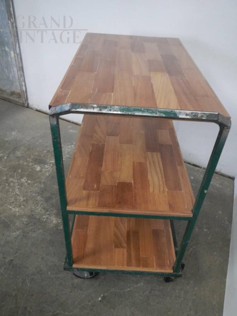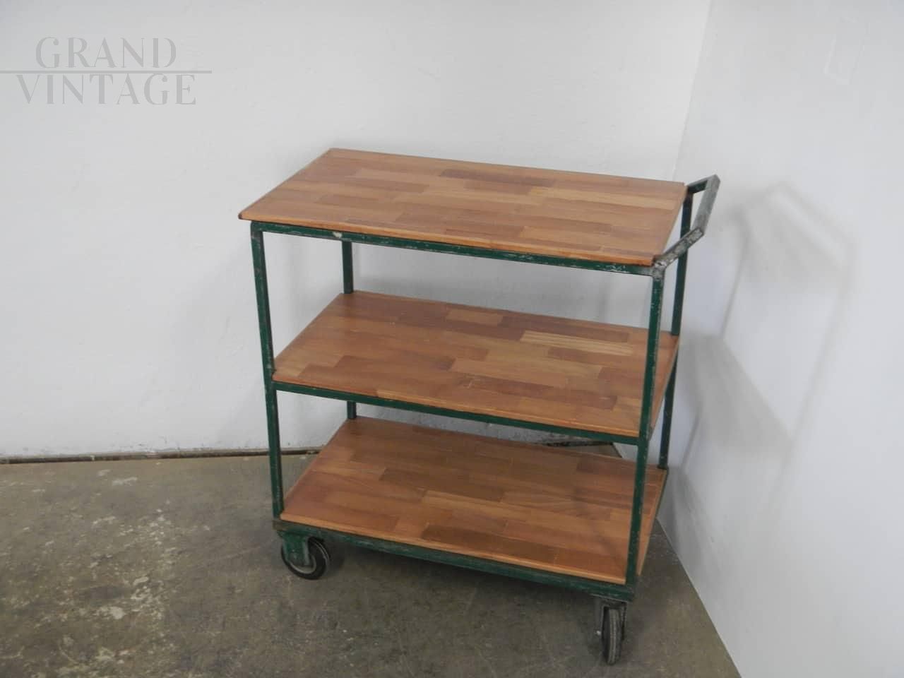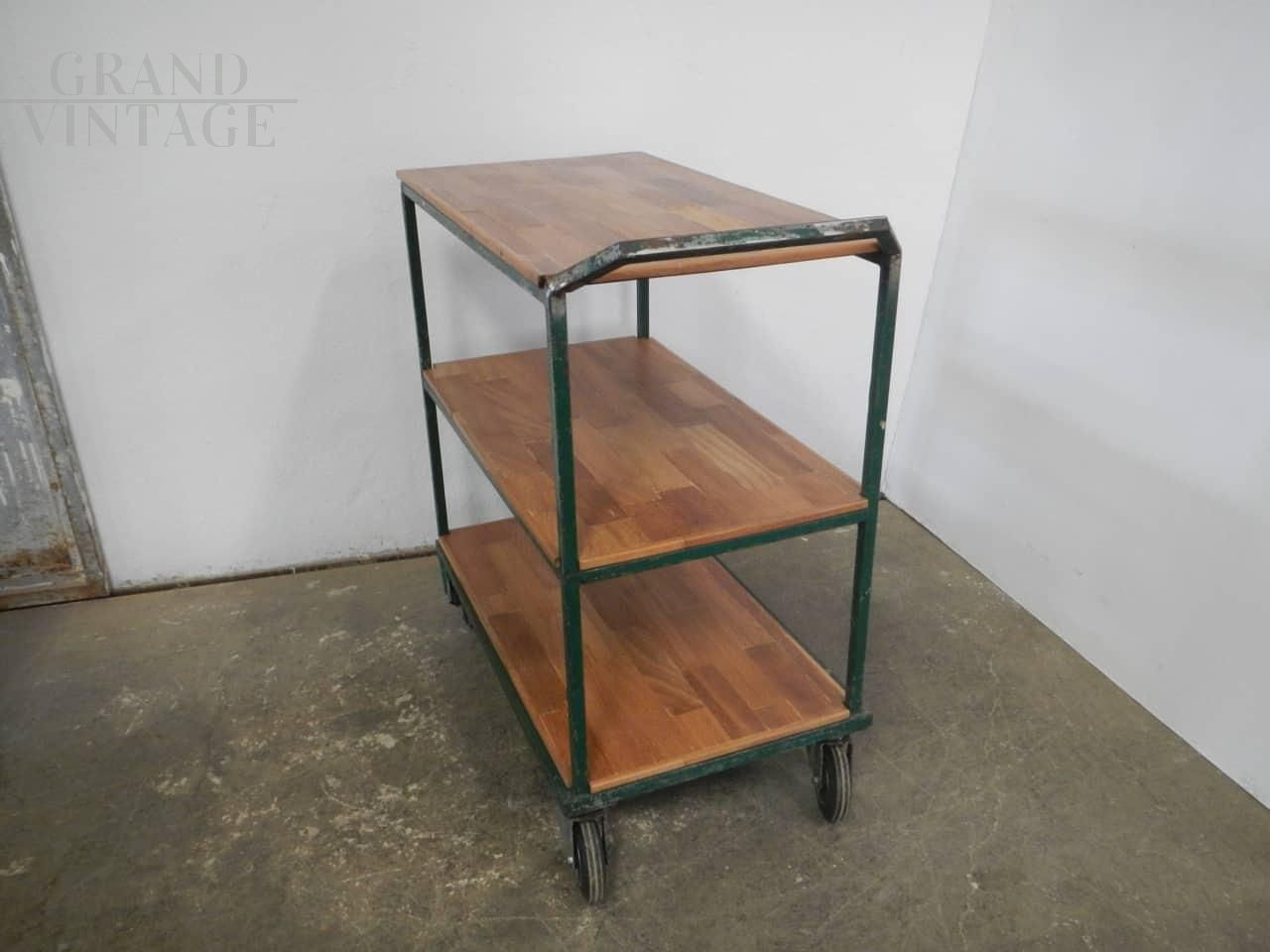 Carrello industriale da officina in ferro colorato verde con ripiani in legno di quercia. La distanza tra i ripiani è di cm 32, e le mensole sono lunghe cm 82 - 83. Dotato di manico per lo spostamento. Le ruote sono originali: le anteriori sono girevoli, le posteriori fisse. Trattato con vernice da ferro.