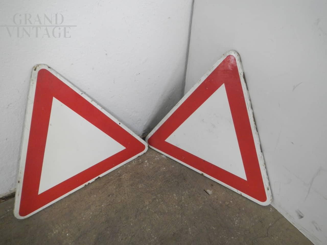 Insegna vintage italiana con indicazione di dare precedenza, anni '70, in buone condizioni con naturali segni d’uso. Disponibili 2 pezzi.