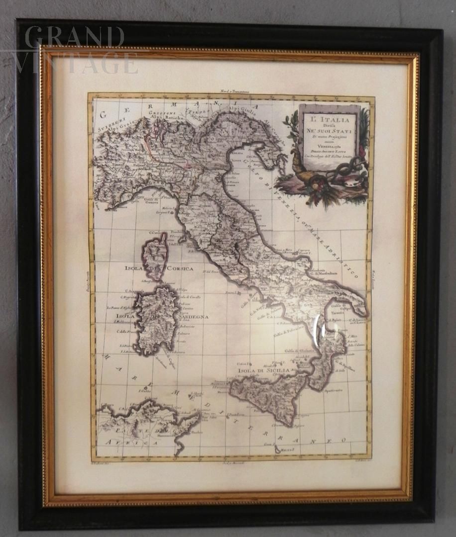 Cartografia pregiata dell'Italia e i suoi Stati nel 1782, riproduzione artistica artigianale su cotone a 5 colori, anno 2012 - edizione limitata e numerata 96/2999. Certificato e descrizione sul retro.
