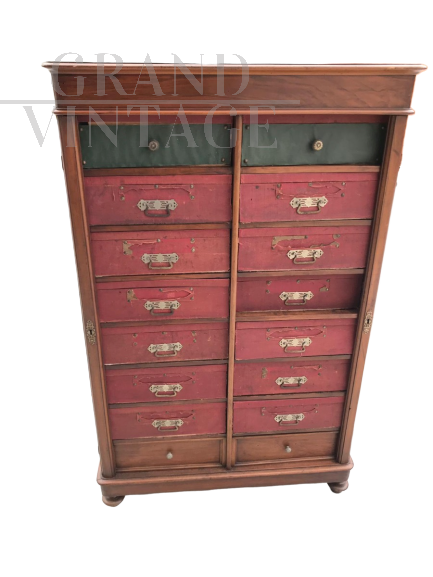 Cartonière, schedario da notaio dei primi anni 90 in legno di noce, composto da 4 cassetti foderati da stoffa e 12 contenitori singolarmente removibili e utilizzabili come valigette o come book.