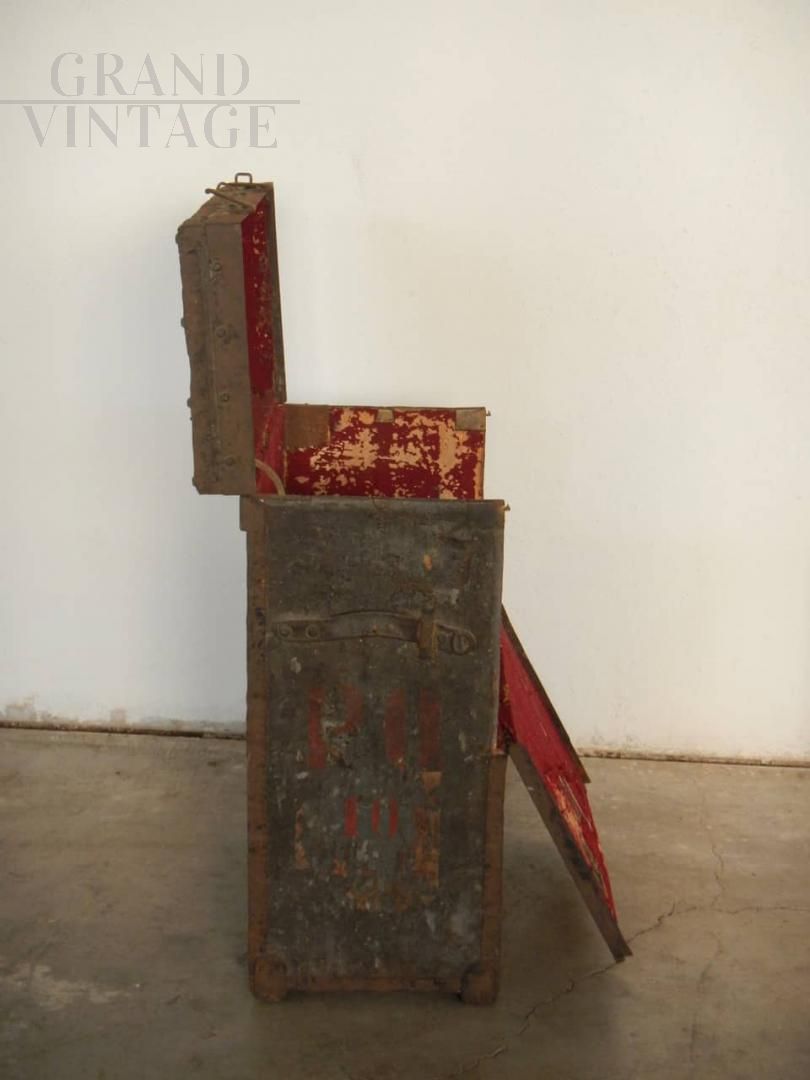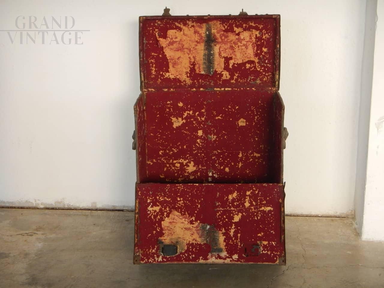 Cassa militare in legno e borchiata con lamierino e angoli in ottone. Rivestita con tessuto in velluto rosso (volendo da sostituire), chiusure in ottone con firma del costruttore.