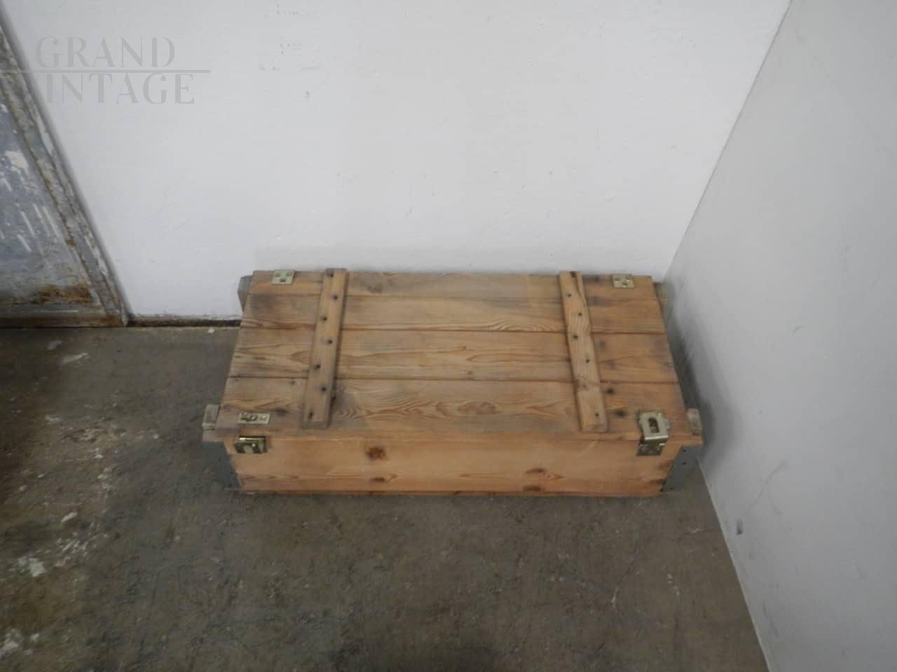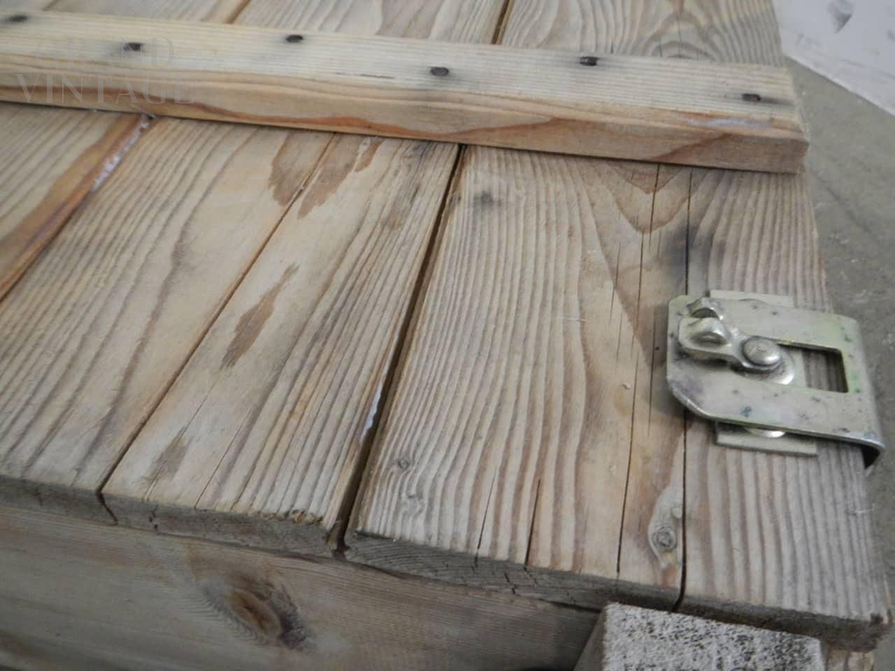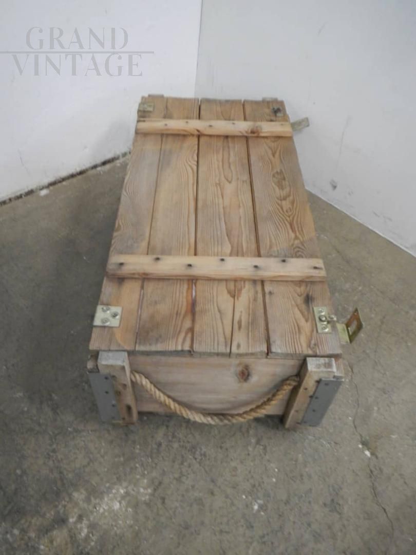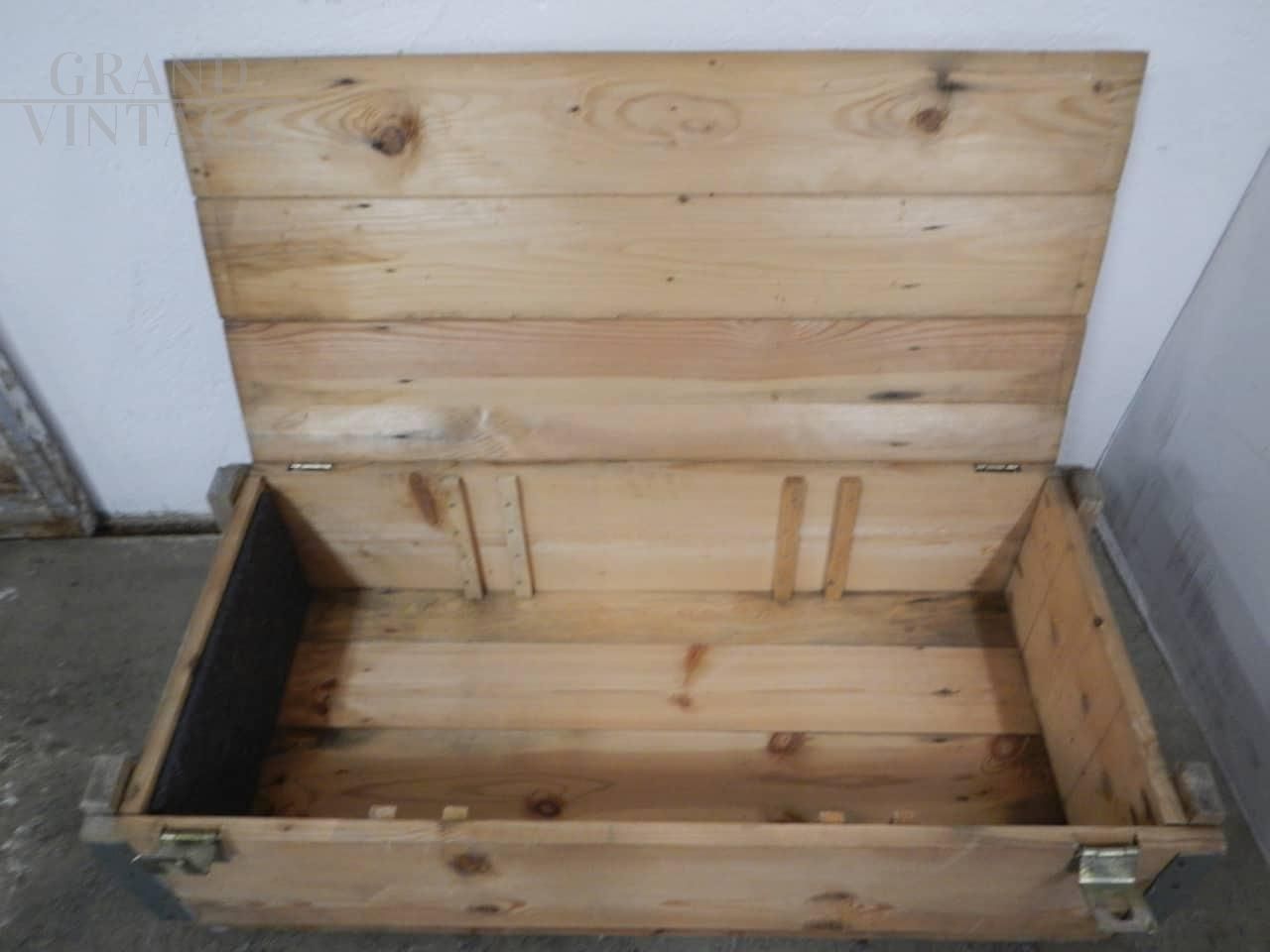 Cassa in legno di abete a listelli con manici in corda, vintage anni '80, chiusura particolare con cerniere. In buone condizioni.