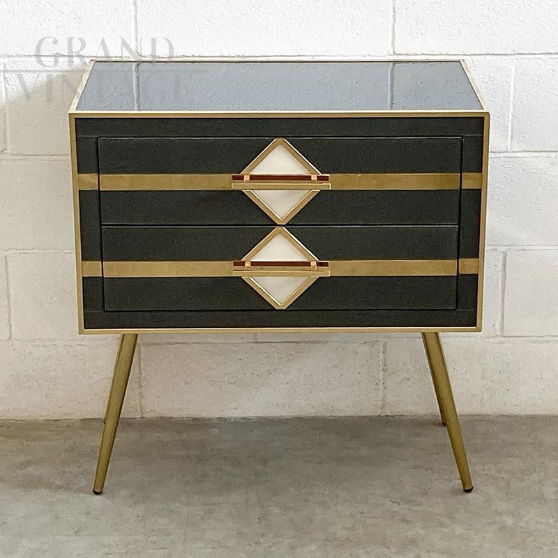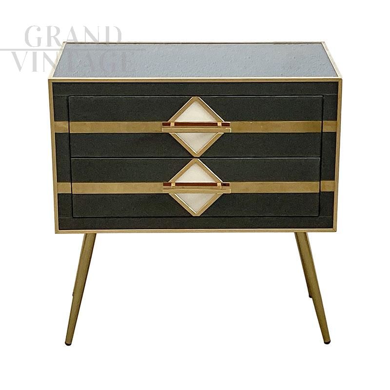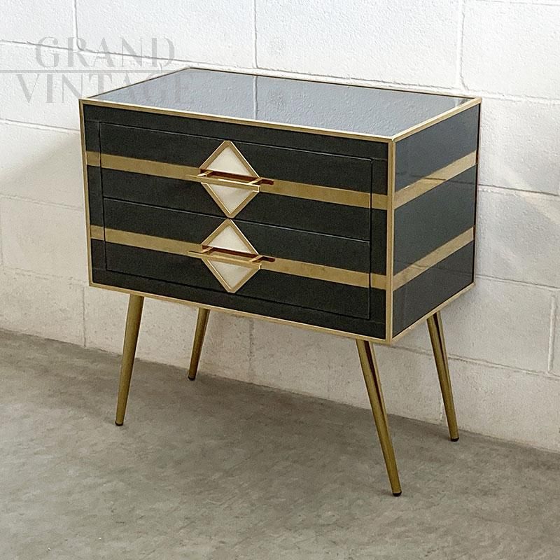 Cassettiera a due cassetti in vetro nero e ottone