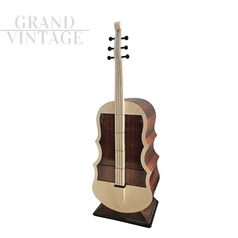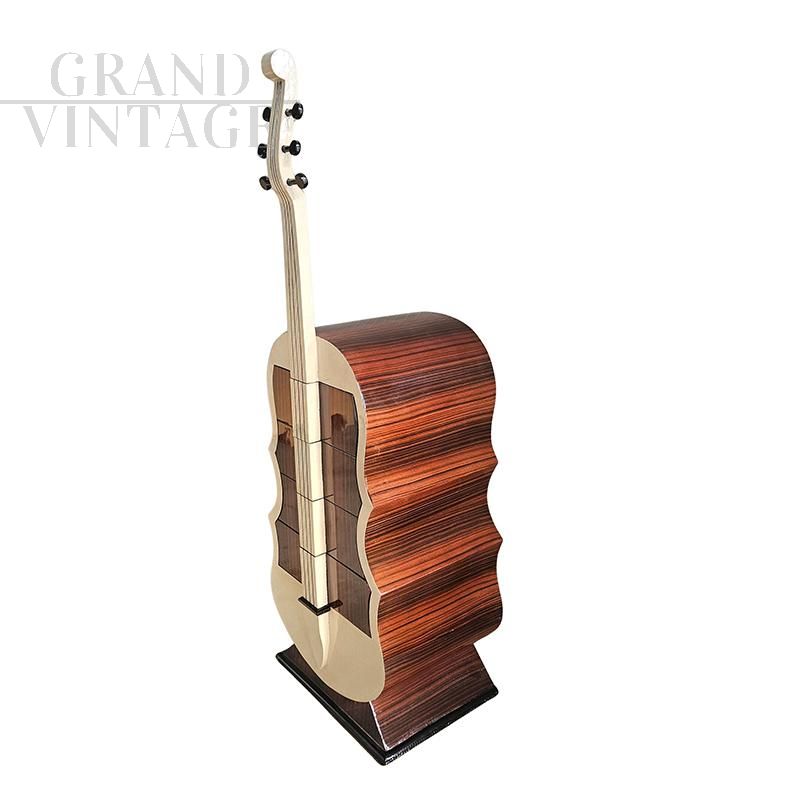Cassettiera in stile art déco con forma di violino o contrabbasso realizzata in radica e pergamena, dotata di 4 cassetti.