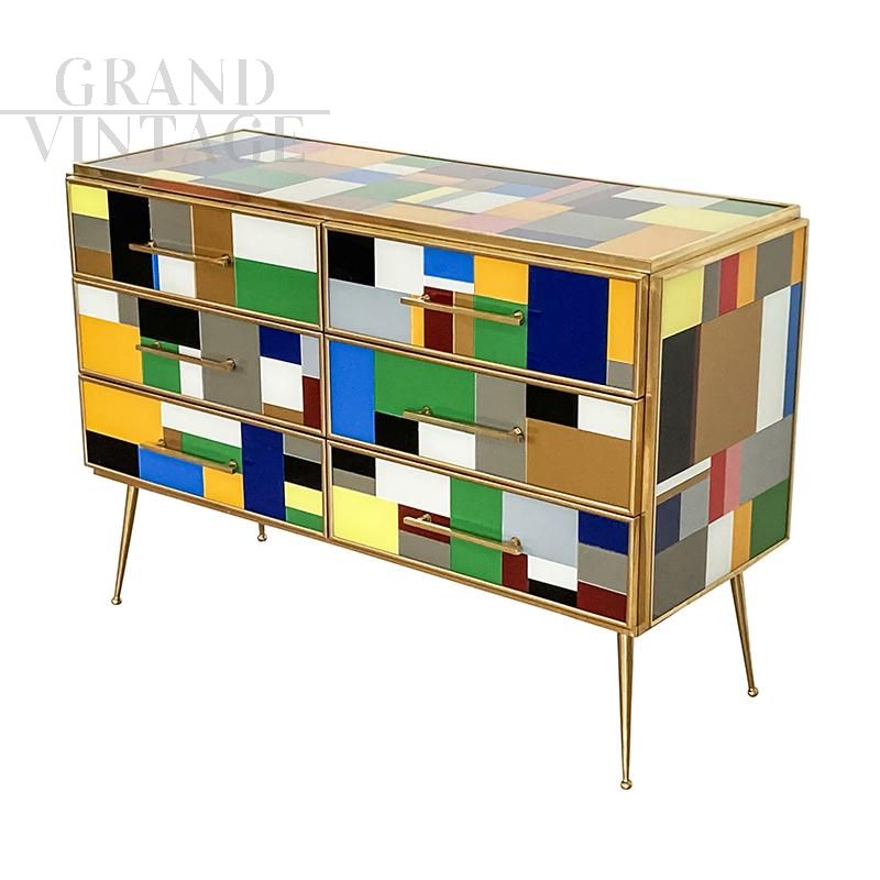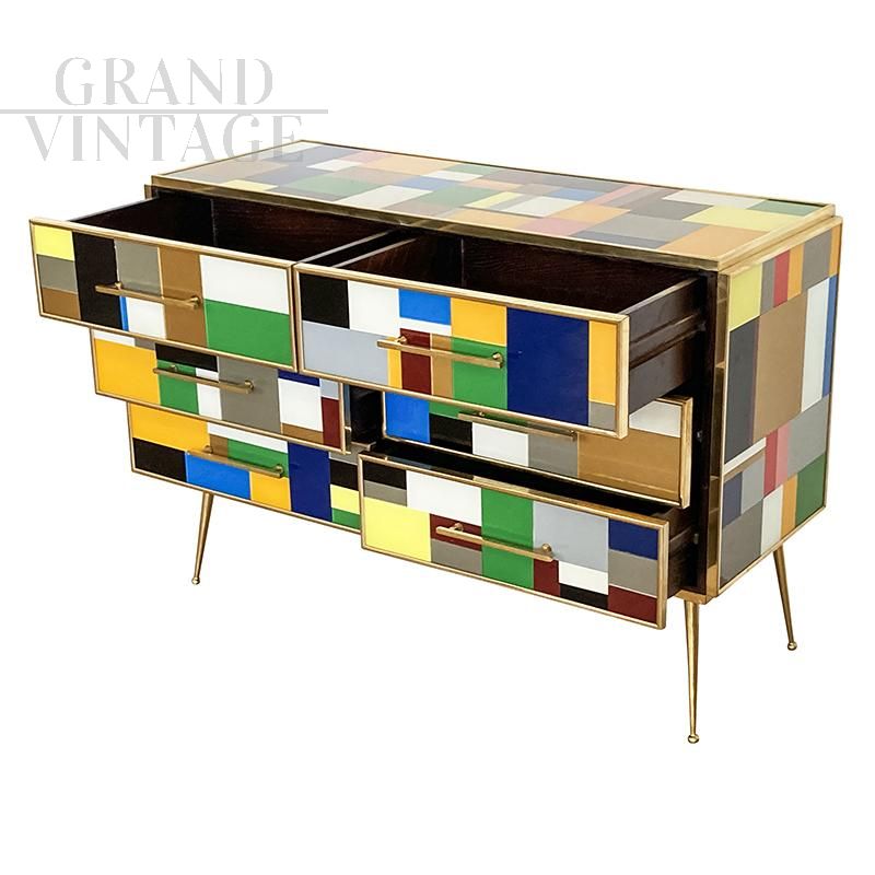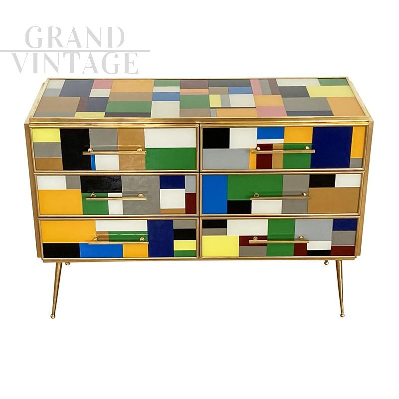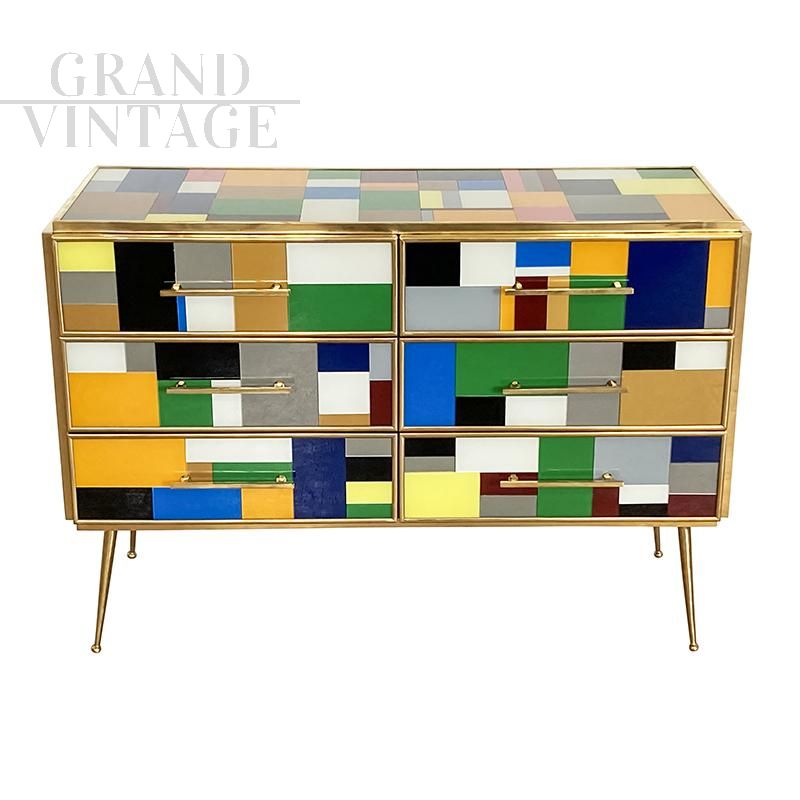 Comò con sei cassetti, interamente realizzato a mano con struttura in legno rivestita con tessere in vetro di Murano multicolore, con profili, maniglie e piedi in ottone dorato.