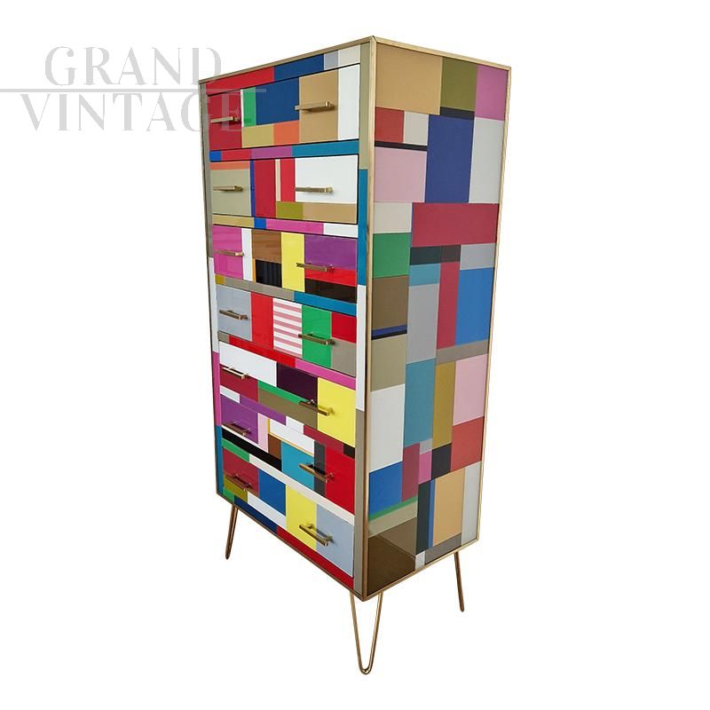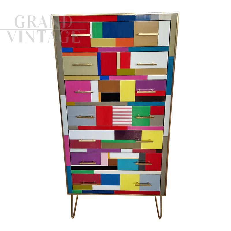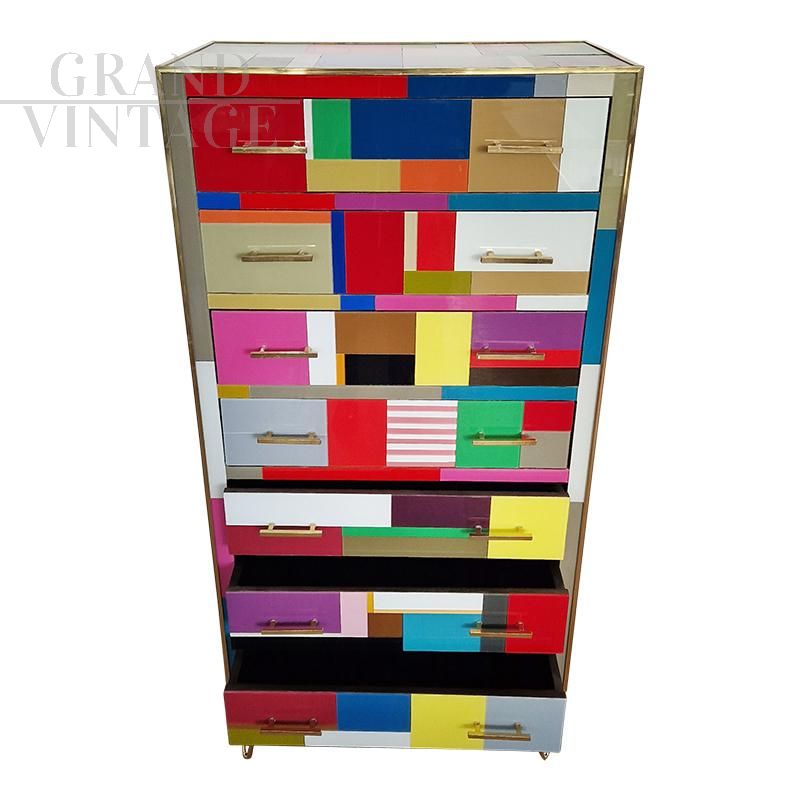 Cassettiera settimanale interamente realizzata a mano, con struttura in legno rivestita in vetro colorato; profili, maniglie e piedi in ottone dorato.