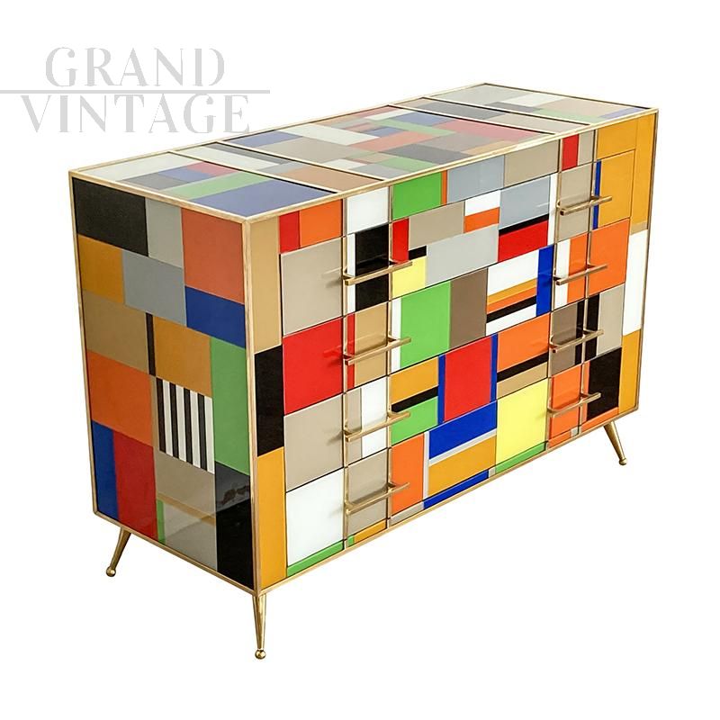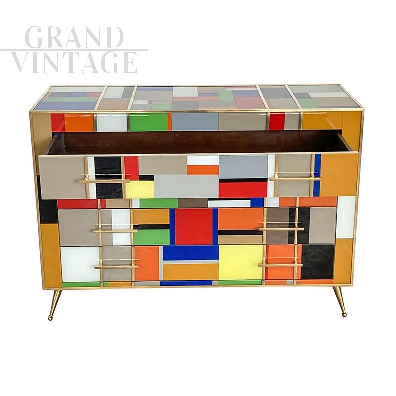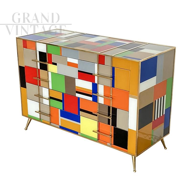 Comò cassettiera con quattro cassetti, interamente realizzato a mano con struttura in legno rivestita con tessere in vetro di Murano multicolore, e con profili, maniglie e piedi in ottone dorato.