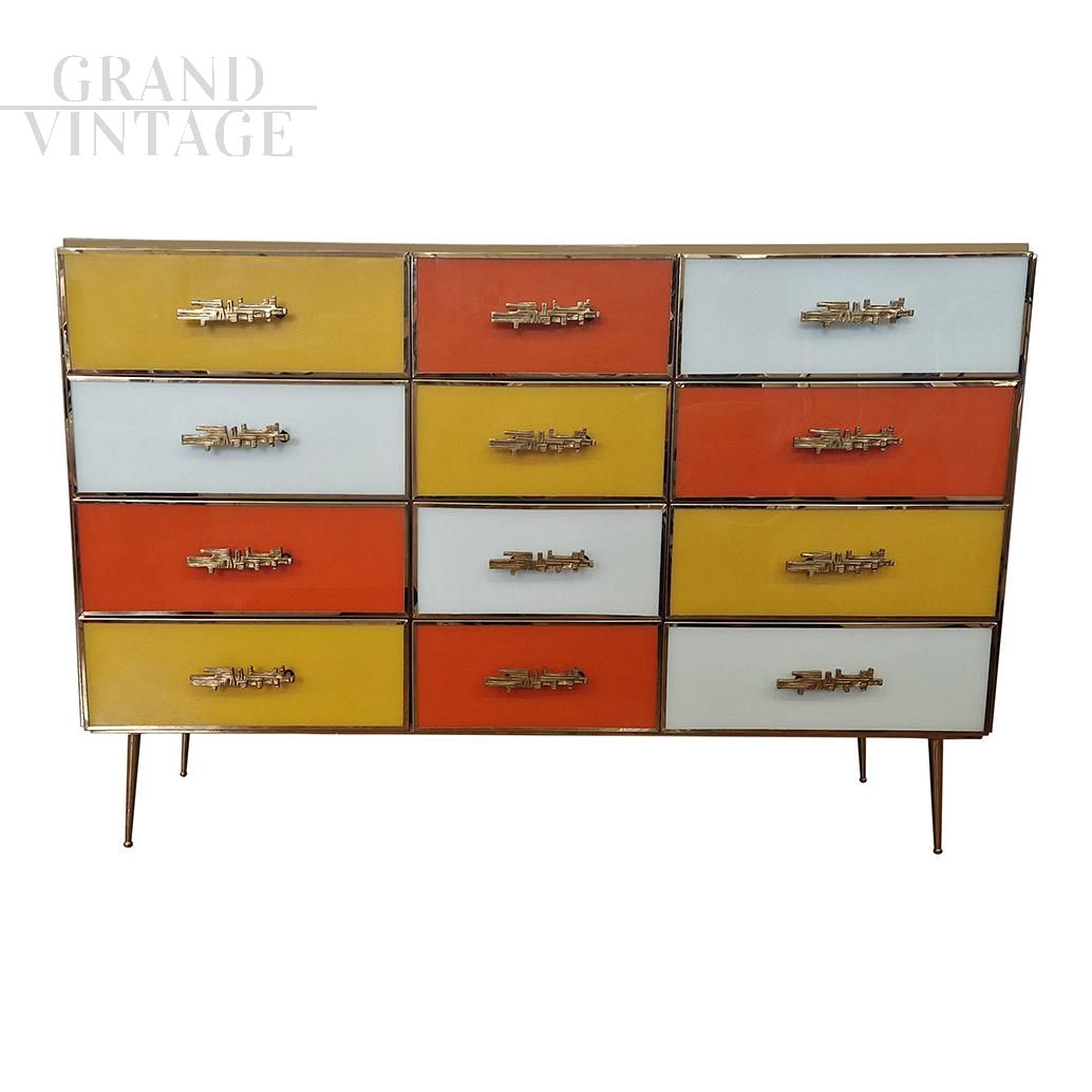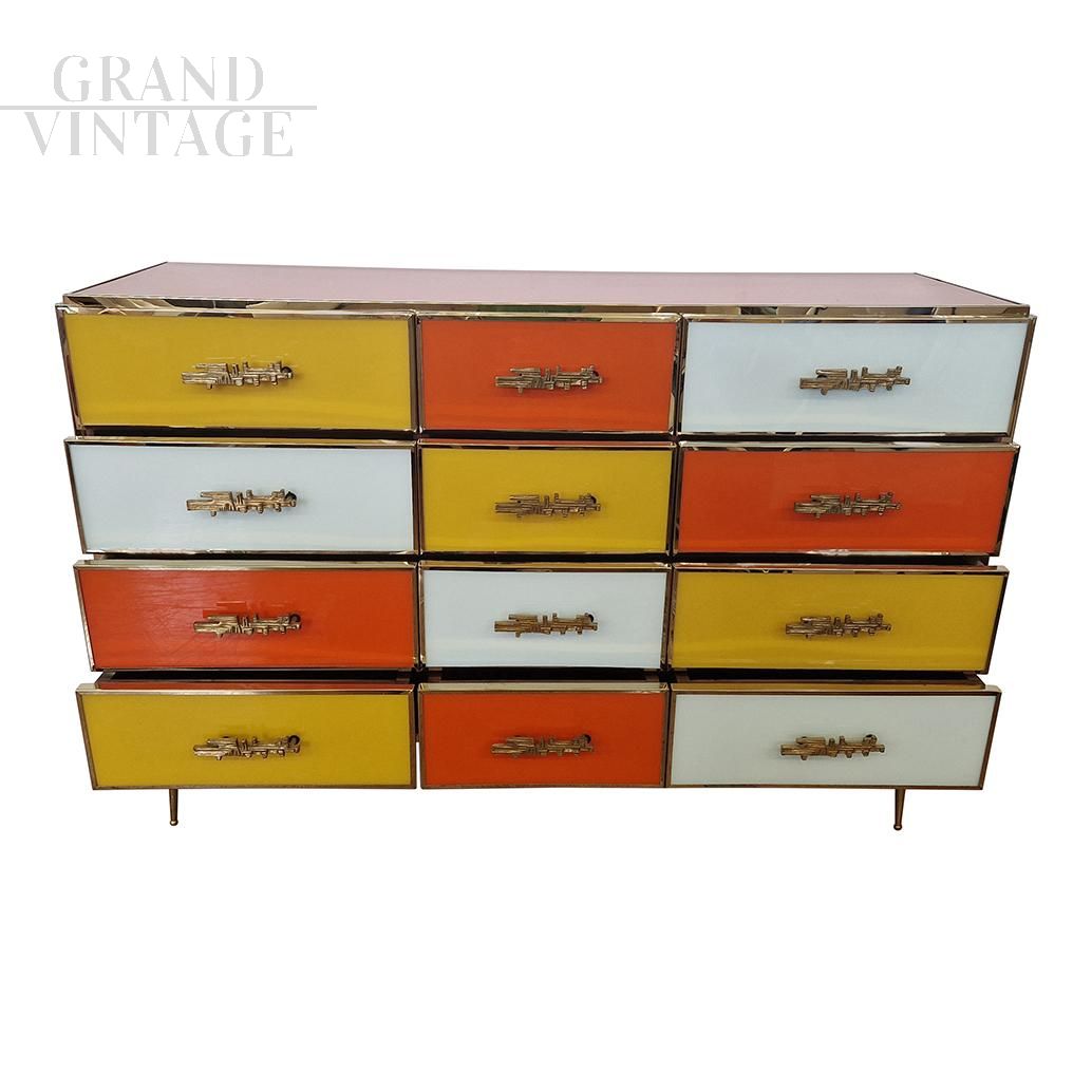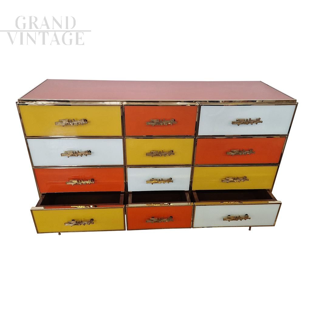 Comò cassettiera a 12 cassetti interamente realizzata a mano, con struttura in legno rivestita in vetro giallo, arancione e bianco. Profili, maniglie e piedi in ottone dorato.