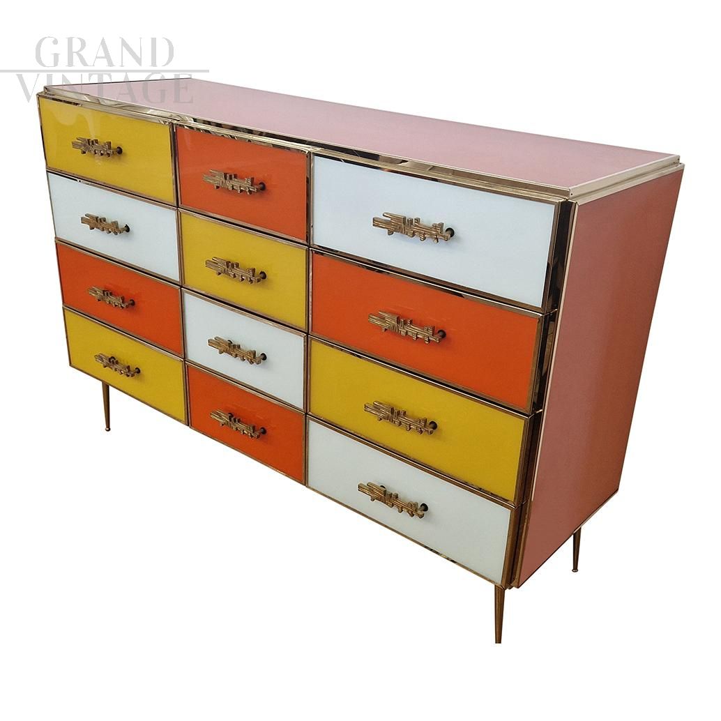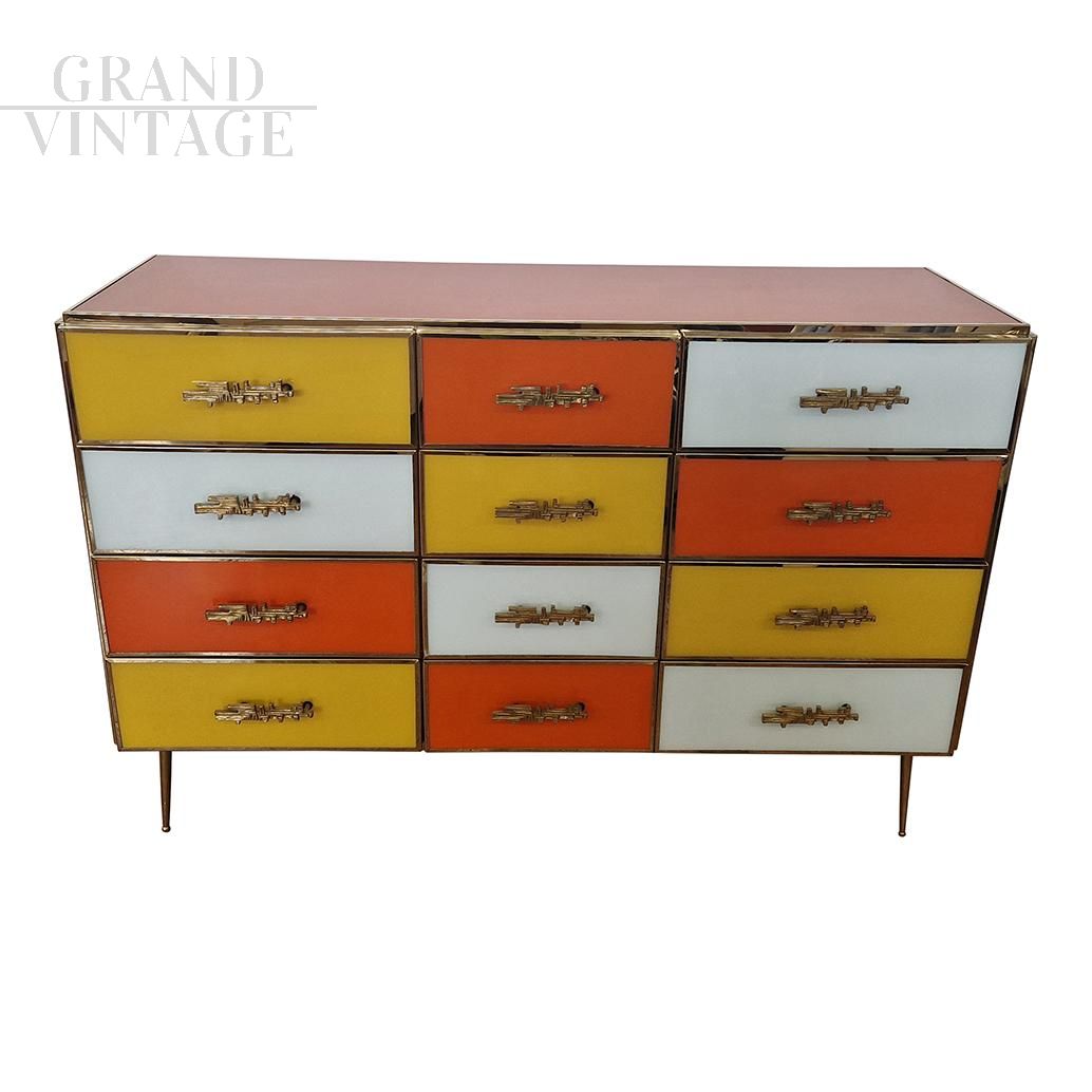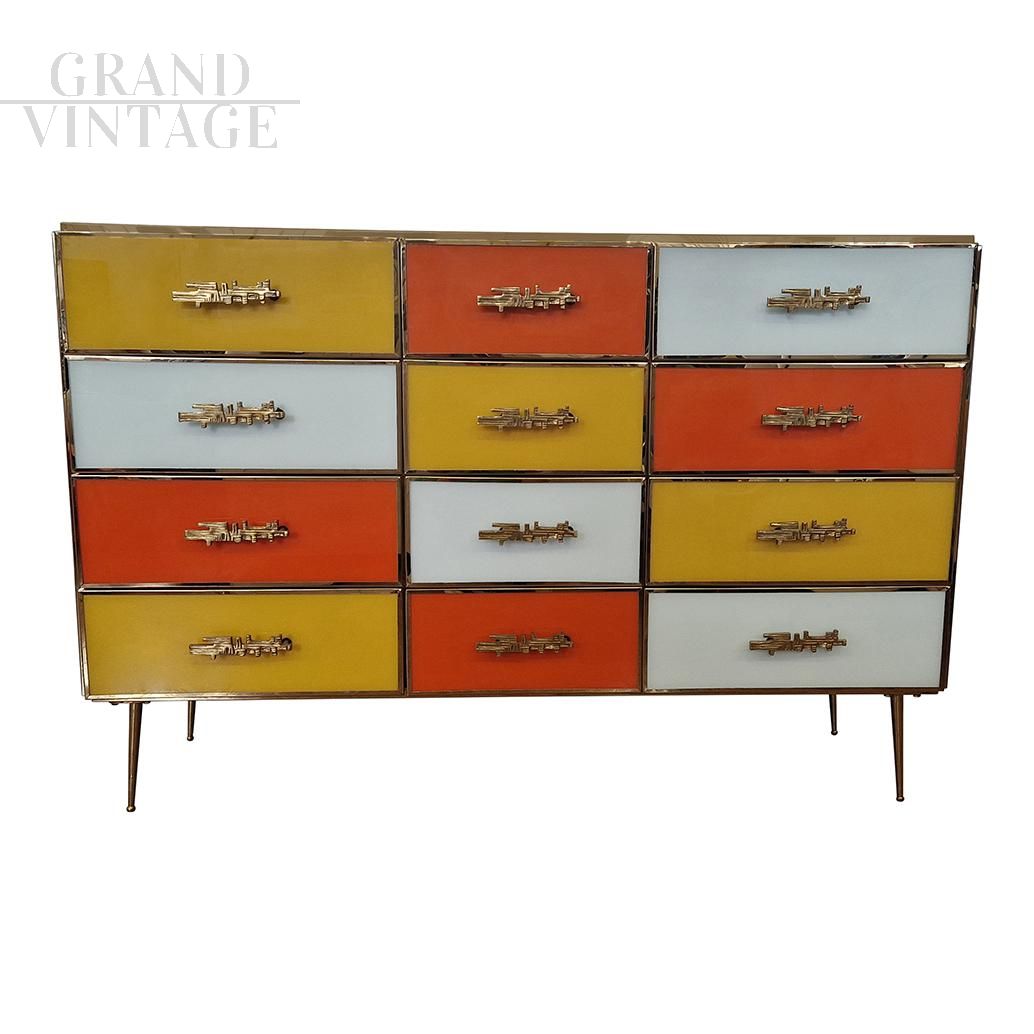 Comò cassettiera a 12 cassetti interamente realizzata a mano, con struttura in legno rivestita in vetro giallo, arancione e bianco. Profili, maniglie e piedi in ottone dorato.