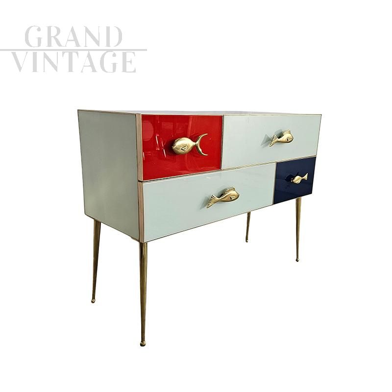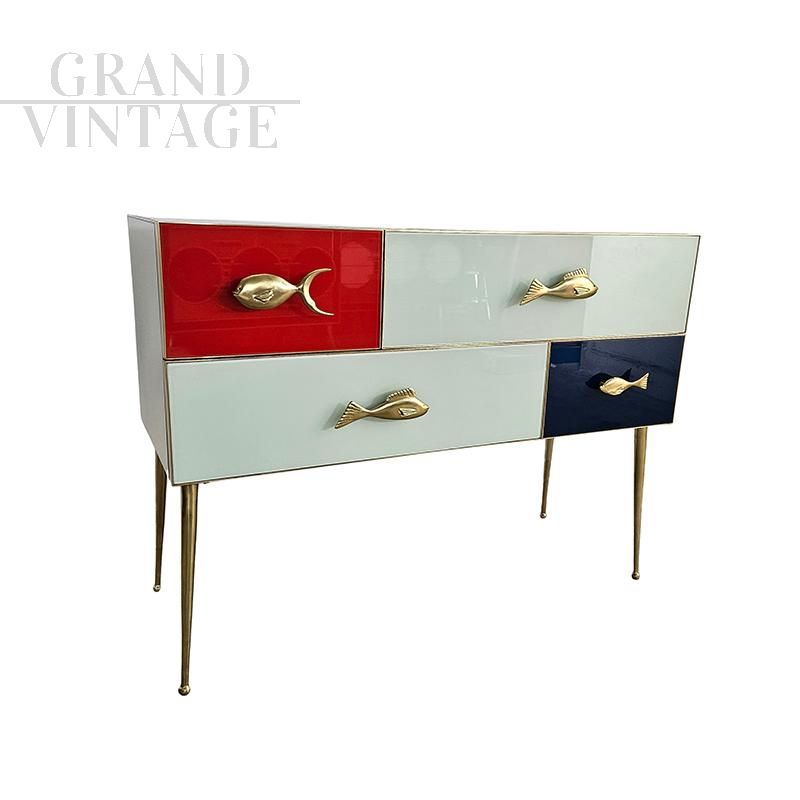 Consolle con struttura in legno, rivestita in vetro di colore bianco, blu e rosso. Profili, gambe in ottone. Arricchita con maniglie in ottone a forma di pesce. Dotata di quattro cassetti asimmetrici. Dimensioni (L x P x H) cm 120 x 45 x 90