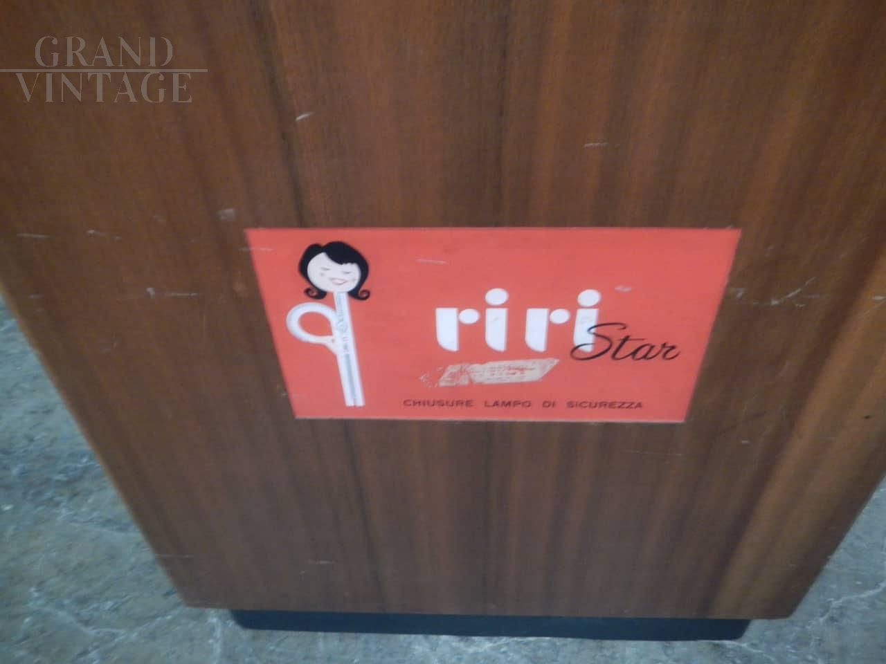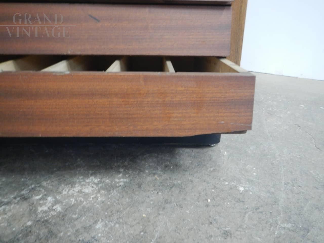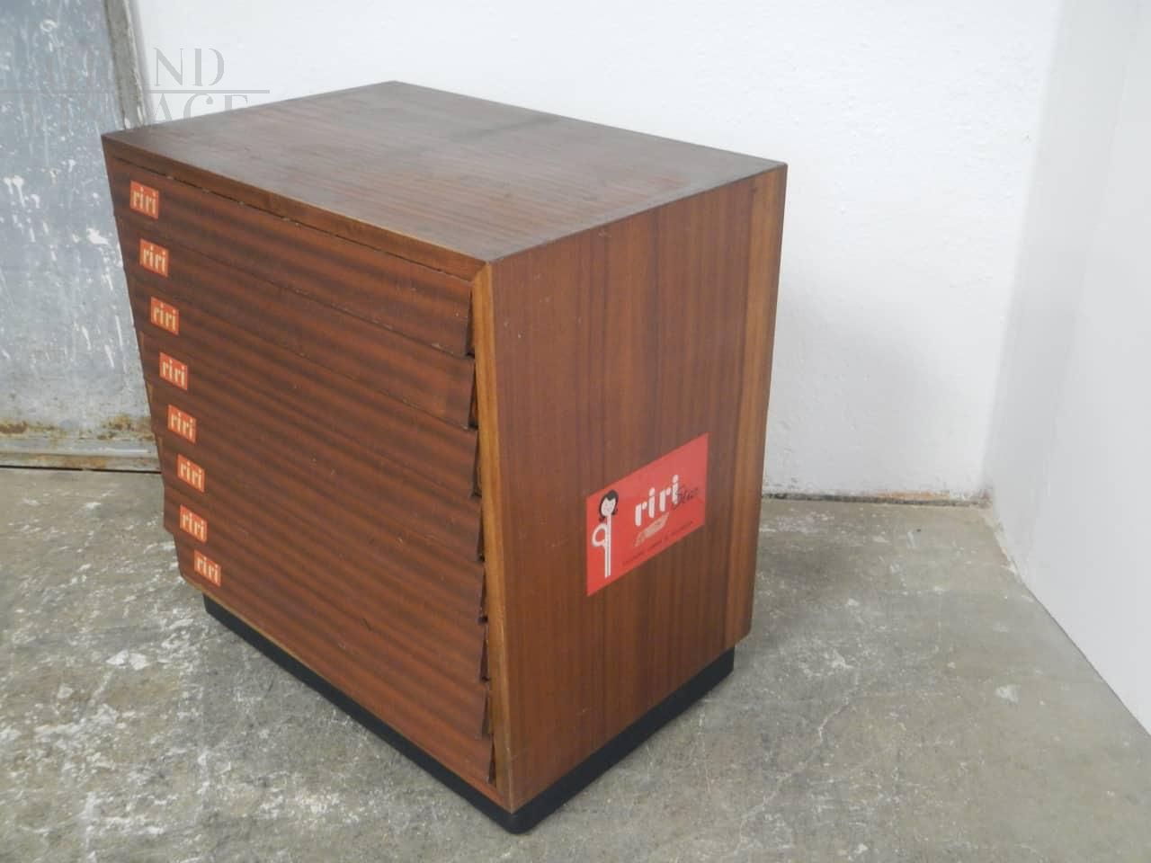 Cassettiera da merceria vintage in legno compresso rivestita in listellare di olmo, veniva utilizzata per riporre le cerniere, infatti riporta sui cassetti e sui fianchi la marca di cerniere RIRI. Dotata di 8 cassetti divisi in 8 parti di cm 8.5 di profondità. Un angolo del cassetto finale è rovinato come da foto.