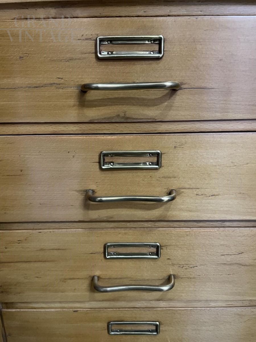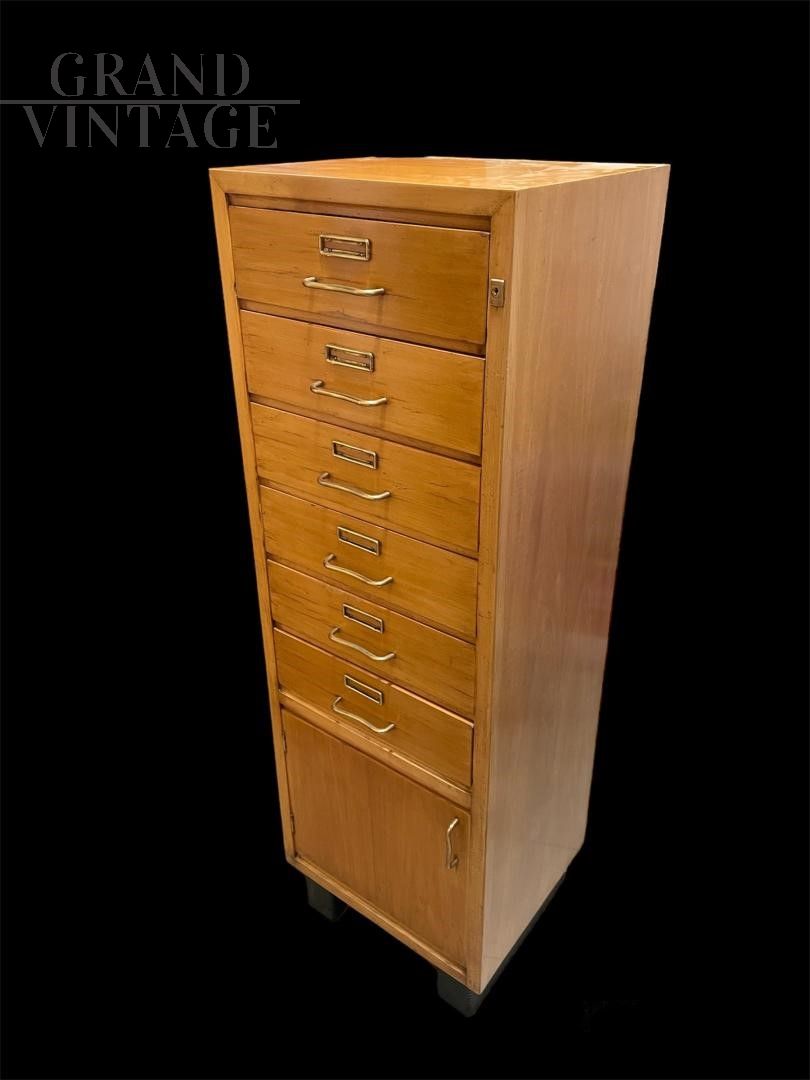 Cassettiera da ufficio classificatore vintage in legno di acero con 6 cassetti e un'anta alla base, anni '70, restaurata.