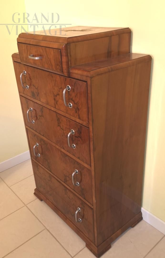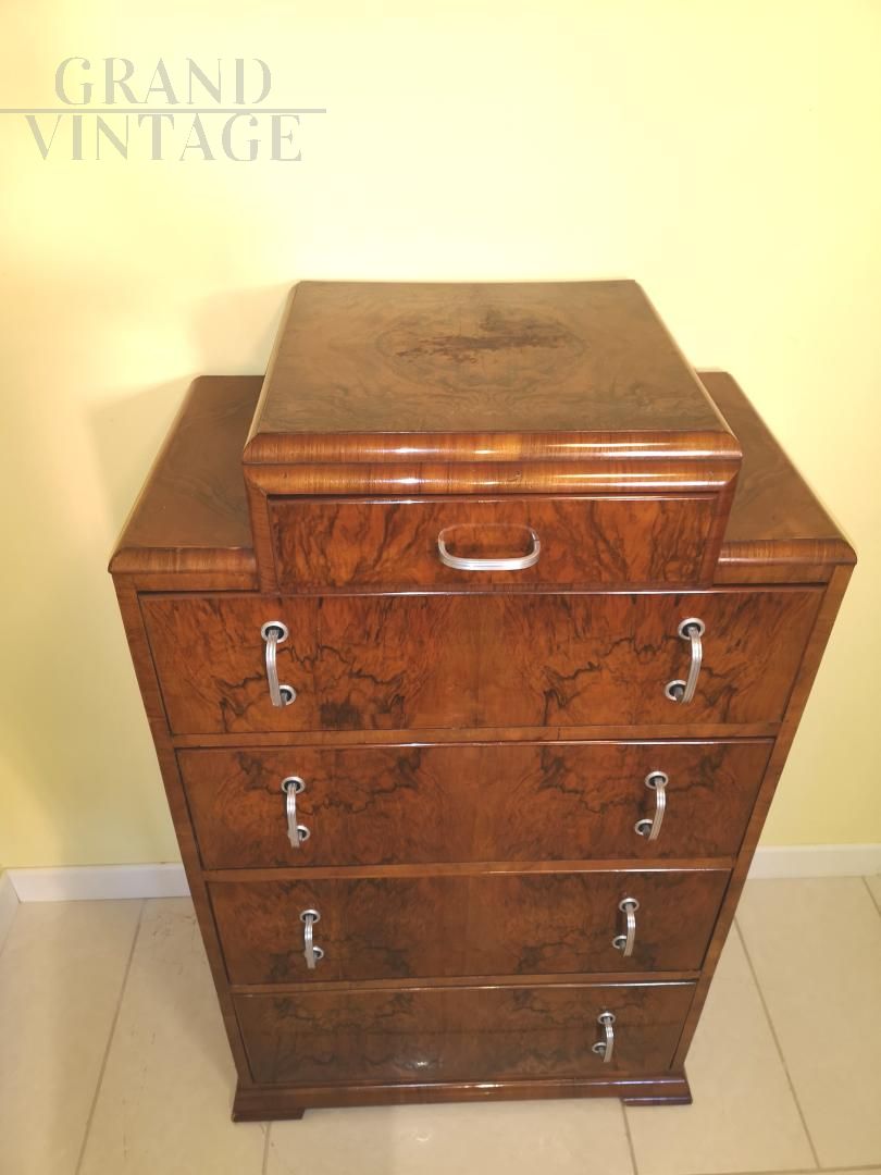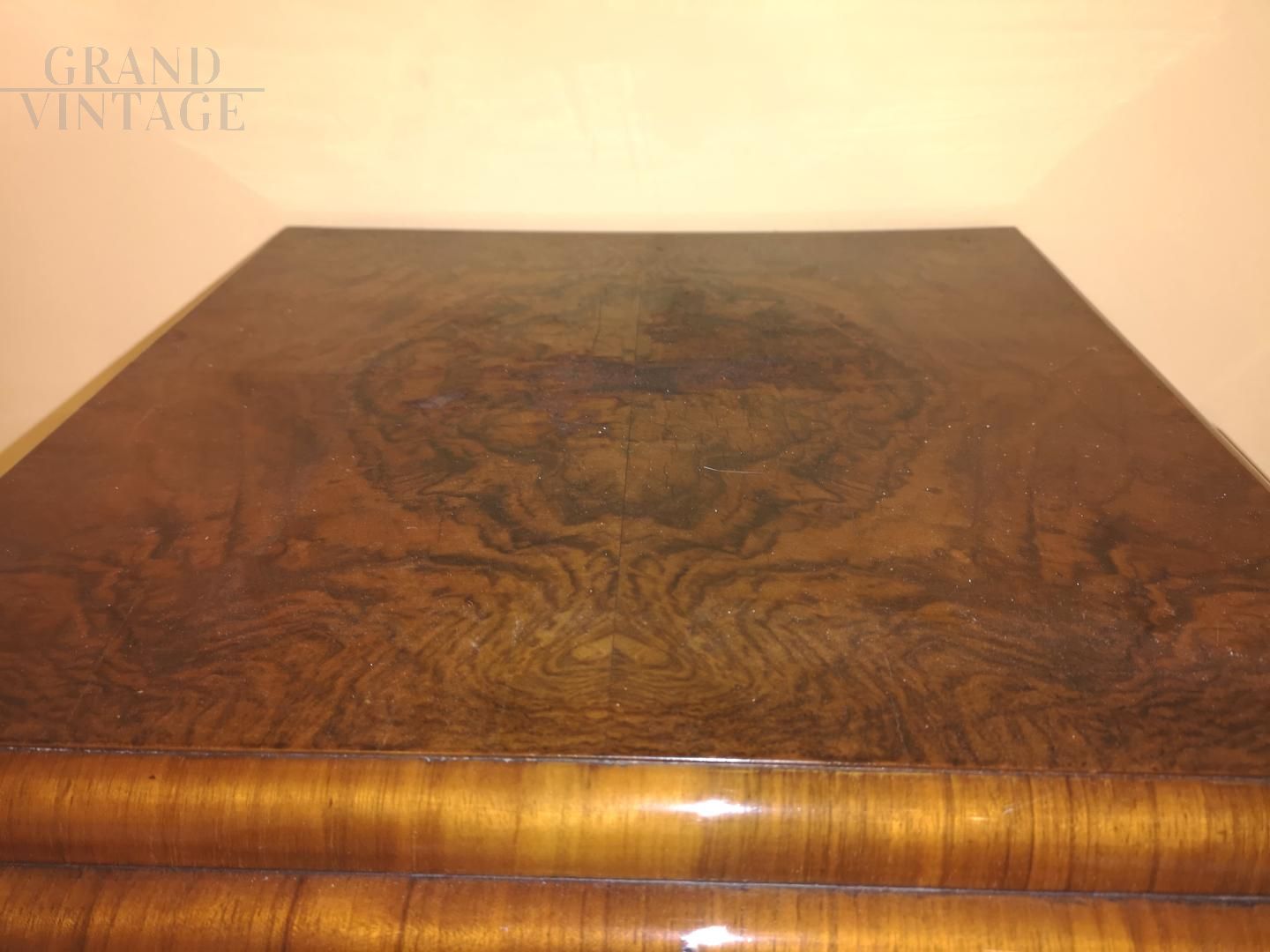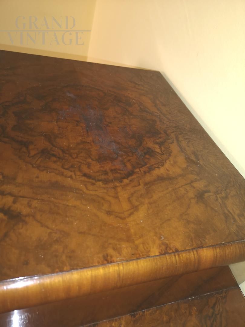 Bellissima cassettiera in radica color miele con ampi cassetti e un piccolo cassetto sulla cima, in ottime condizioni, una maniglia è mancante come da foto.